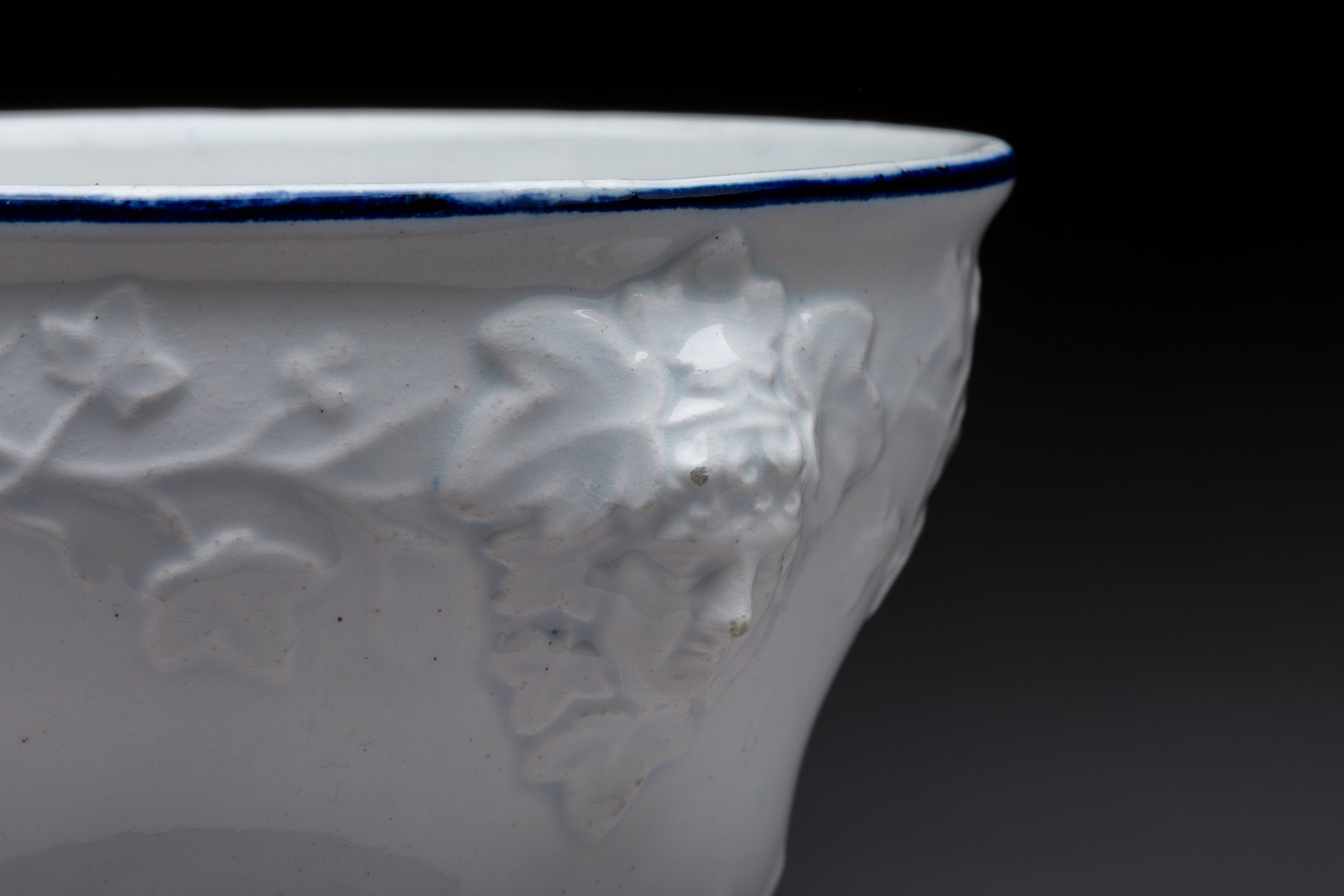en céramique émaillée à décor monochrome blanc aux anses à têtes de mascaron et à décor en camaïeu bleu de scènes villageoises.