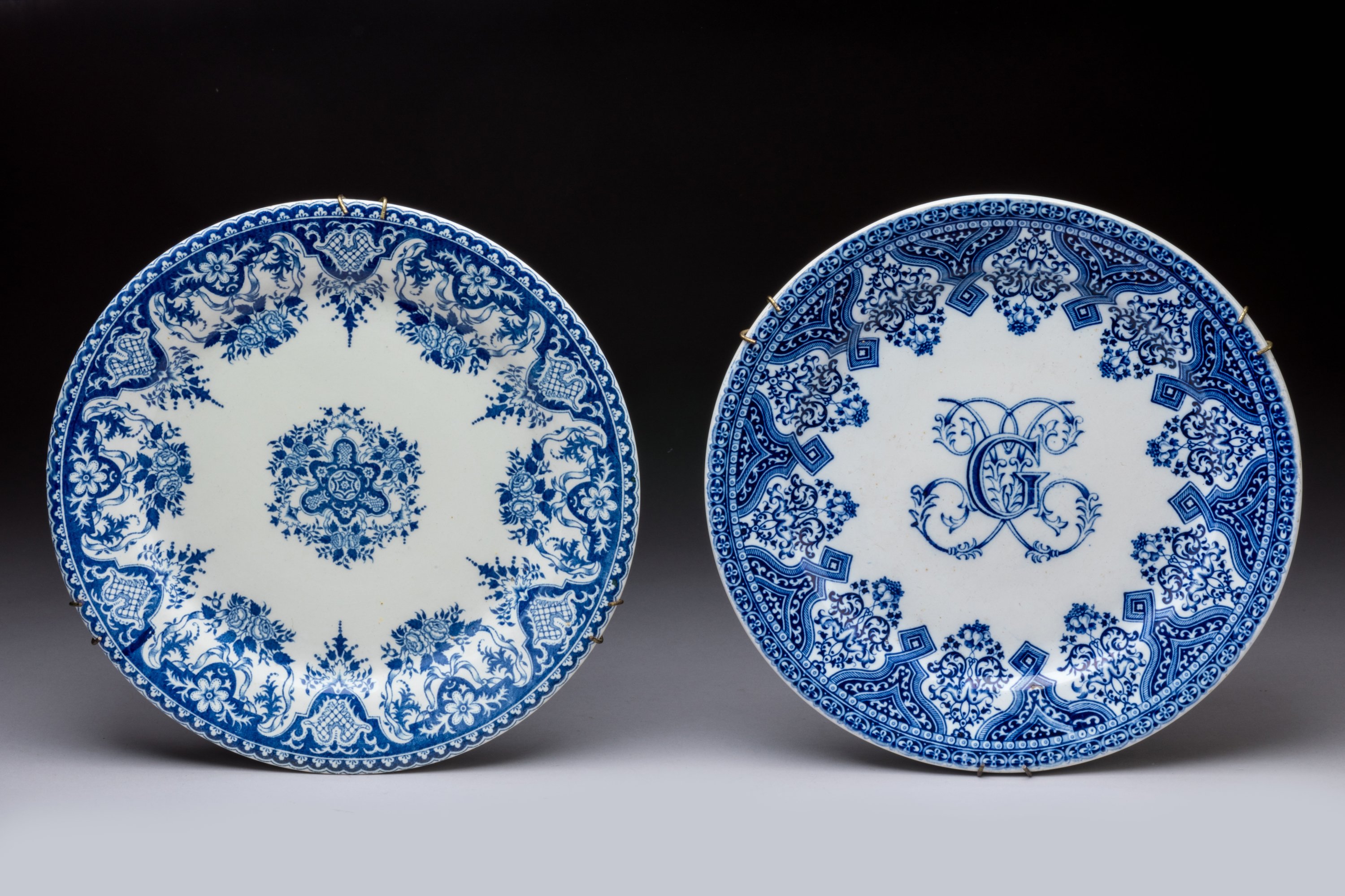 Deux ASSIETTES au décor de bleu de Rouen, l'une chiffrée "G"