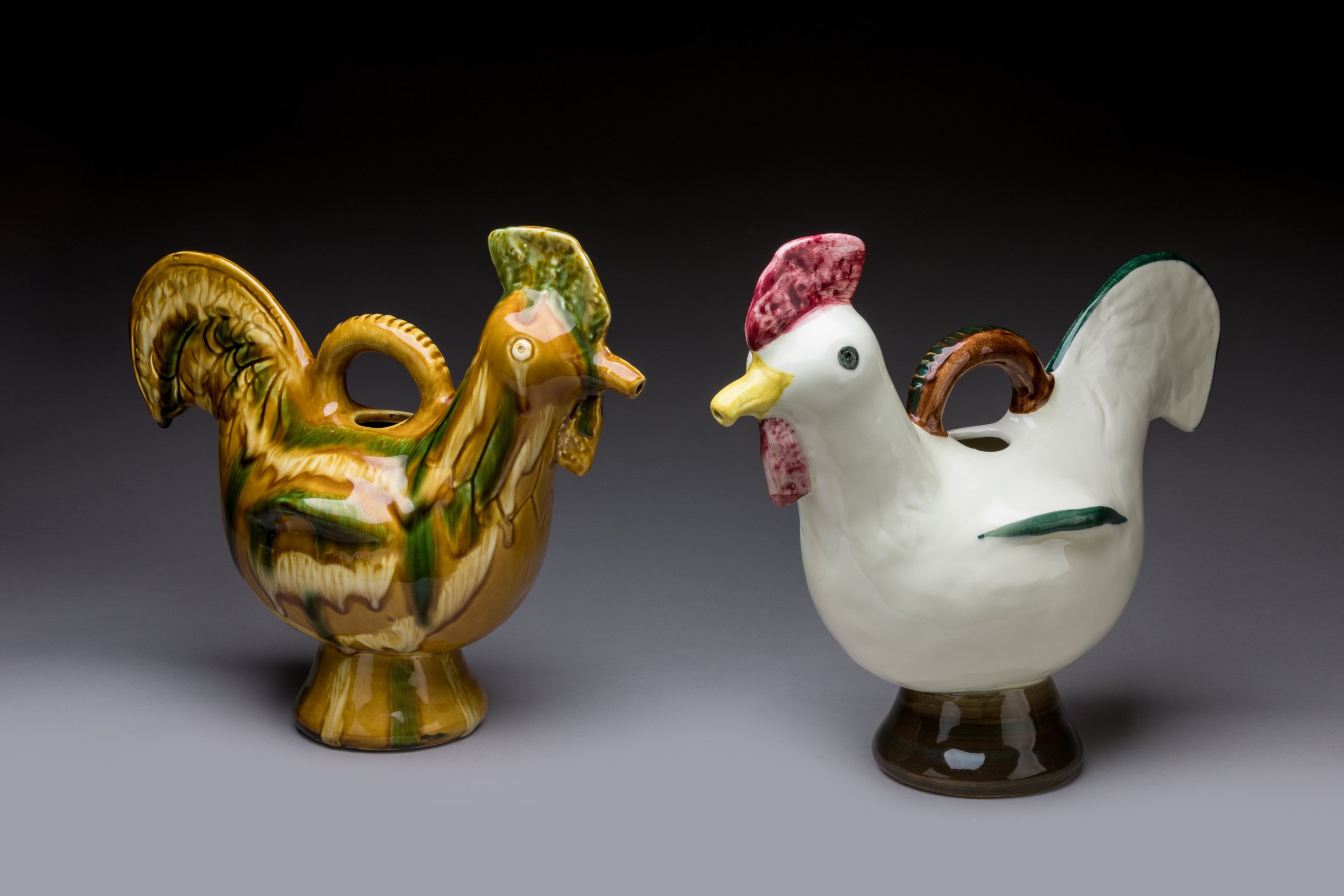 en céramique émaillée, l'un monochrome blanc, l'autre au décor chinois trois couleurs.