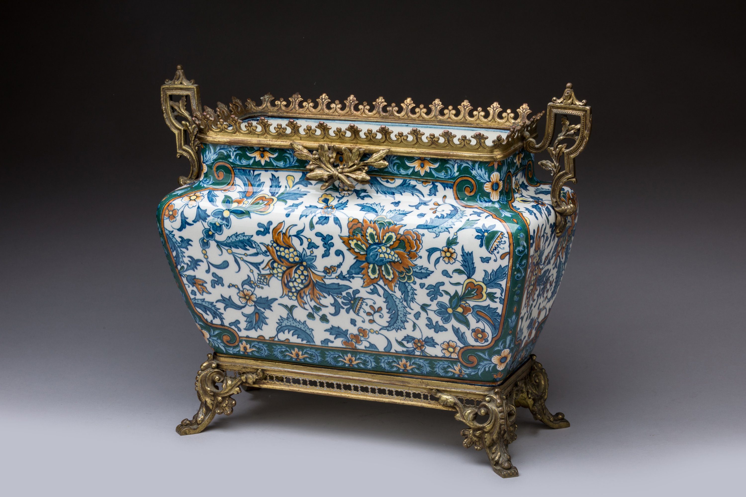 Grande JARDINIÈRE MONTÉEen céramique émaillée de fleurs orientales sur fond...