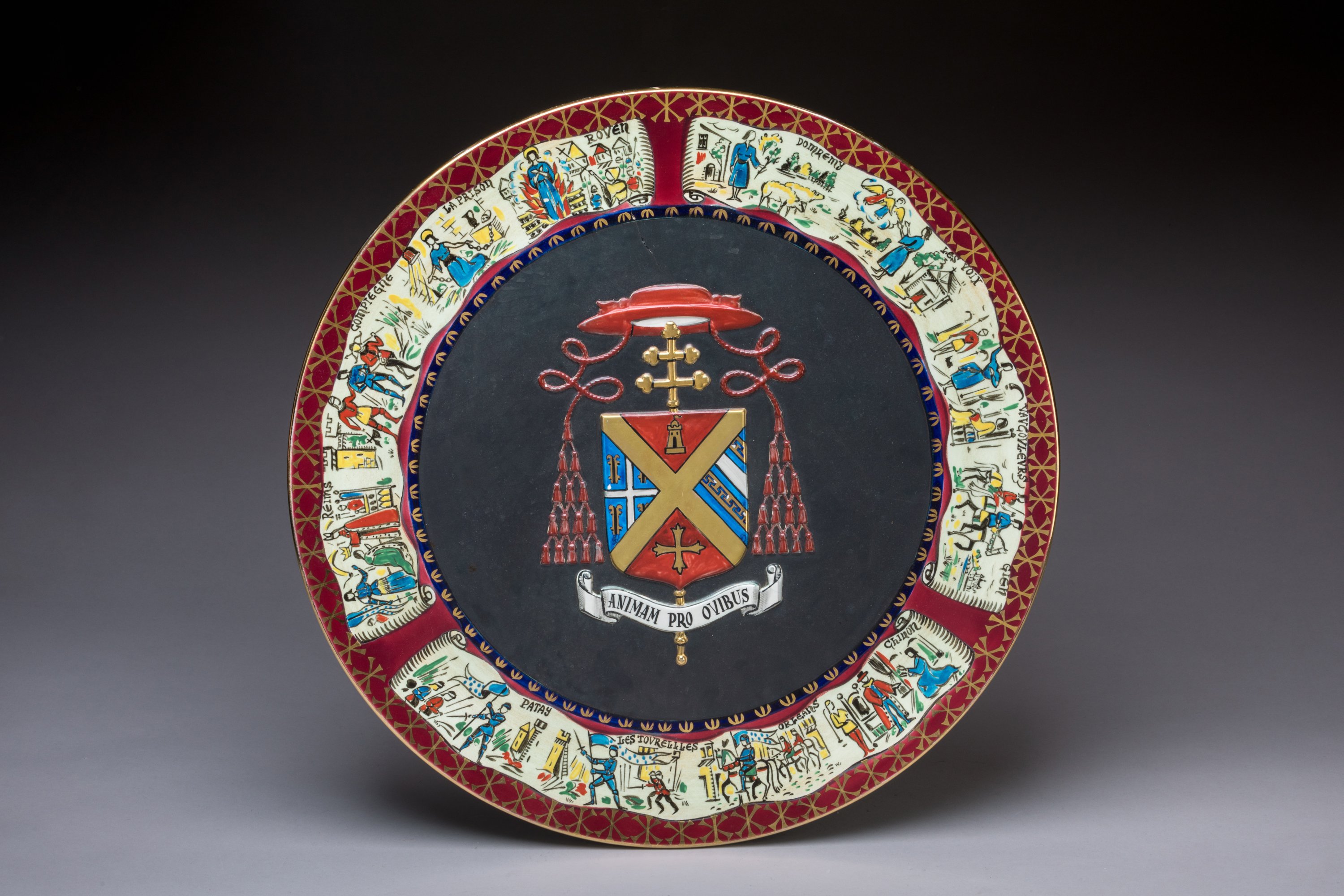 Plat en céramique émaillée au décor peint du chapeau du Cardinal Feltre surmonté d'une croix de Lorraine avec des scènes de la vie de Jeanne d'Arc dans des rouleaux.