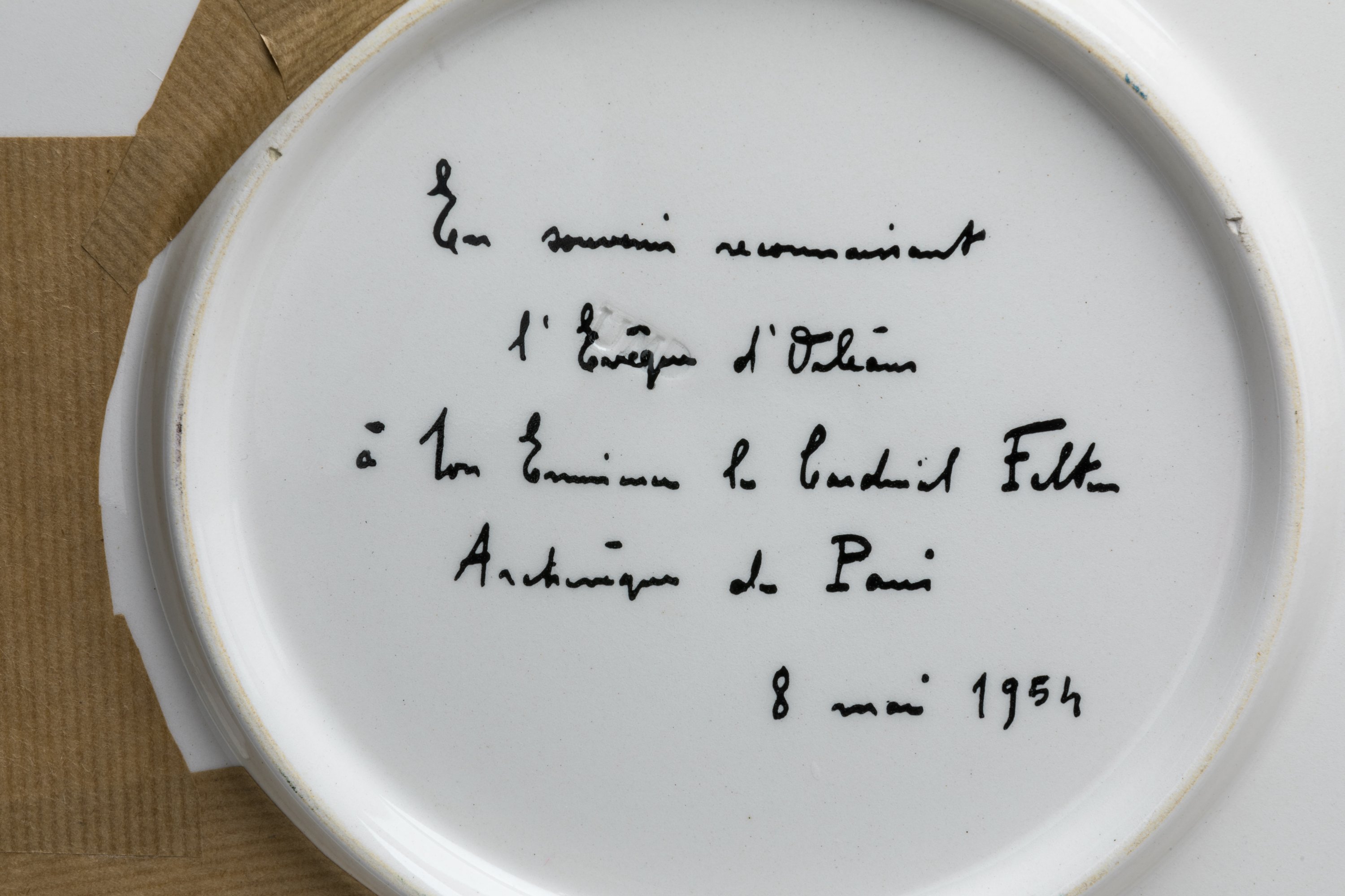 Dédicace au dos "En souvenir reconnaissant l'évêque d'Orléans à son éminence le Cardinal Feltre archevêque de Paris 8 mai 1954". Marque Gien olographe.