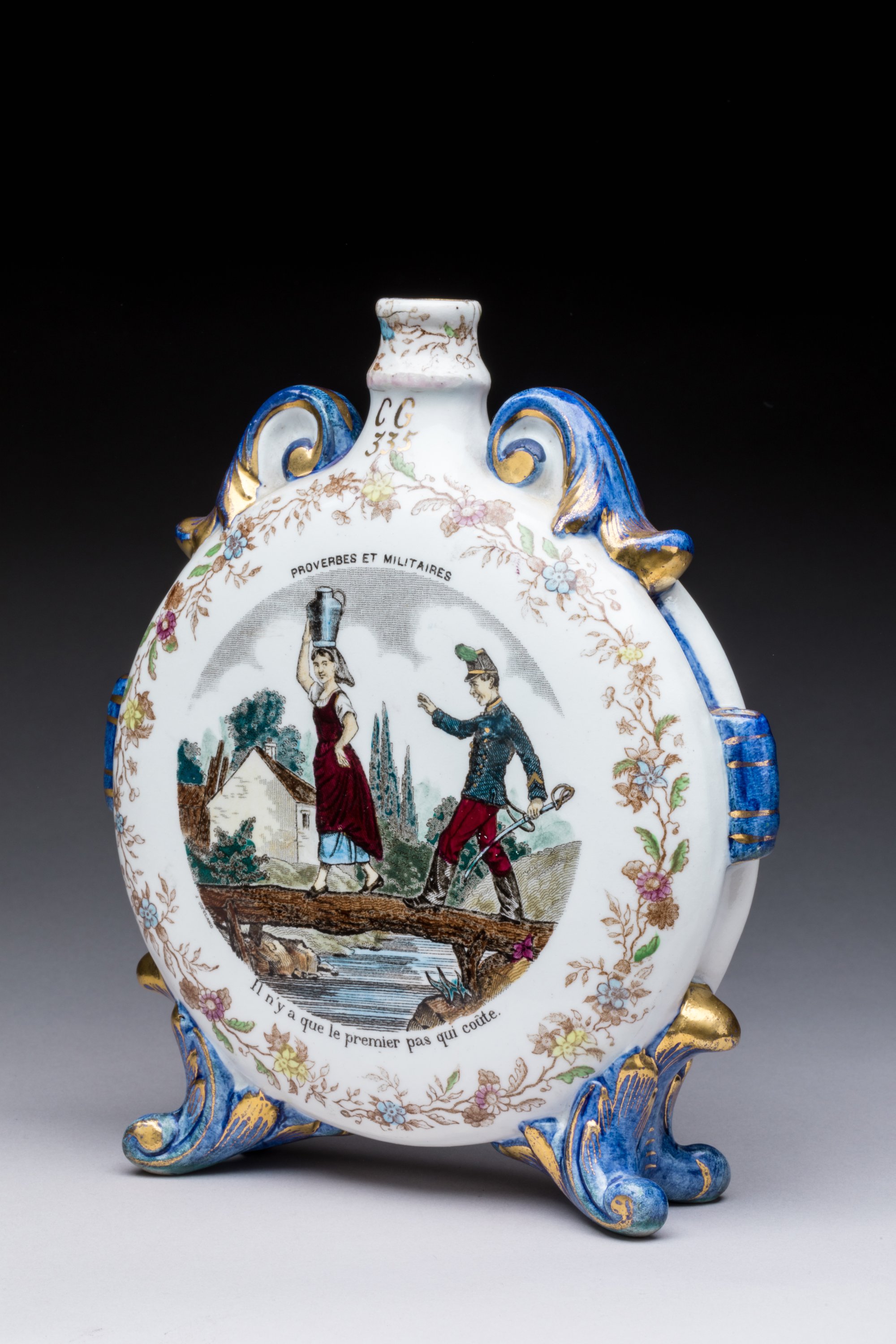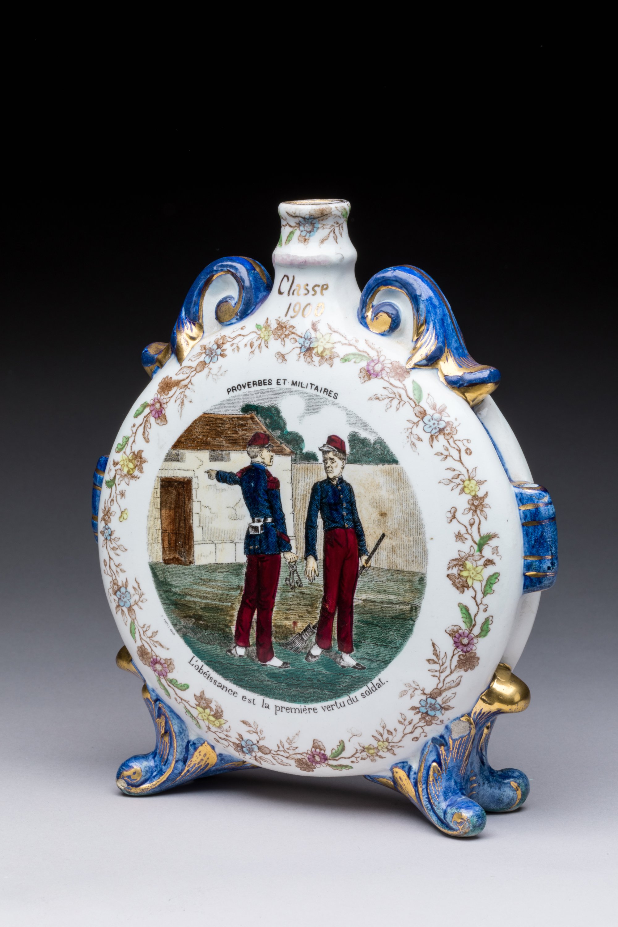 en céramique émaillée au décor en poncif de proverbe militaire, d'après J. COPELAND rehaussée à l'or.