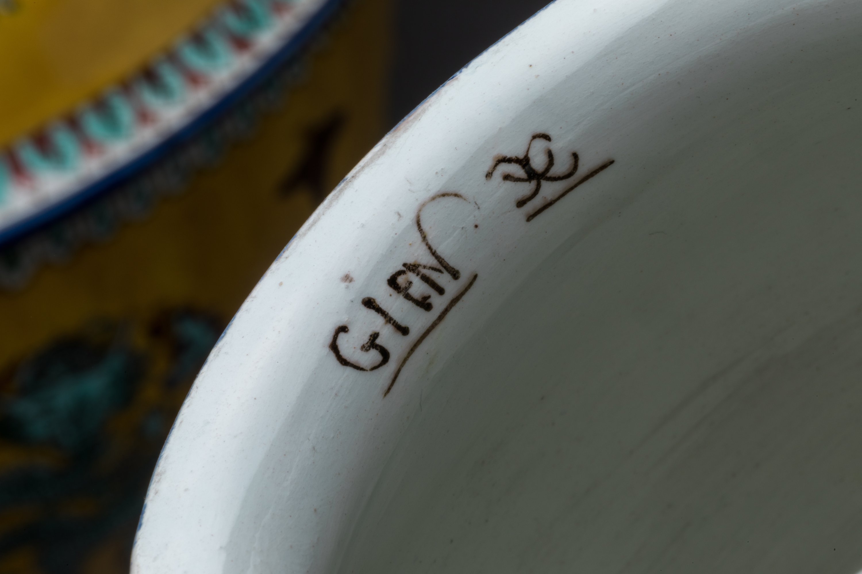 en céramique émaillée à fond jaune avec six dragons émeraudes en cartouches, deux prises à têtes d'éléphant. Le couvercle orné d'un magot assis en fretel et six dragons en médaillons. Le socle tripode ajouré du même décor.