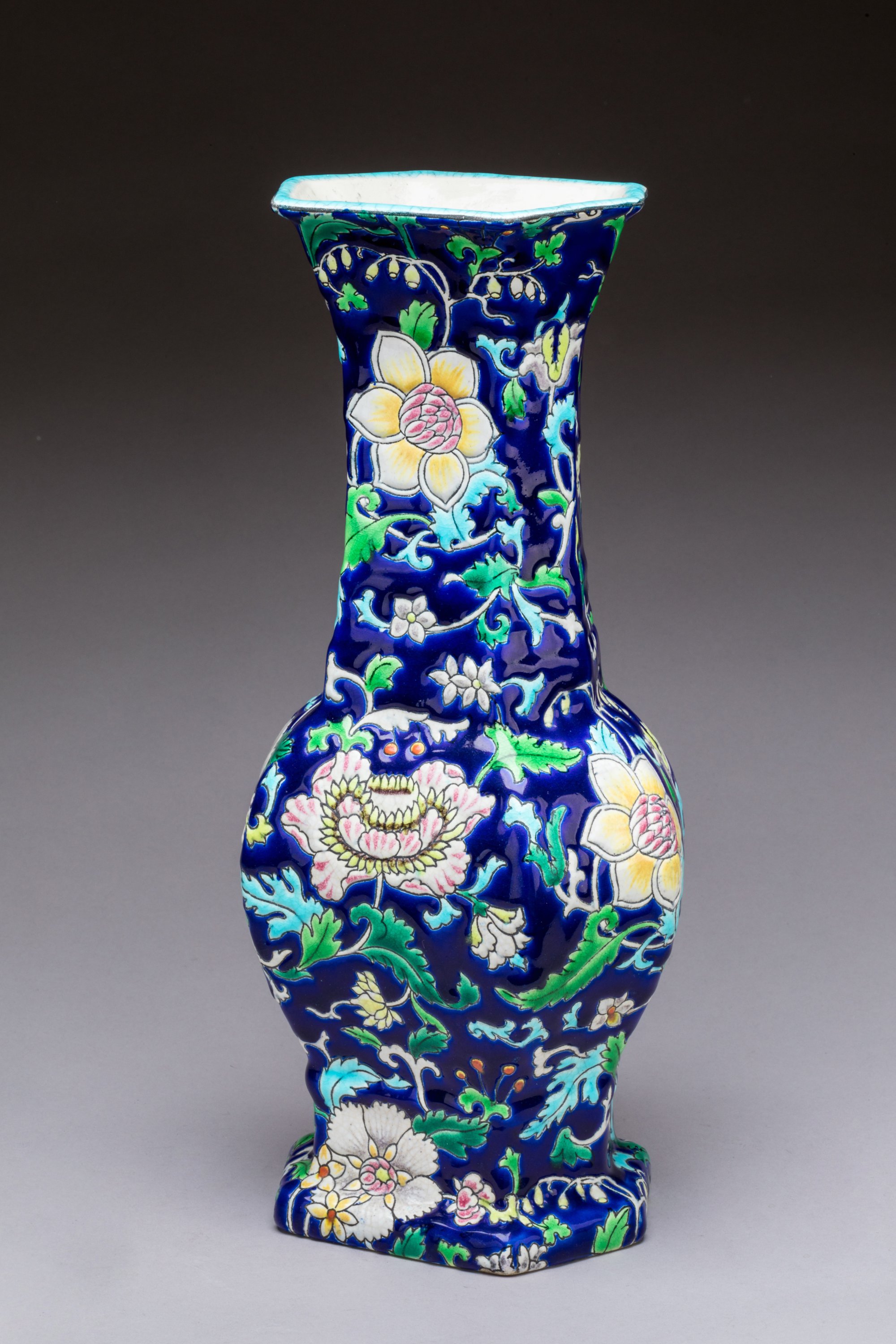 en céramique émaillée dite de Longwy de fleurs sur fond fleuris.