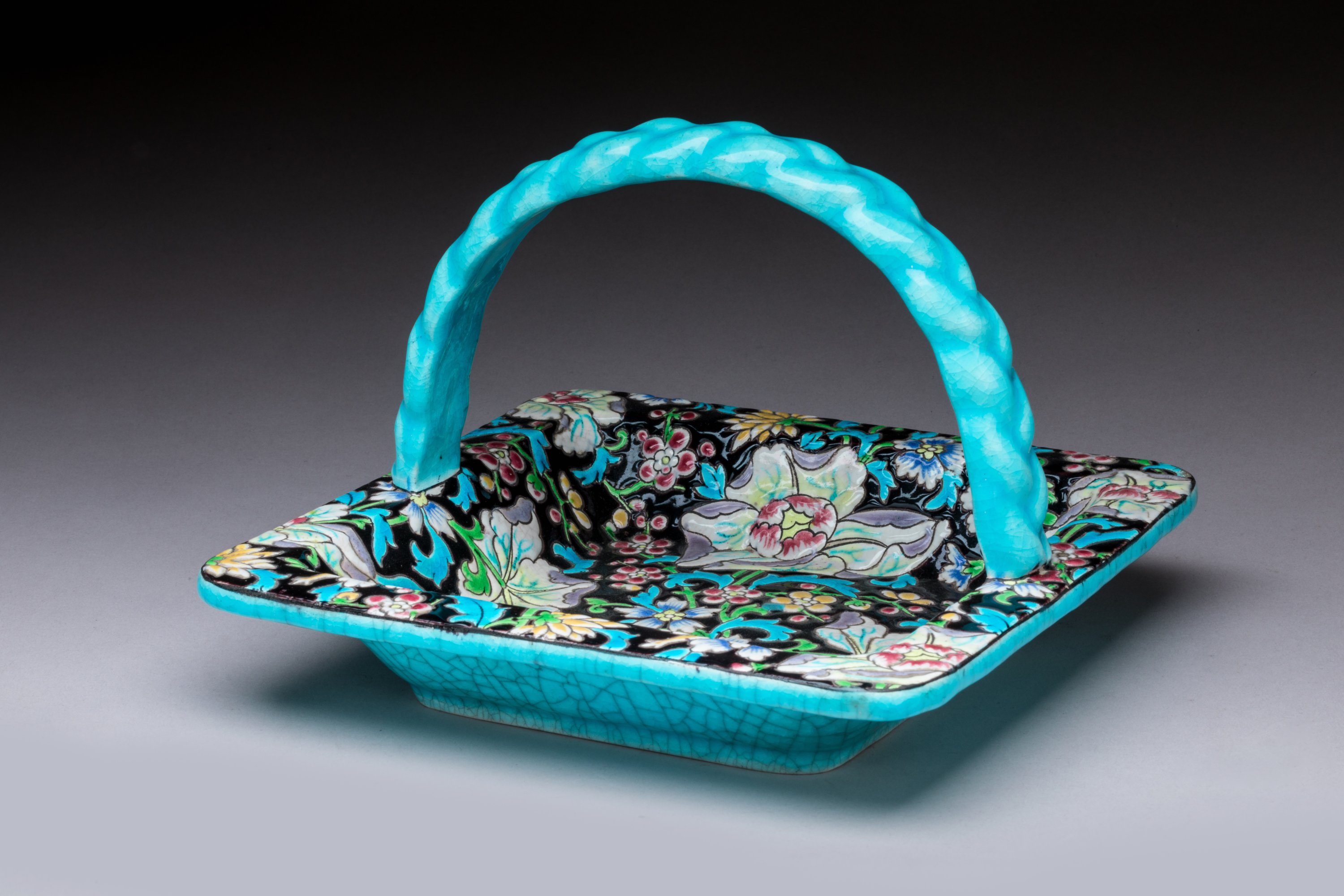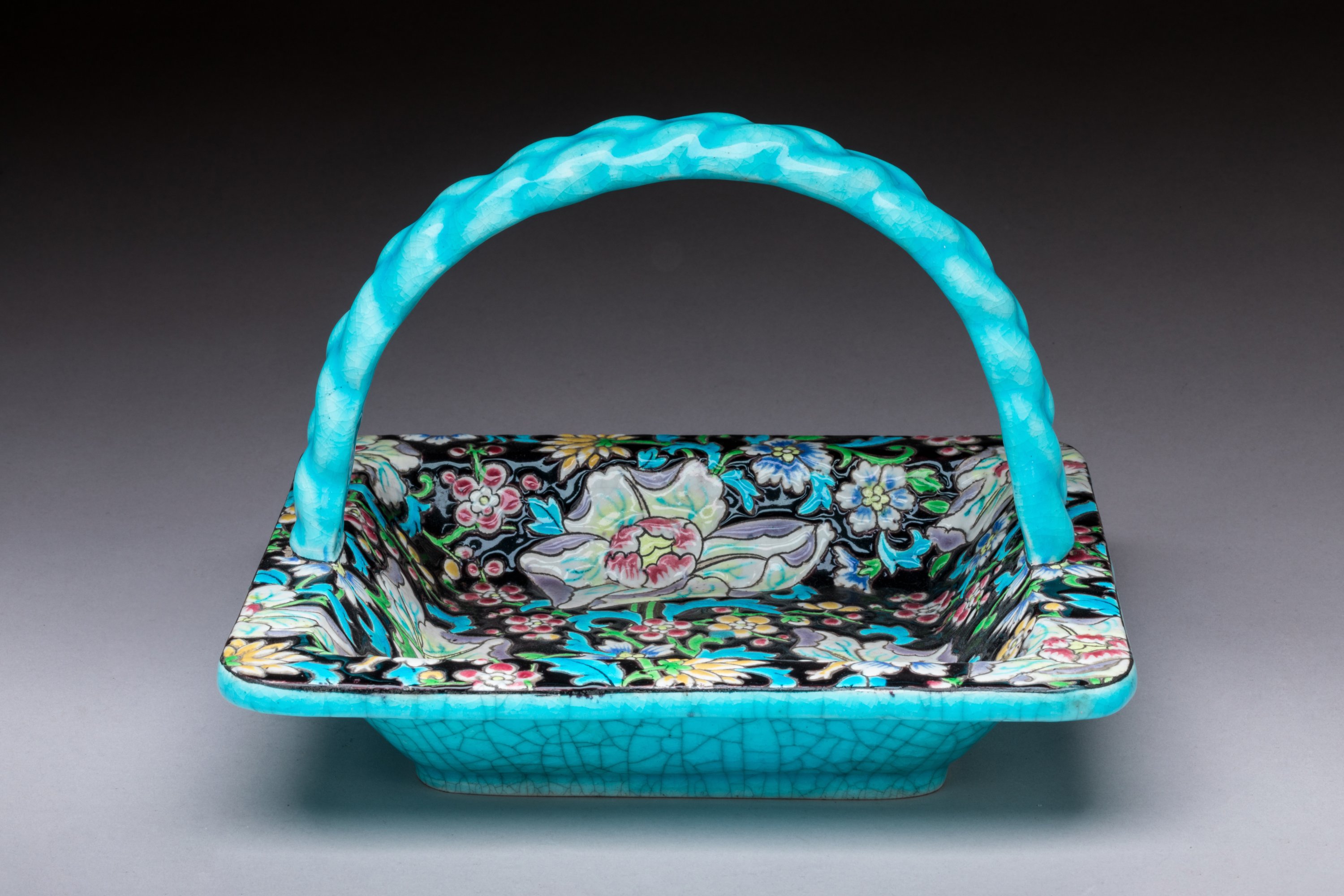 Petit PANIER à anses torsadées en céramique émaillée du même décor. Marque de Gien 1875-1934. Haut. 13 Coté. 19,5 cm.