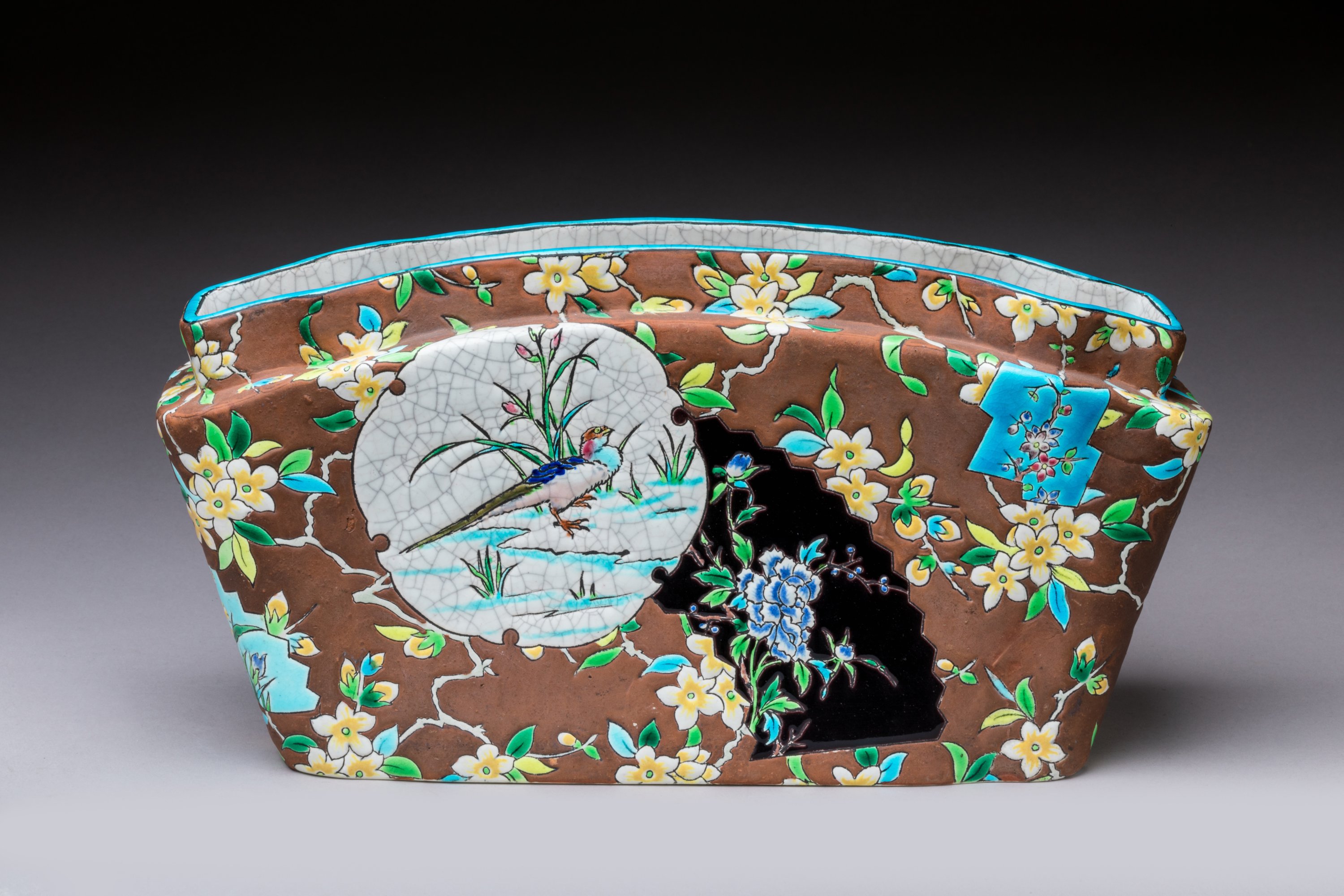 en céramique émaillée dite de Longwy à fonds chocolat à décor d'oiseaux dans des cartouches.