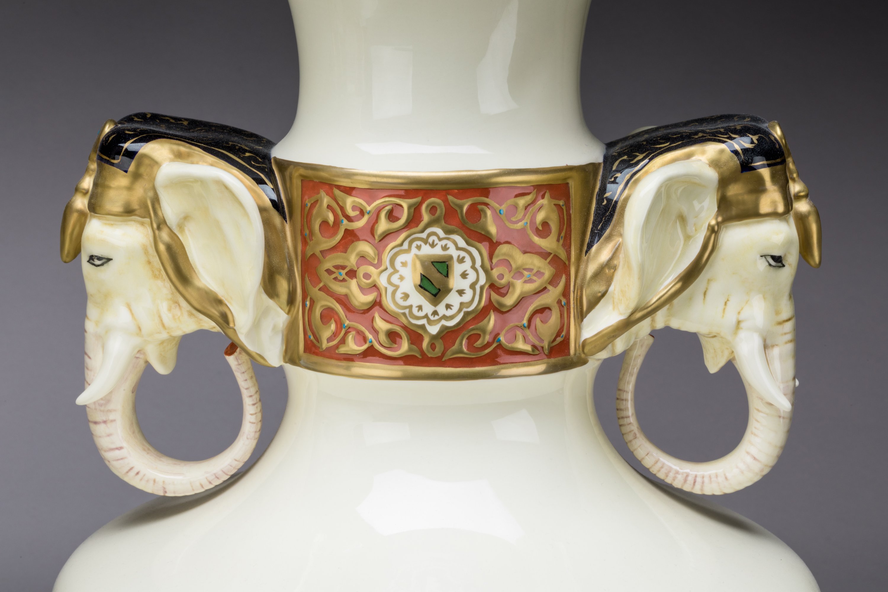 en céramique émaillée à fond maïs, émaux polychromes, têtes de pachyderme appliquées en ronde bosse et rehaut d'or.