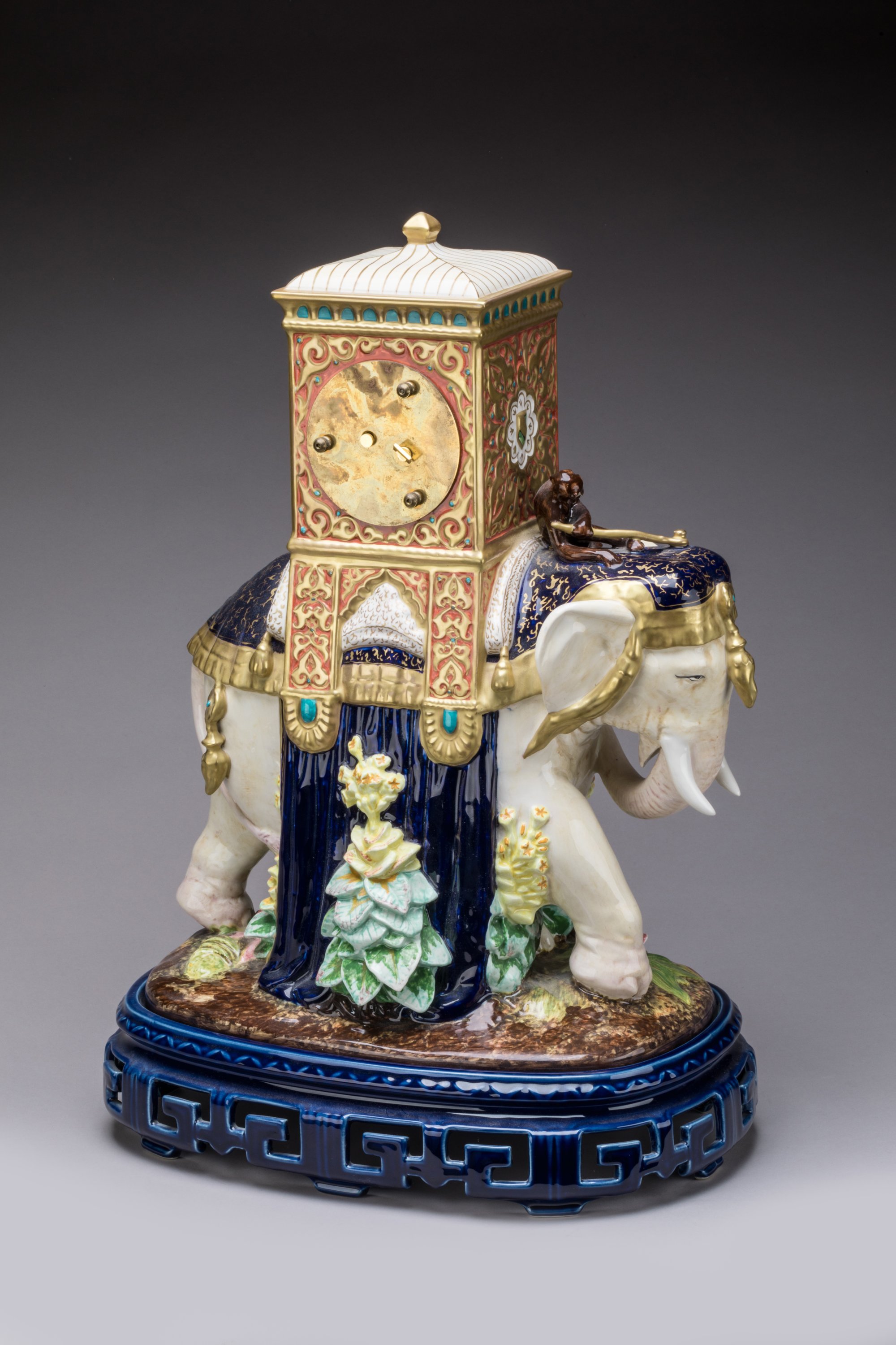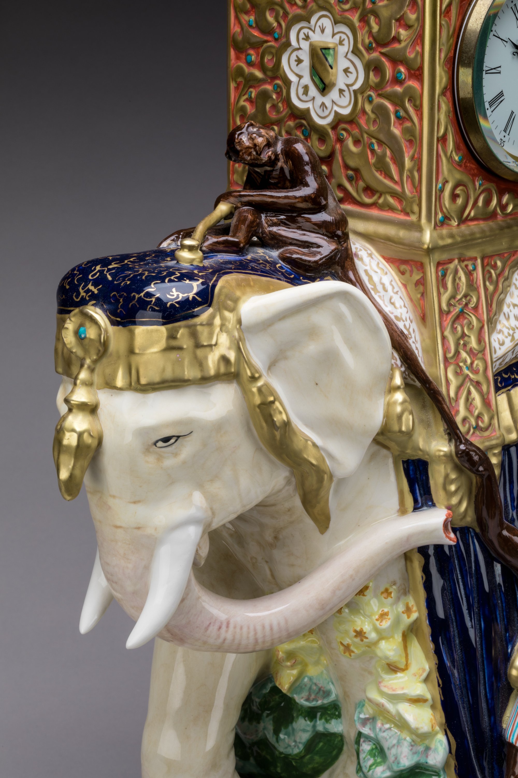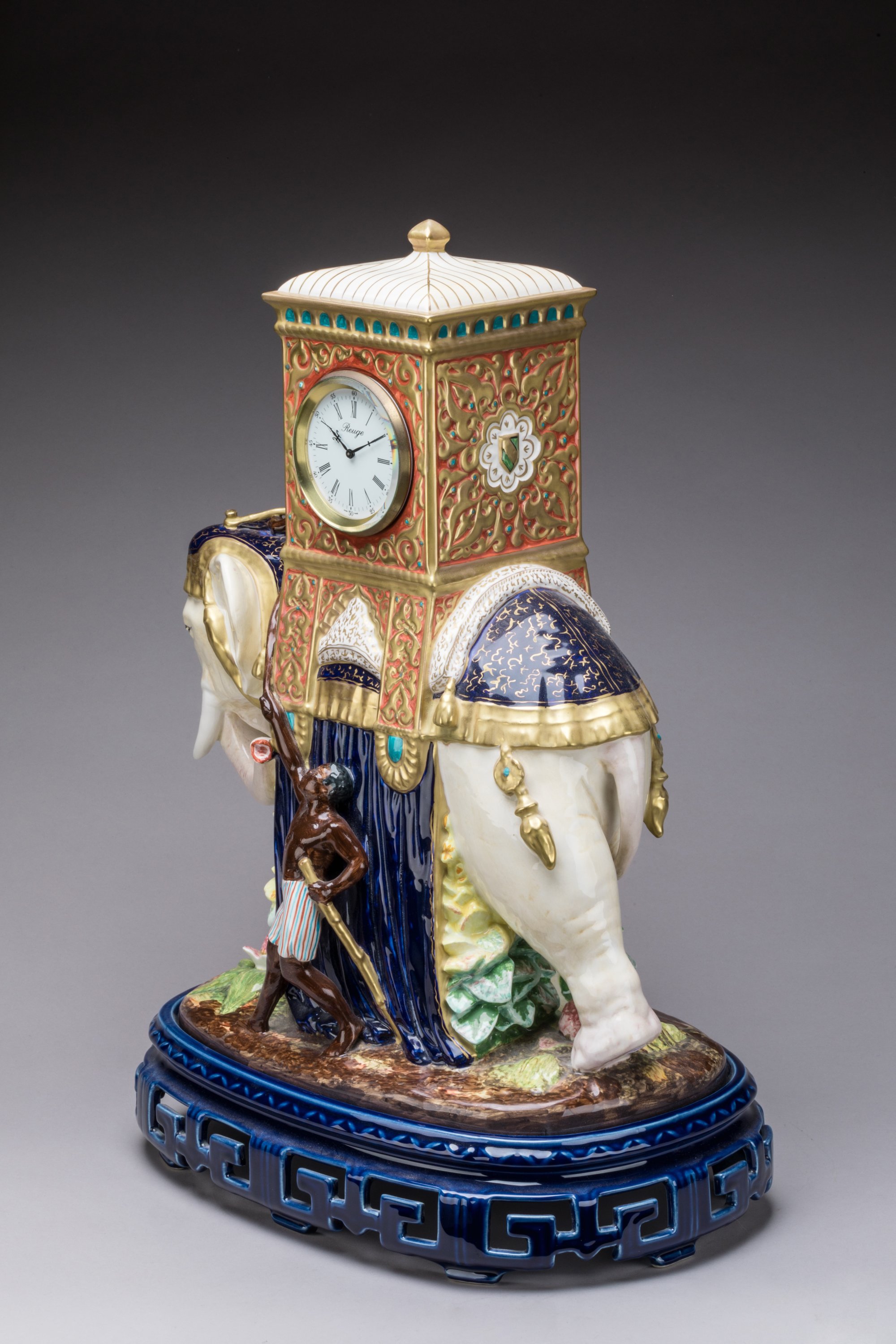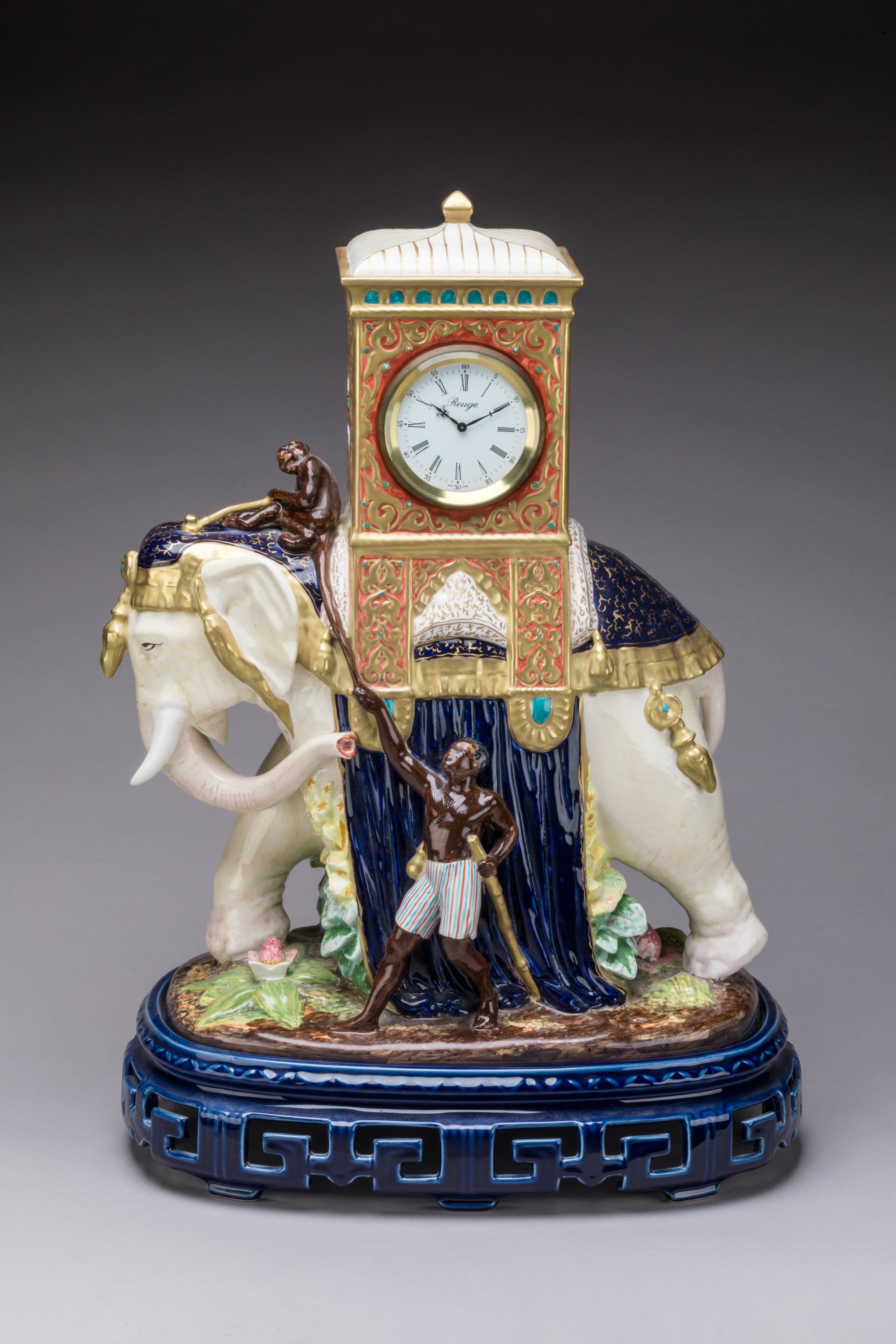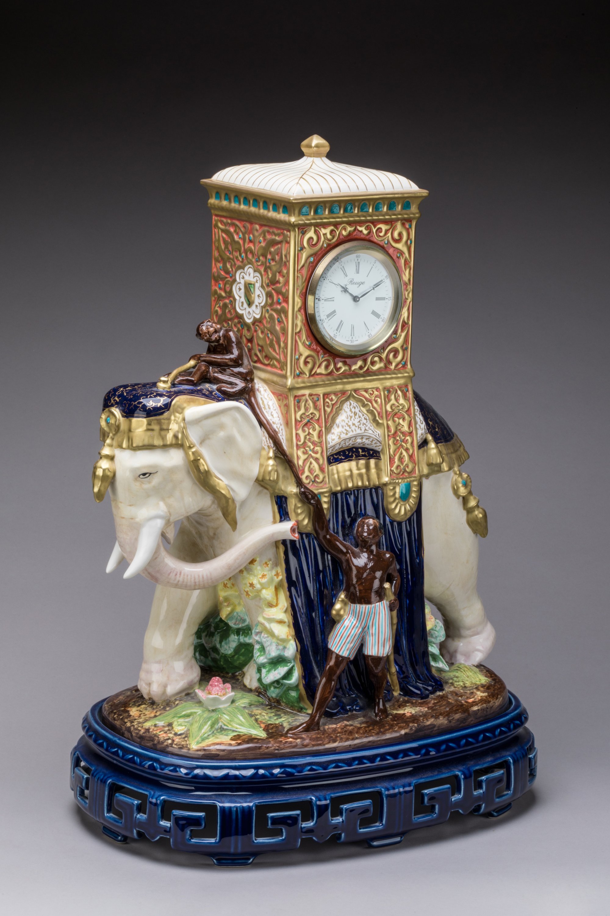 en céramique émaillée. Le cadran incrusté dans un palanquin doré posé sur le dos de l'animal, conduit par un singe avec un palefrenier nubien.