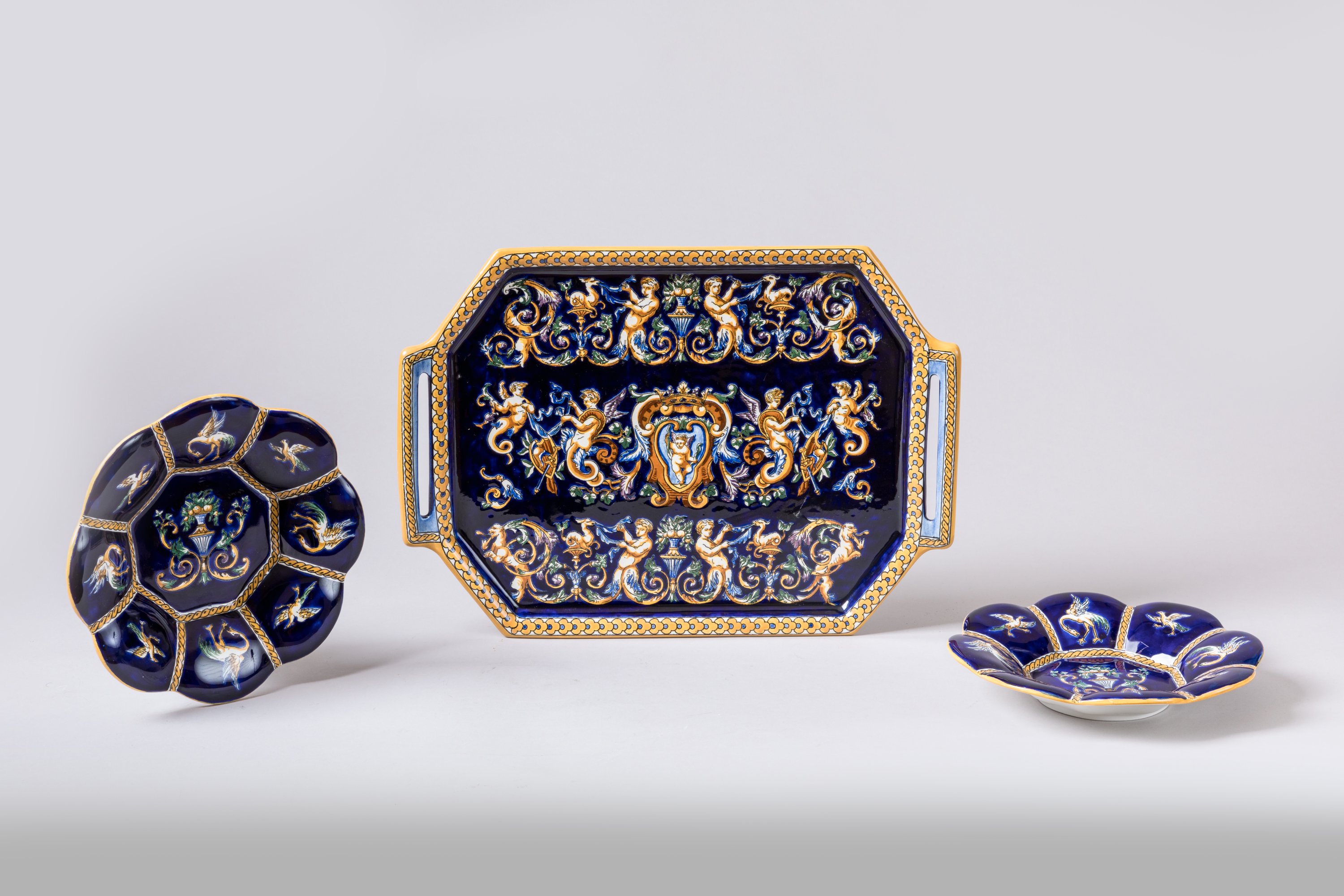 en céramique émaillée à décor de la Renaissance sur fond bleu.