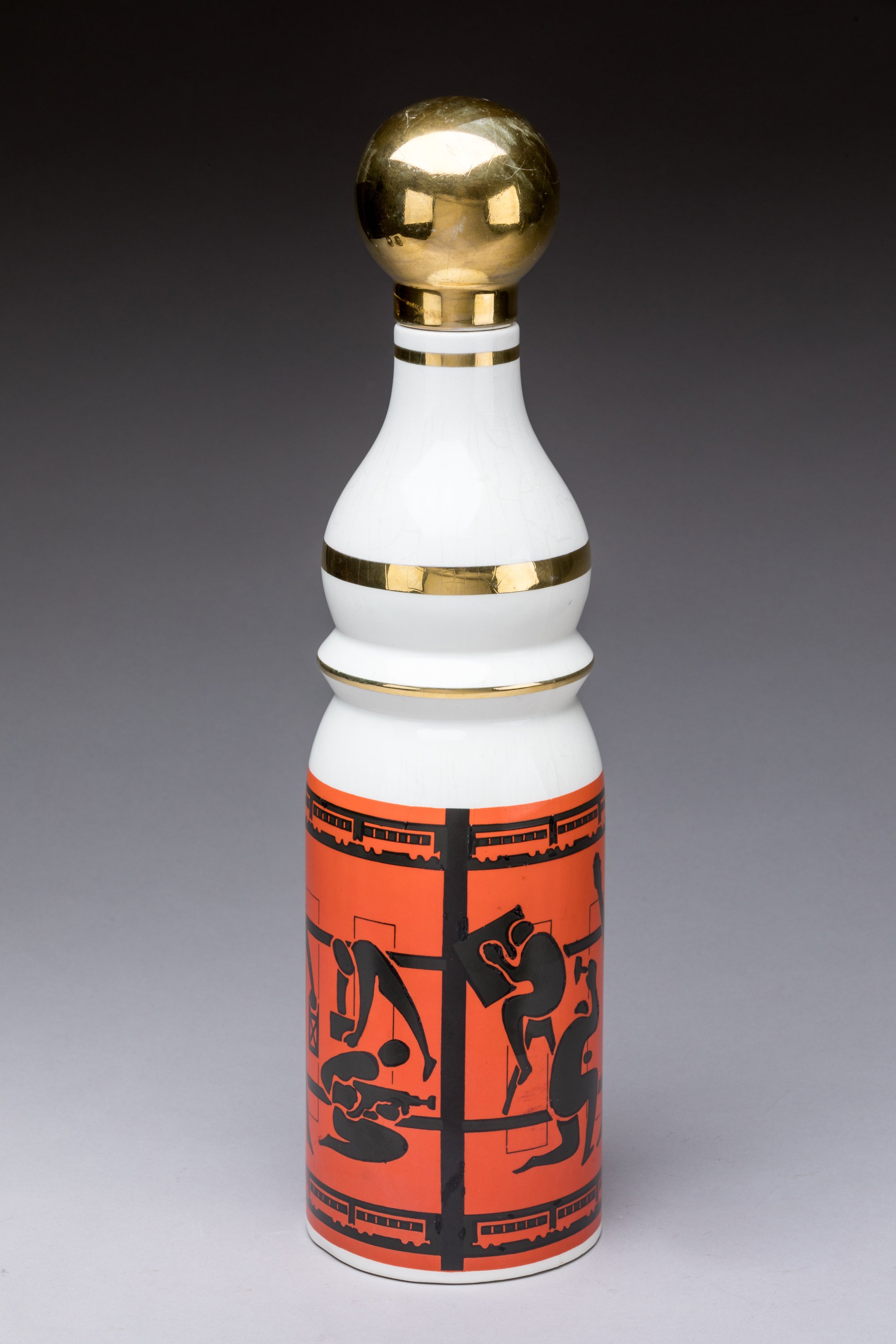 Superbe BOUTEILLE QUILLE de la S.N.C.Fen céramique émaillée blanche ornée...