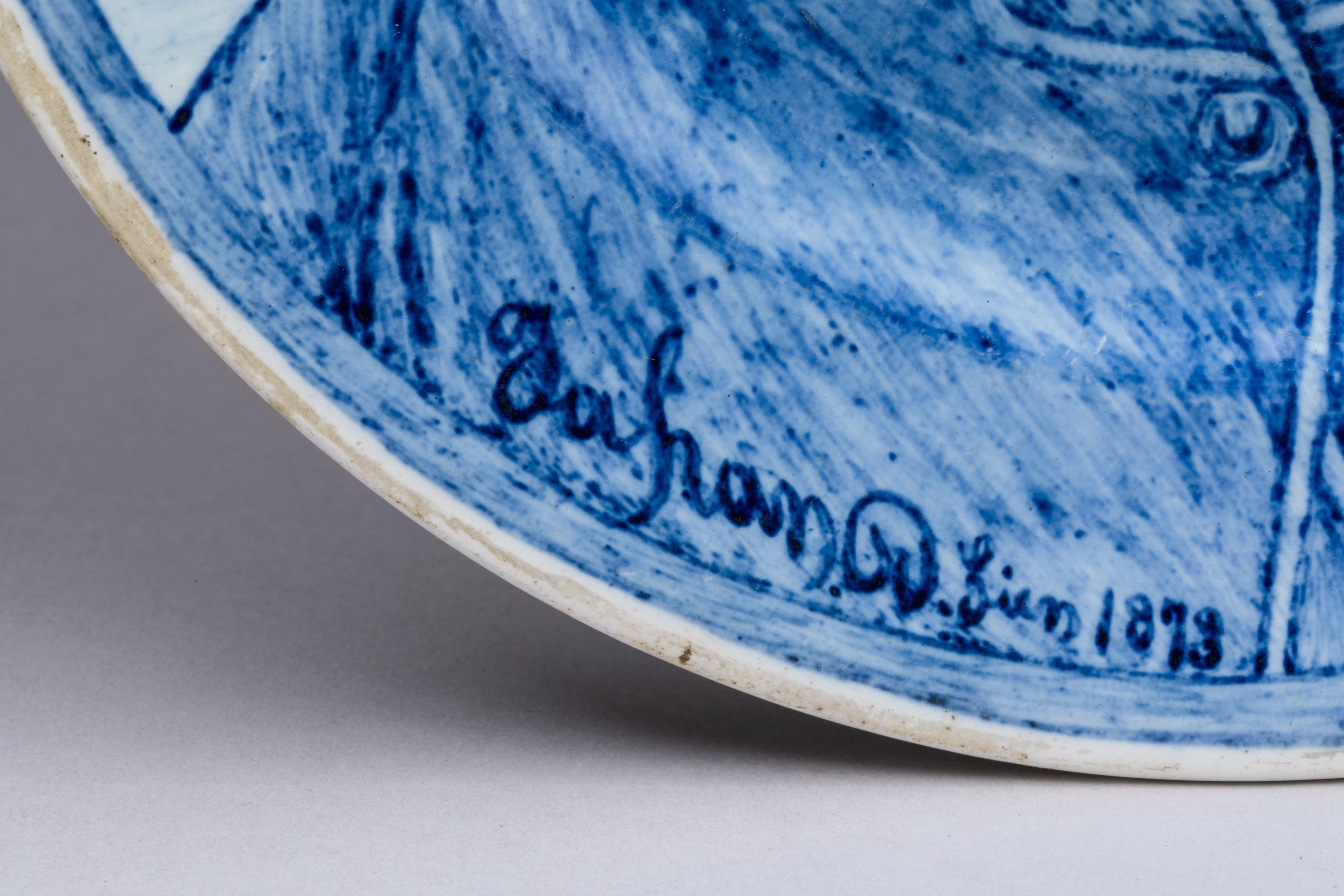 Assiette portrait en céramique émaillée figurant le prince lorsqu'il vint à la faïencerie chercher le service qu'il avait commandé. Signature dans le décor, datée 1873 et située Gien. Titrée au dos.
