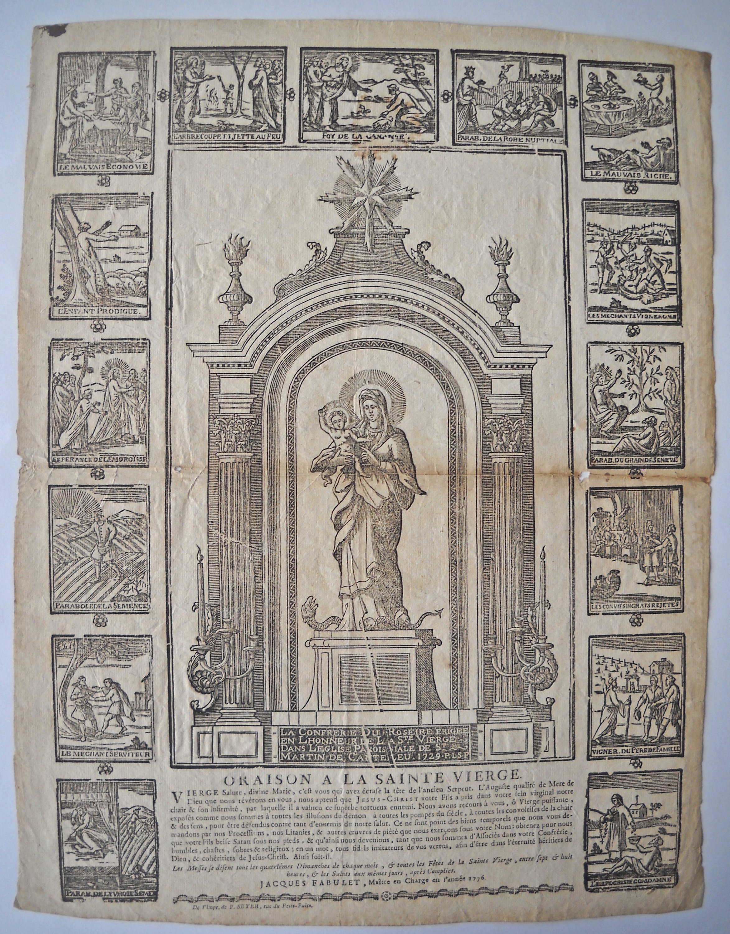 5 épreuves, gravures sur bois, sur papier vergé, placées sous passe-partout: Image de confrérie " du Roseire en l'honneur de la Sainte Vierge ", " De l'impr. de P. SEYER, rue du Petis-Puits ", ca 1776, 44 x 33 cm (rest. et petits manques) - Image de confrérie " en l'honneur du SAINT SACREMENT, de la Sainte Vierge et de Saint Michel ", " Rouen, Imprimerie de C. BLOQUEL