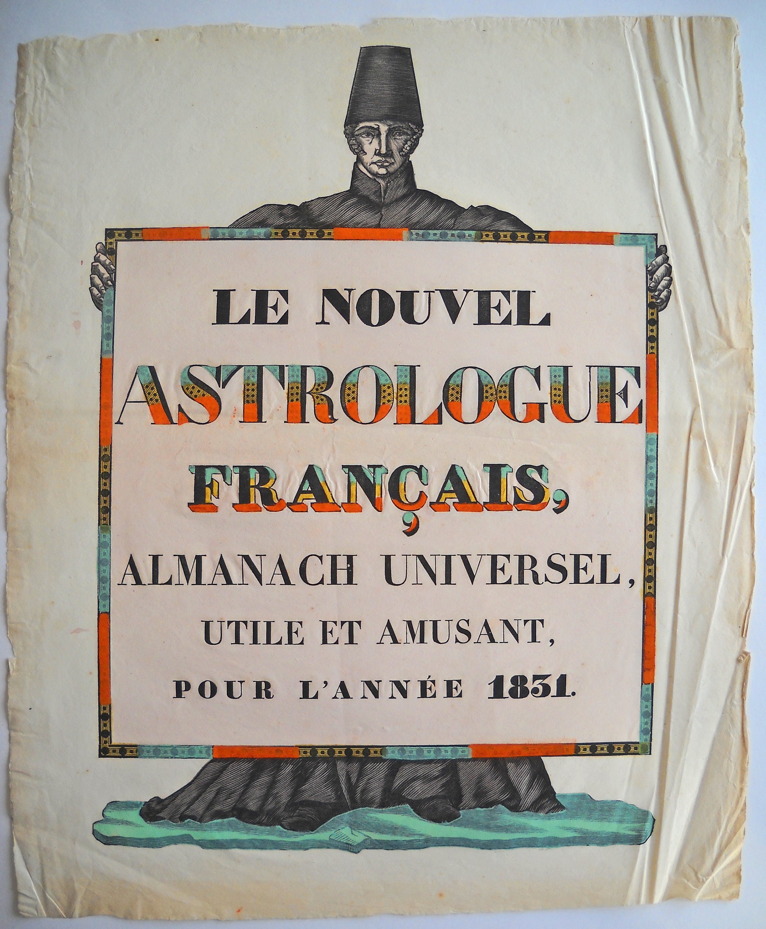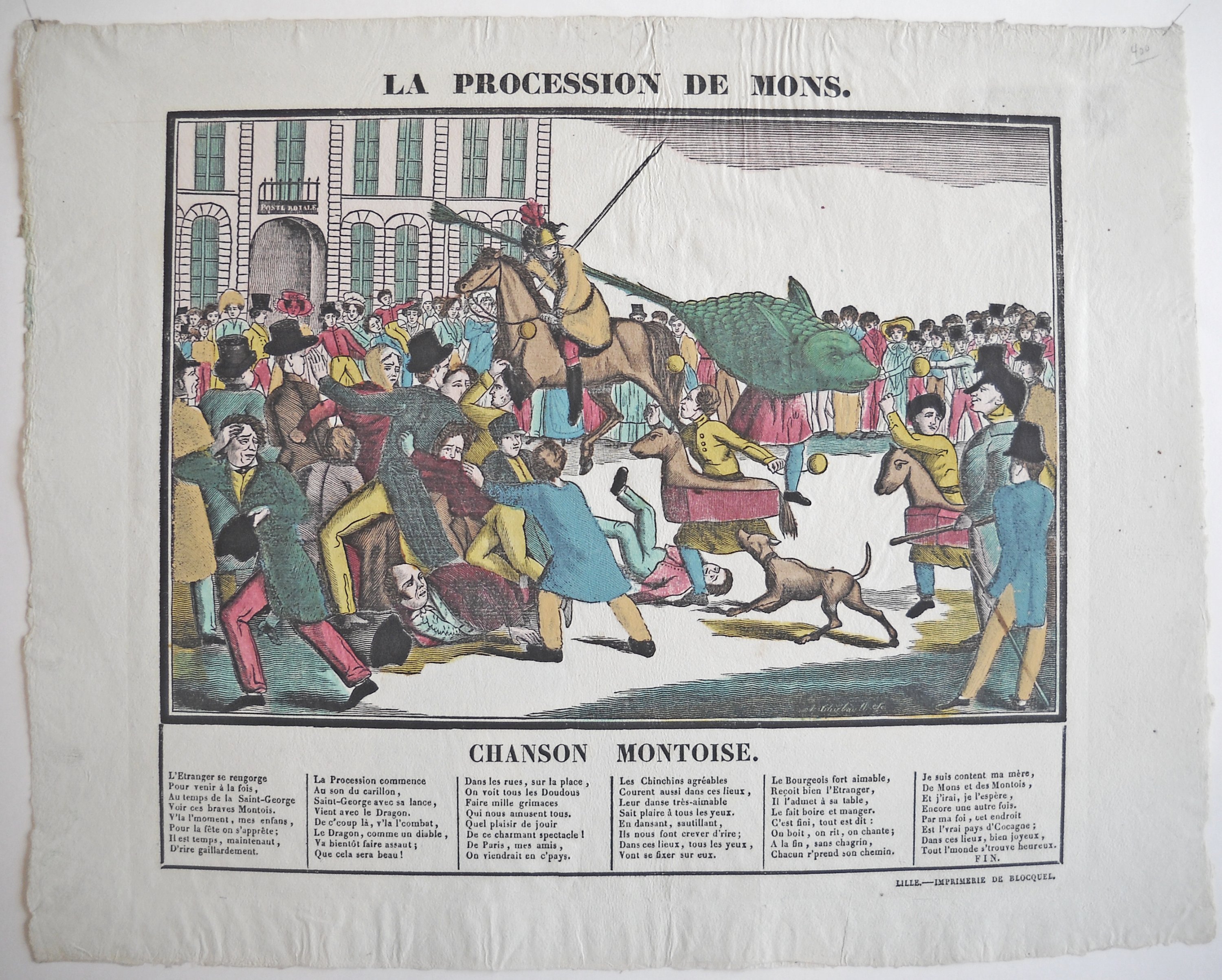 4 épreuves, gravures sur bois, coloris d'époque, dont 3 sur papier vergé crème ou azuré, dont 2 placées sous passe-partout: " LA PROCESSION DE MONS, CHANSON MONTOISE ", 30,5 x 38 cm (plis) - " Vie de Michel Morin ", 27 x 42 cm - " GAYANT ET SA FAMILLE ", 26 x 43 cm - " LE NOUVEL ASTROLOGUE FRANÇAIS, ALMANACH UNIVERSEL, UTILE ET AMUSANT, POUR L'ANNÉE 1831 ", affichette, [imprimée chez Castiaux à Lille], 53,5 x 44 cm (plis), rare exemplaire.