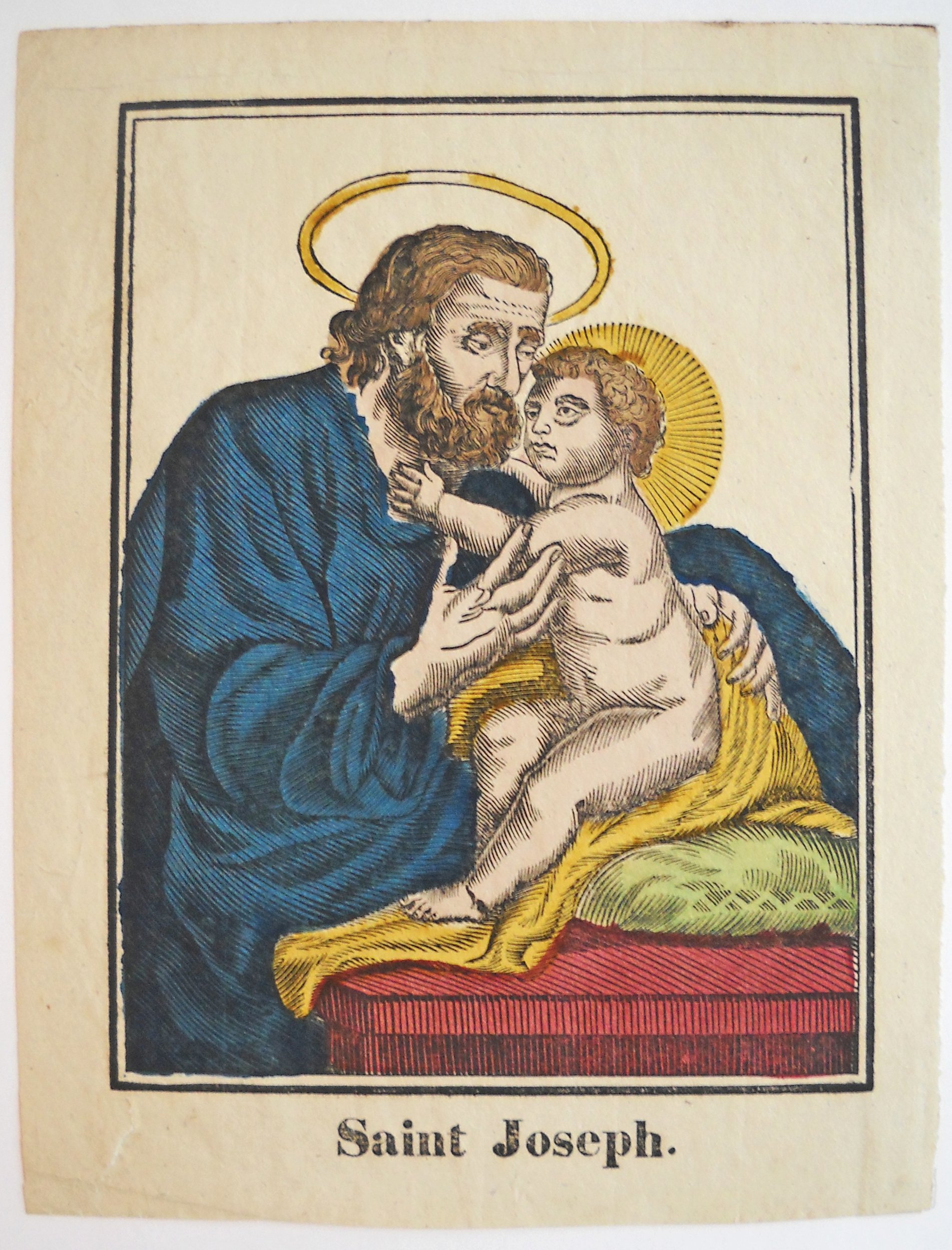 27 épreuves, gravures sur bois, coloris d'époque, sur papier vergé crème, en majorité placées sous passe-partout ou contrecollées sur carton. Planches à compartiments de sujets religieux. Formats divers.