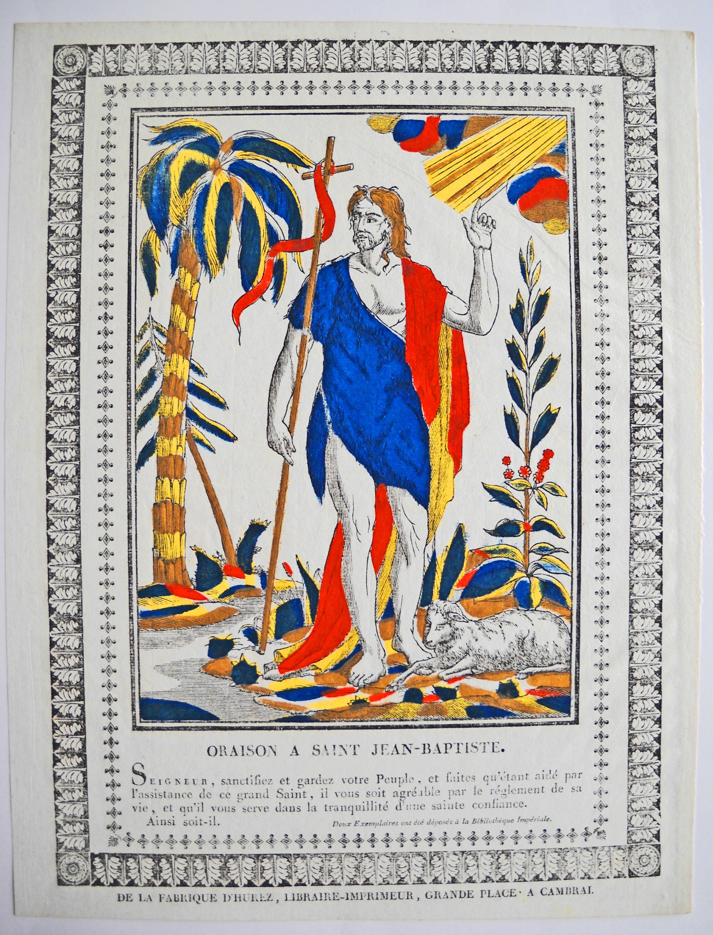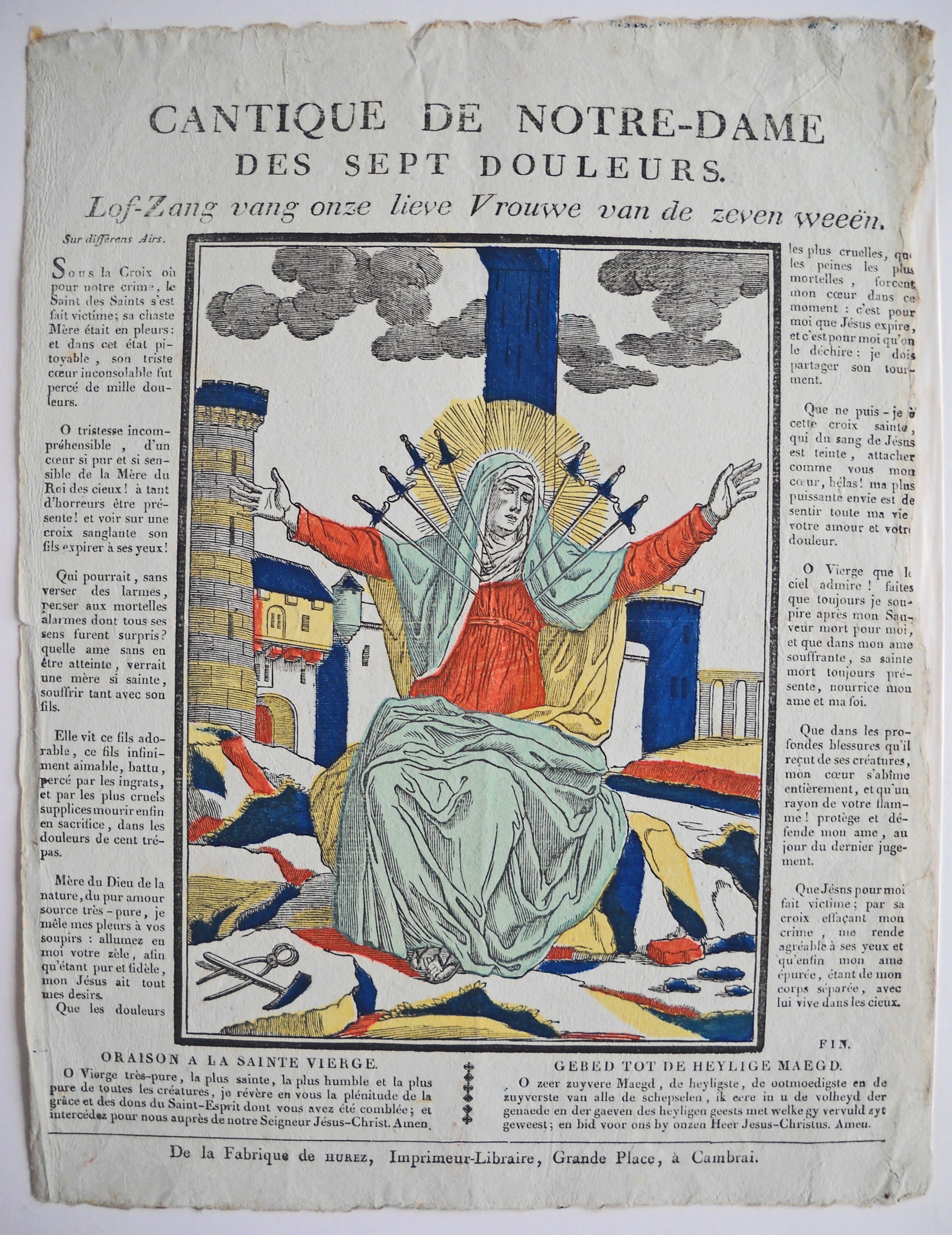 4 épreuves, sujets bibliques, gravures sur bois, coloris d'époque, sur papier vergé crème ou azuré, placées sous passe-partout: " ORAISON A SAINT JEAN-BAPTISTE " (légers plis). - " ORAISON TRES-DEVOTE A SAINT JACQUES " - " CANTIQUE DE NOTRE-DAME DES SEPT DOULEURS ", avec légende bilingue en Flamand (léger pli médian, manques) - Planche à compartiments (2 x 2). Env. 39 x 30 cm.