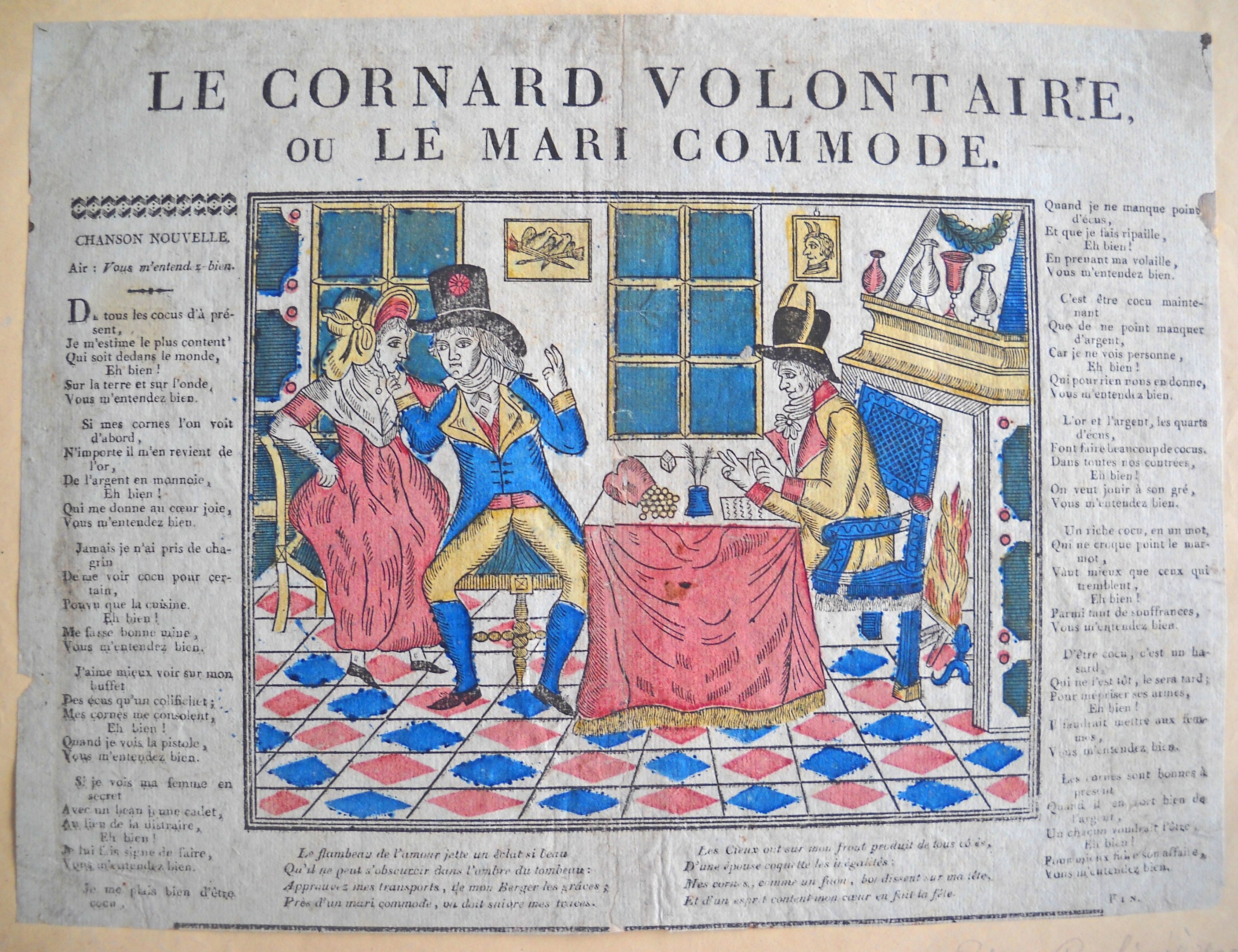 3 épreuves, gravures sur bois dont 2 aux coloris d'époque, sur papier vergé crème ou azuré: " SAINTE CLOTILDE, REINE DE FRANCE ", placée sous passe-partout, 39,5 x 29,5 cm (plis, tâches) - " LE CORNARD VOLONTAIRE, OU LE MARI COMMODE ", contrecollée sur feuillet, 27 x 35,5 cm (en l'état) - " SERMON EN PROVERBES, tant va la cruche à l'eau qu'enfin elle se casse ", 44 x 33,5 cm (plis, rousseurs).