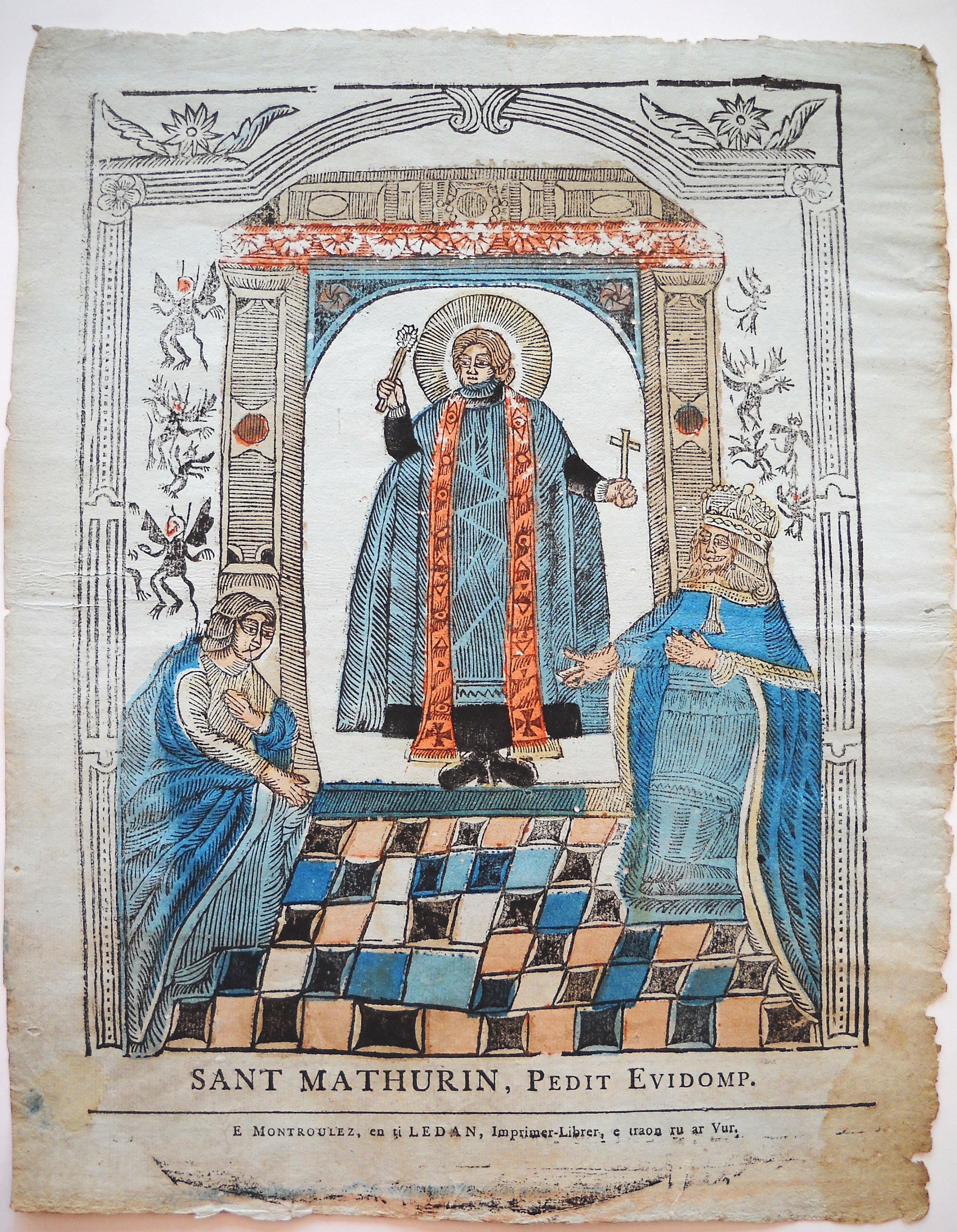 5 épreuves, gravures sur bois, dont 4 sur papier vergé: " ST FRANCOISE: CE FAIT ", coloris d'époque, XVIIIe s., attribué à René Lameur ou Lanmeur (1718-1783) à Quimper, 42 x 33 cm (petits défauts et rest.) - " SANT MATHURIN, PEDIT EVIDOMP. " " E MONTROULEZ, en ti LEDAN, Imprimer-Librer, e traon ru ar Vur ", coloris d'époque, légende en breton, imprimée à Morlaix par Alexandre Lédan (1777-1855), 41 x 32,5 cm (petits défauts) - Sainte Anne d'Auray, attribuée à Lorient, seconde moitié du XVIIIe siècle, placée sous passe-partout, 21 x 17,5 cm (marges courtes). - " JOSEPH, VENDU PAR SES FRÈRES ", " A Rennes, chez LEFAS