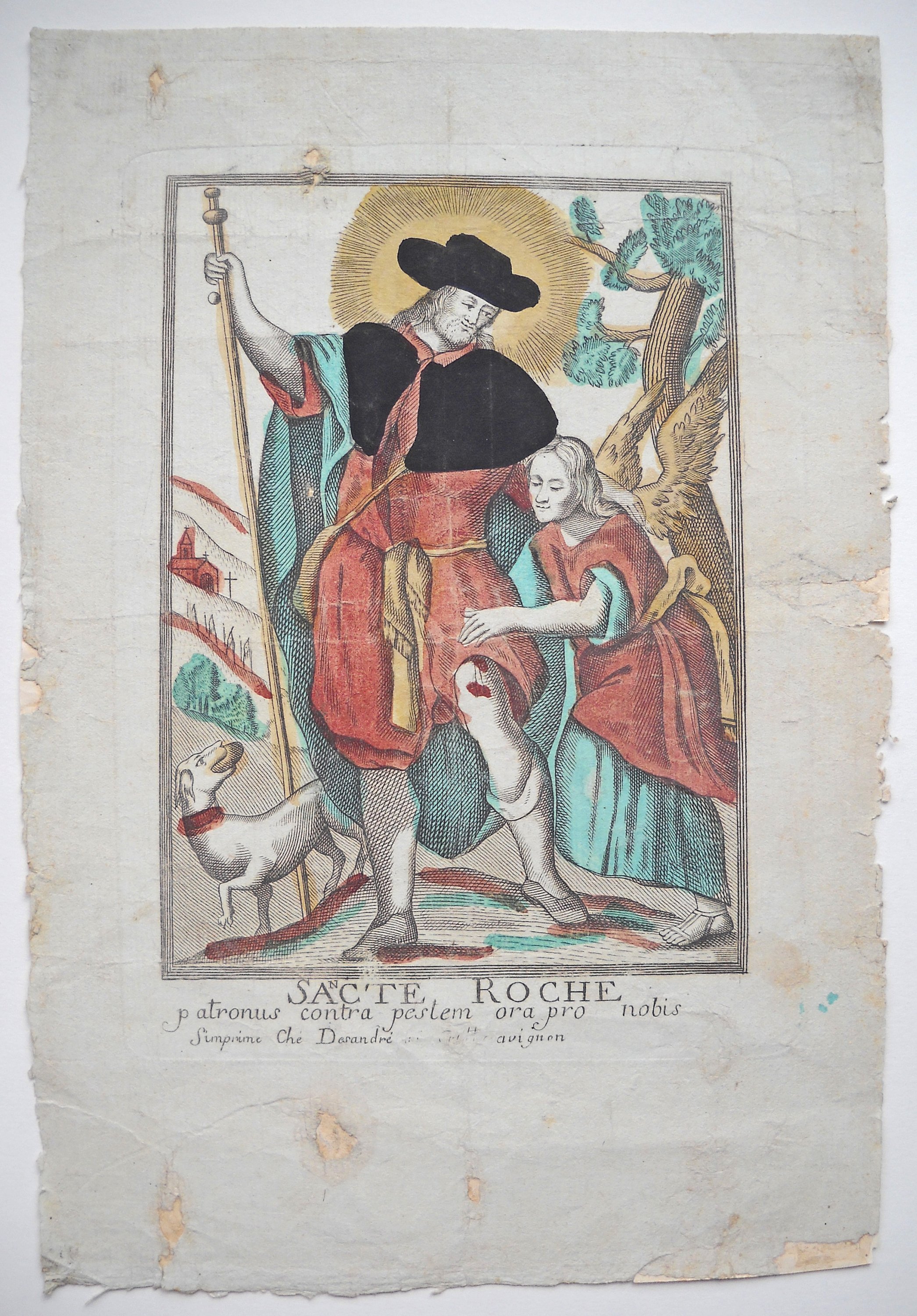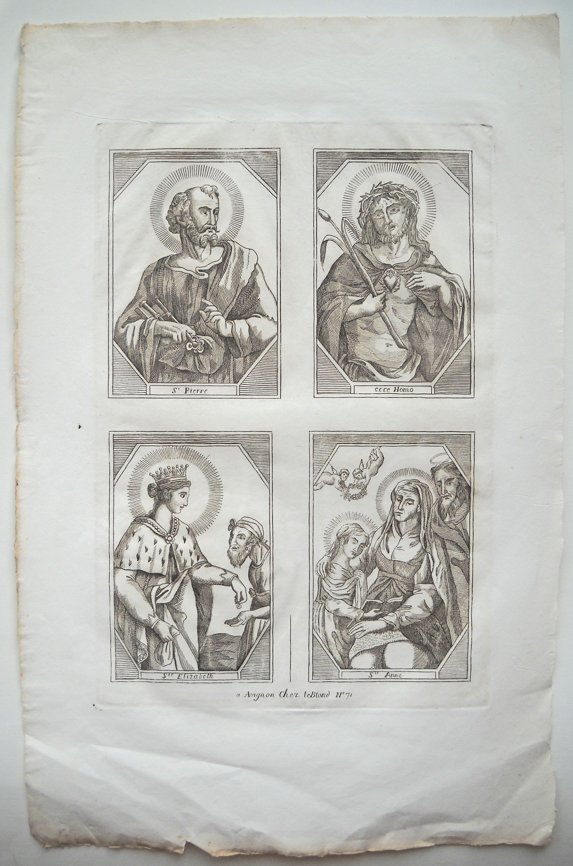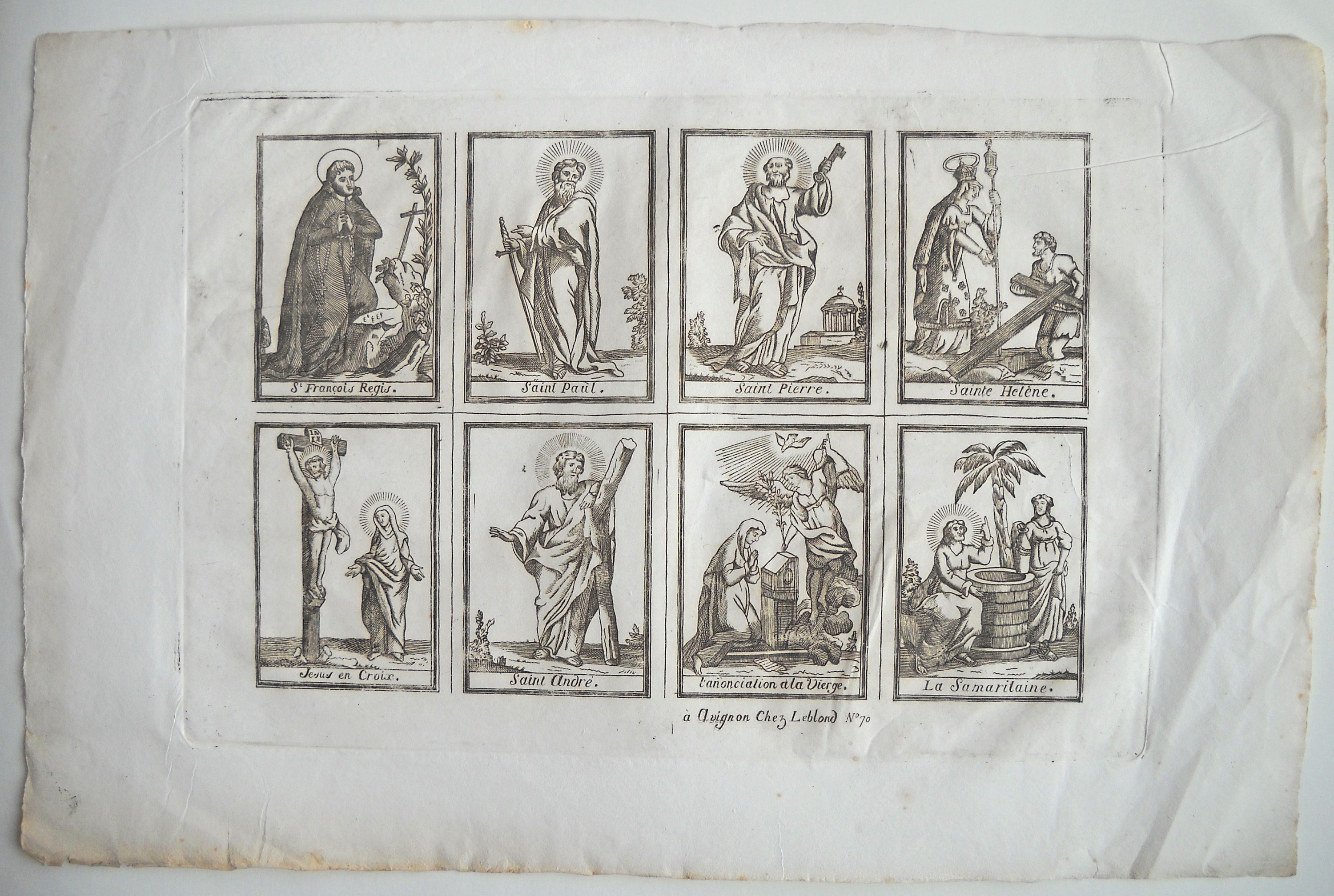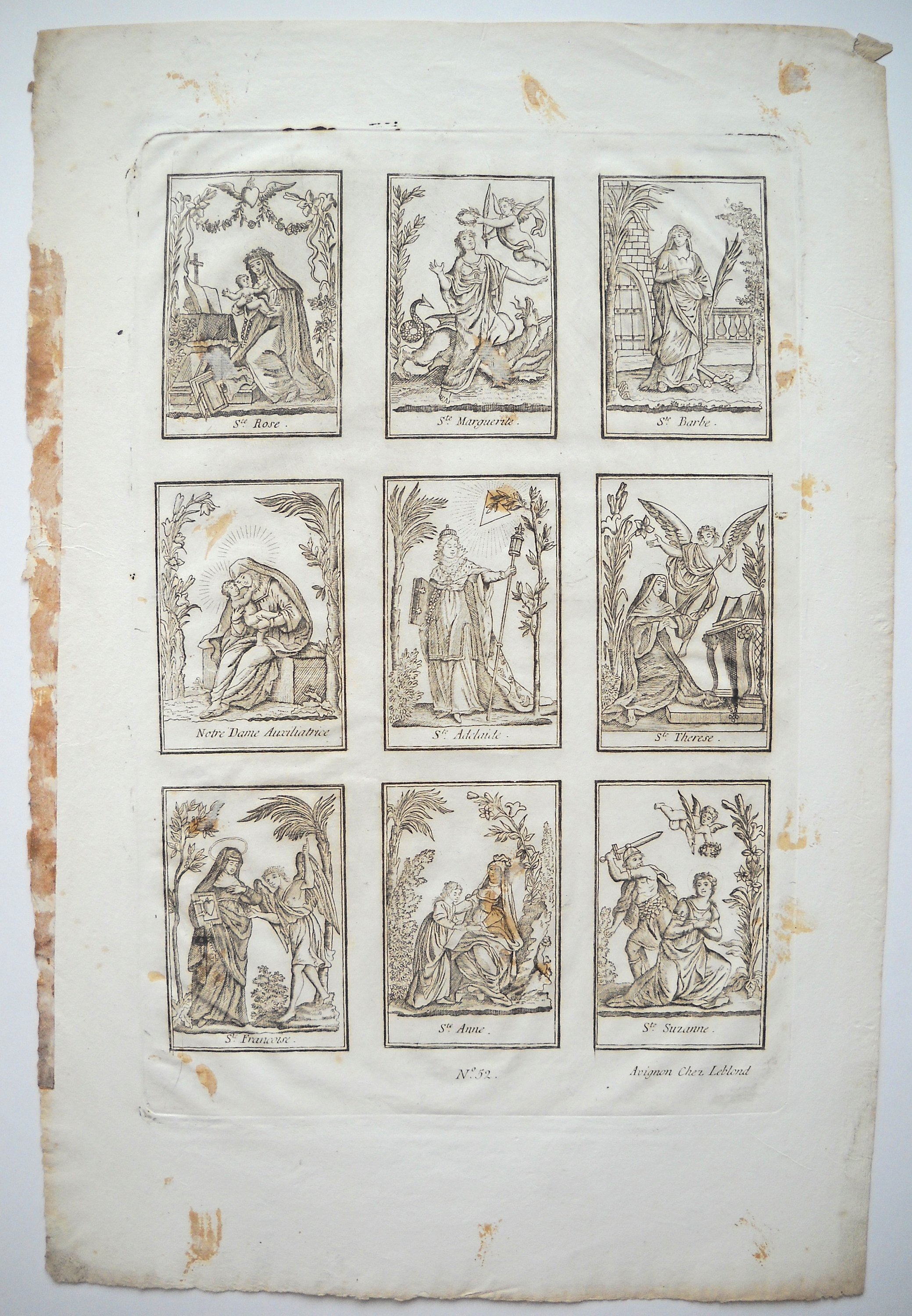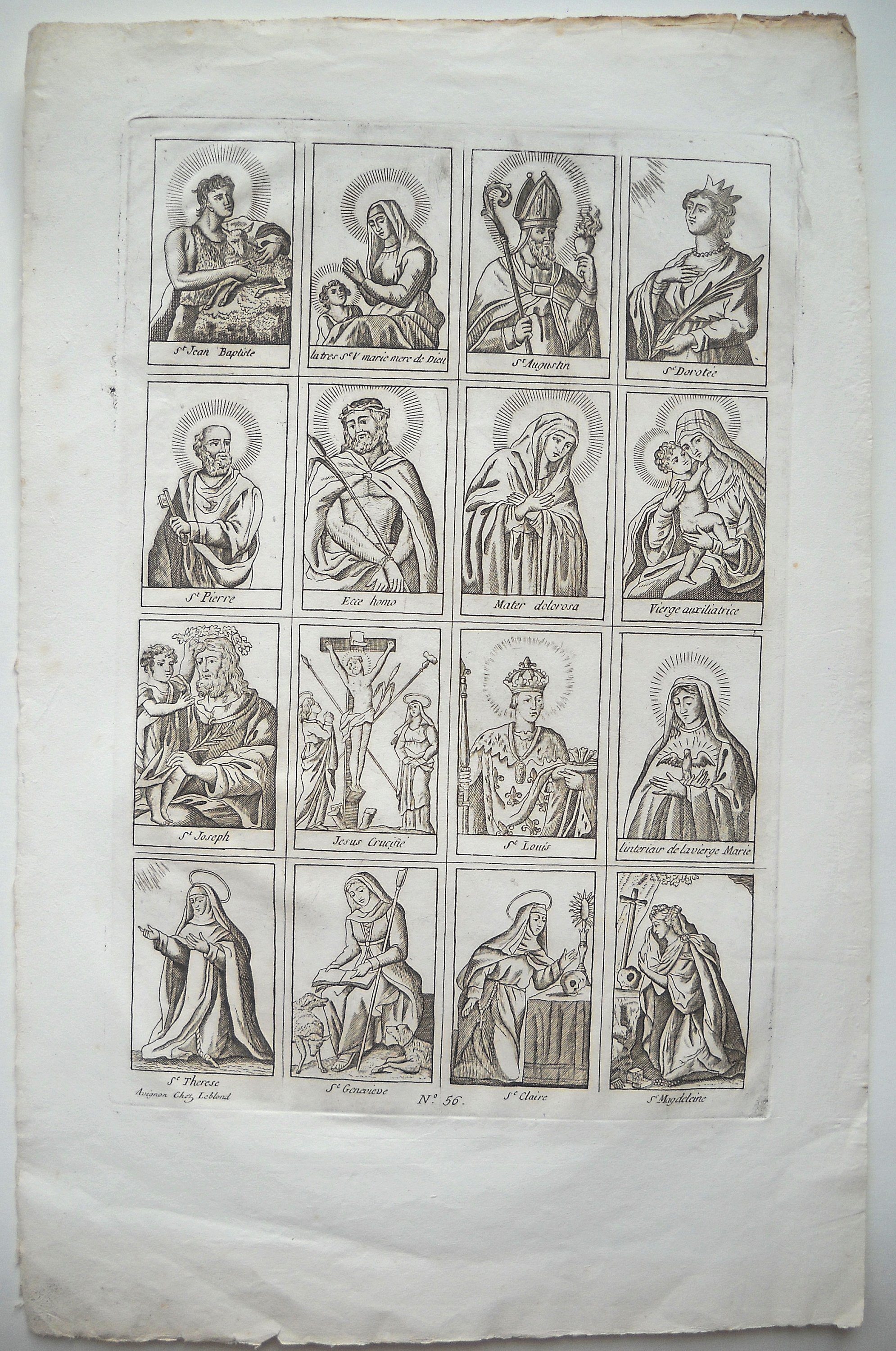 Rare et grande image de Saint Roch, dédiée pour la cathédrale de Cavaillon, gravée par Louis DAVID et datée " 1678 ", 55 x 39,5 cm - Image de la congrégation de la " Purification de Notre Dame " du collège des Jésuites à Avignon, gravée par Louis DAVID, fin du XVIIe / début du XVIIIe s., 38,5 x 25,5 cm - 3 p. gravées par Antoine DÉSANDRÉ, XVIIIe s.: " SANCTE ROCHE ", 30 x 20 cm (en l'état) ; " Sus ANTONIUS A PADUA ", 32 x 23,5 cm (en l'état) ; " NOTRE DAME de patience ", 33 x 24,5 cm -- 17 p. gravées par la famille LEBLOND, XVIIIe et début du XIXe s. dont 7 planches à compartiments ou vignettes de saintetés ; Le Christ en croix avec légende latine " JESUS AUTEM ITERUM CLAMANS MAGNA VOCE ", 58 x 44 cm ; " Assomption de la Ste Vierge " 37 x 24,5 cm (2 ex.) ; " St MARC ÉVANGÉLISTE ", 37 x 23cm (2 ex.) ; " St ANDRÉ APÔTRE ", 36 x 24 cm ; " Ste CATHERINE, VIERGE ET MARTYRE ", 35 x 23,5 cm ; " SAINT JEAN BAPTISTE ", 31,5 x 22 cm ; " SAINT JOSEPH ", 33 x 23 cm ; " Ntre DAME DE TOUT POUVOIR ", impression sur soie, 34,5 x 25,5 cm - " NAISSANCE DE Ntre SEIGNEUR ", 41 x 53 cm (en l'état, marges courtes). - " NOTRE DAME DE GRACE DE ROCHEFORT ", 33 x 23,5 cm - etc.