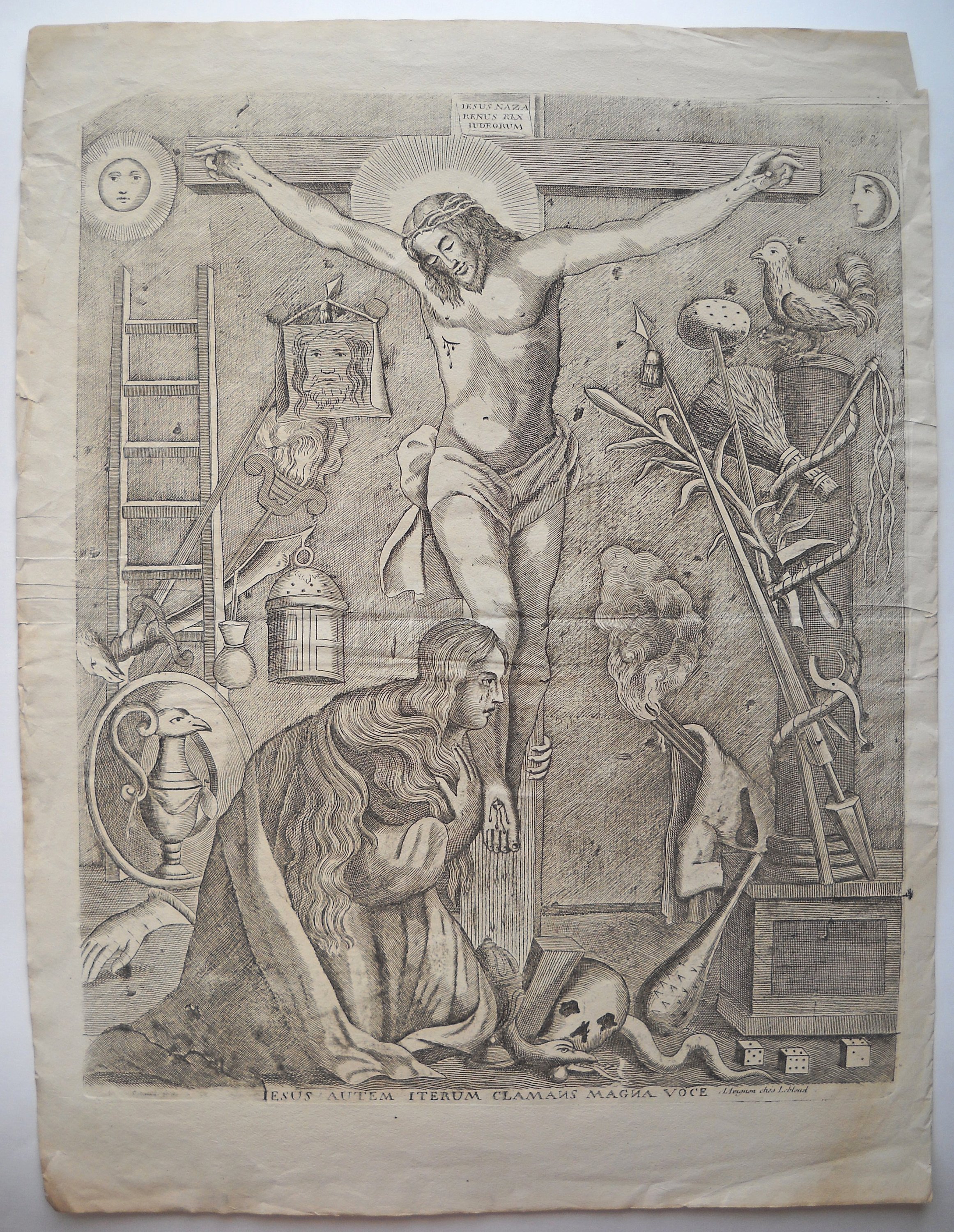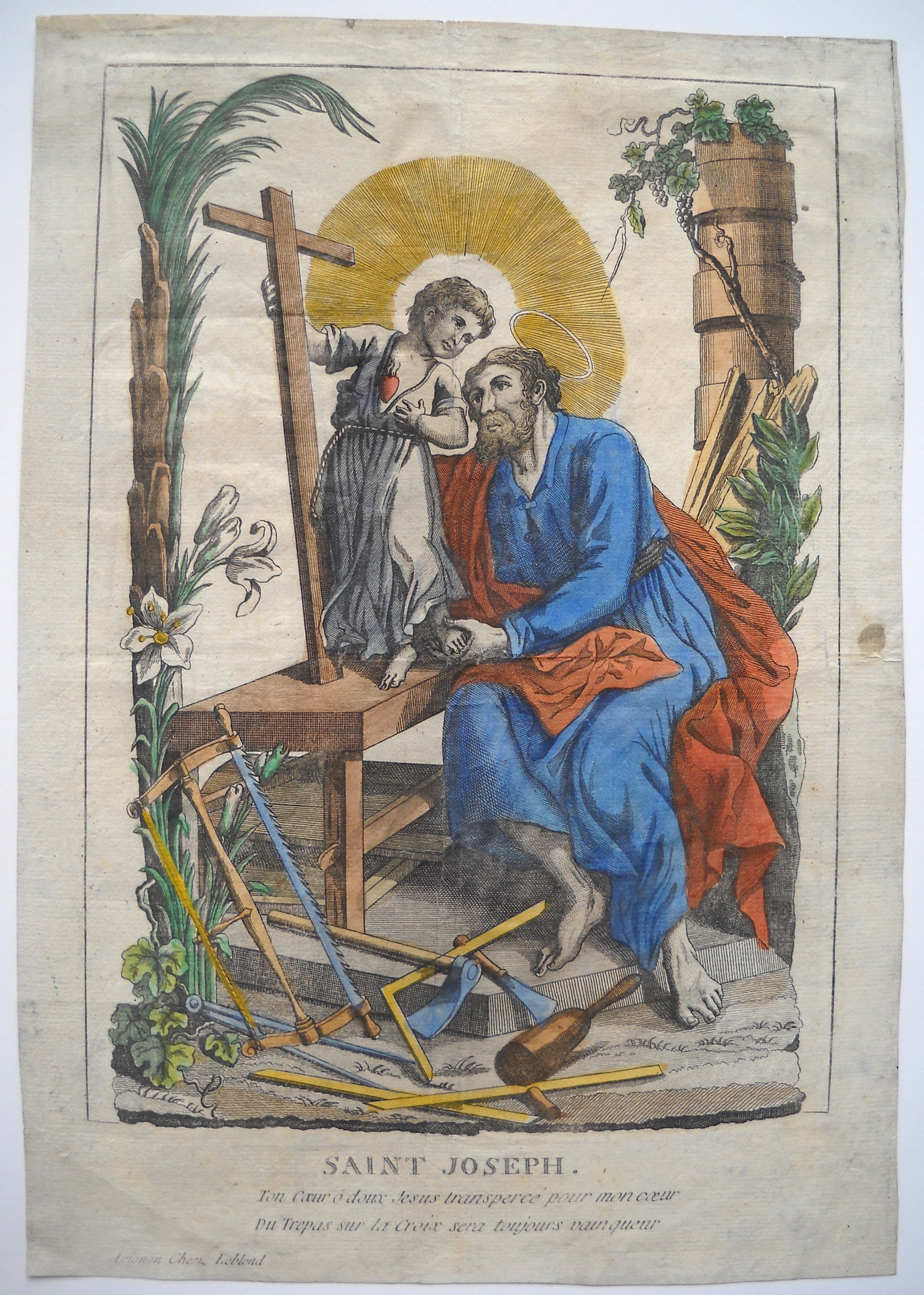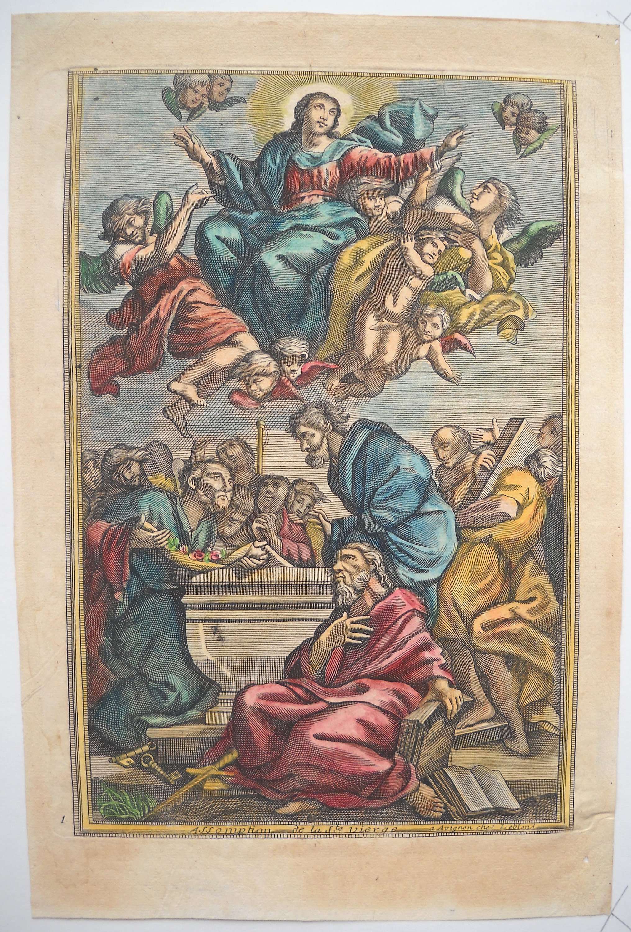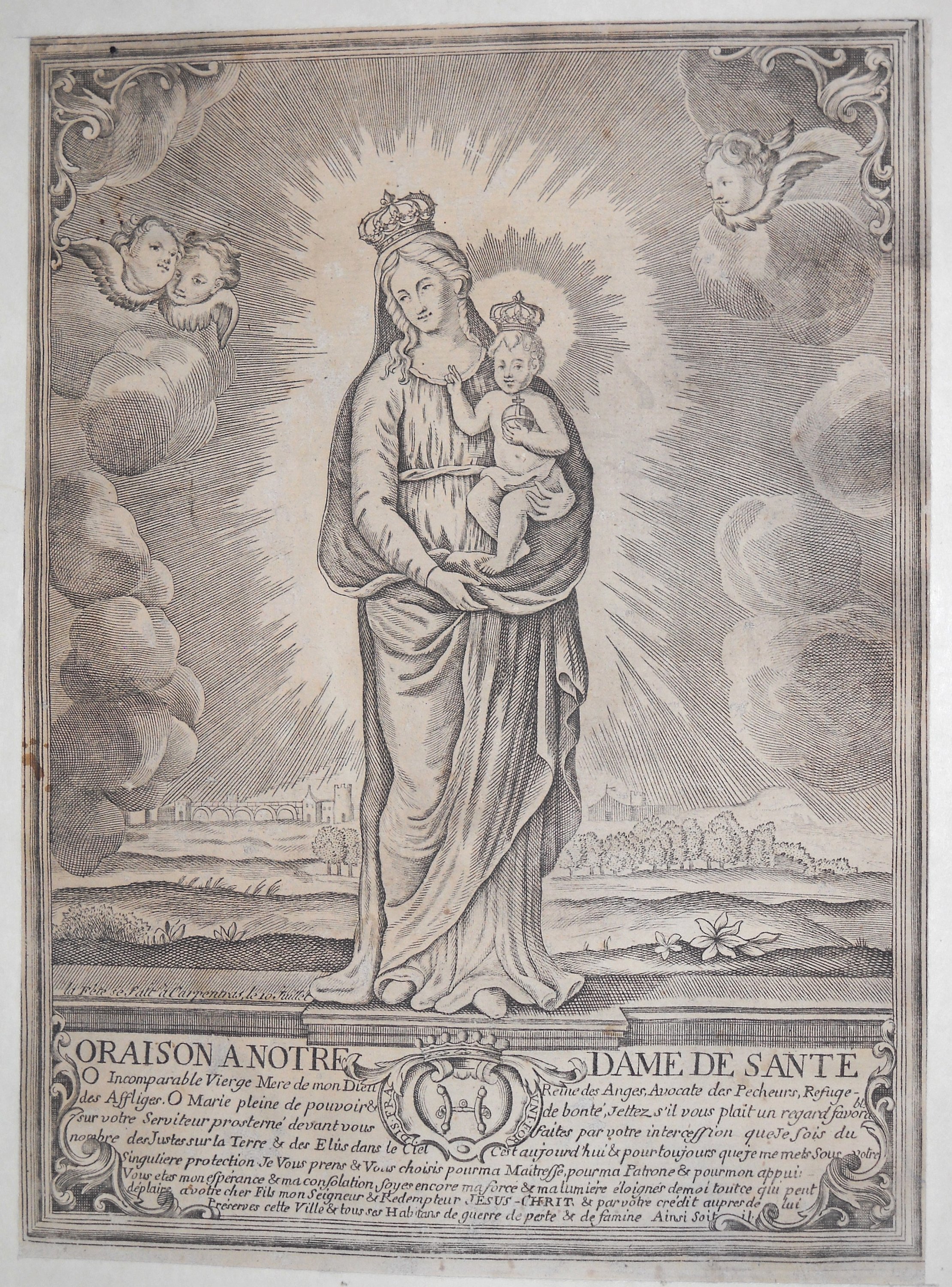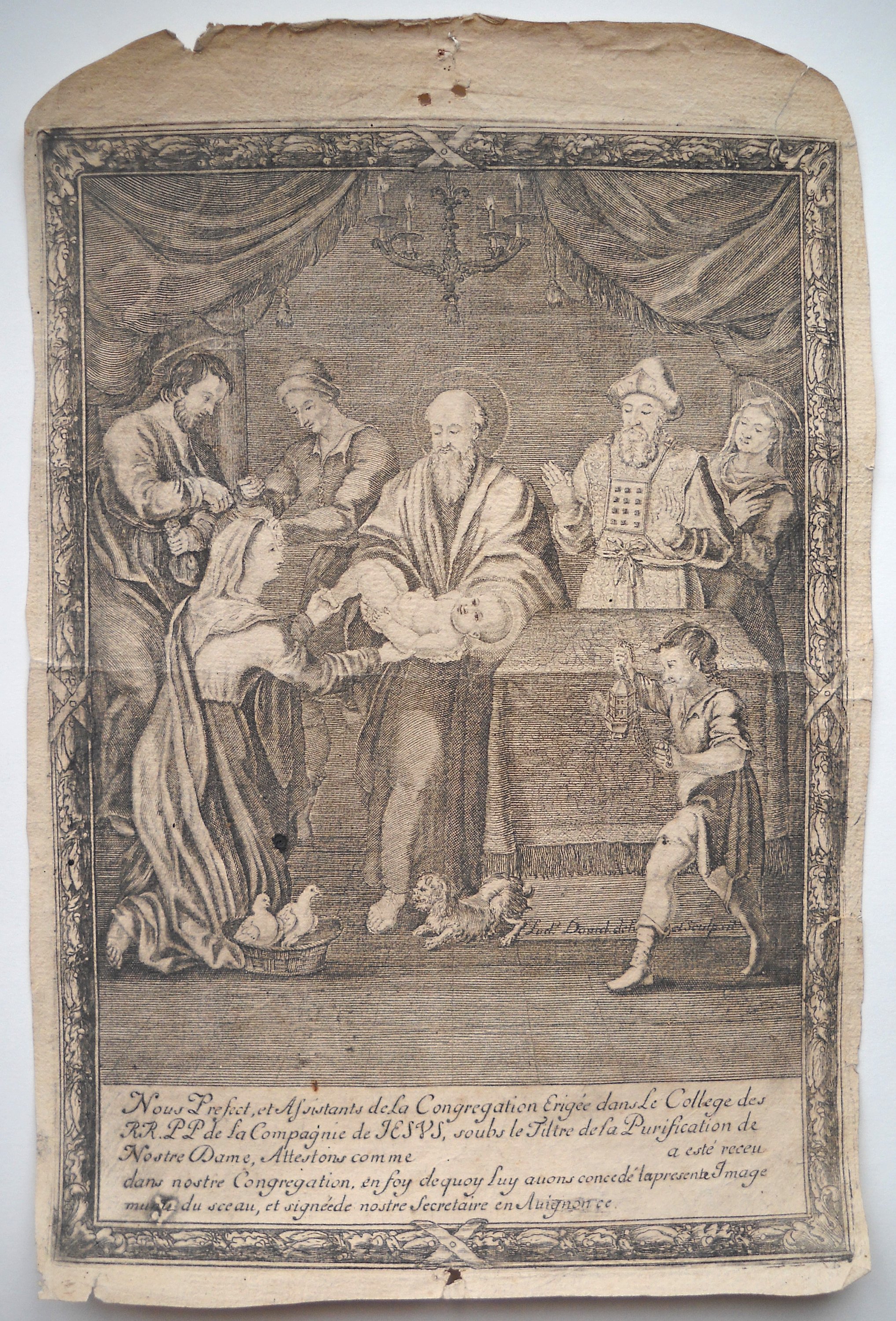 Rare et grande image de Saint Roch, dédiée pour la cathédrale de Cavaillon, gravée par Louis DAVID et datée " 1678 ", 55 x 39,5 cm - Image de la congrégation de la " Purification de Notre Dame " du collège des Jésuites à Avignon, gravée par Louis DAVID, fin du XVIIe / début du XVIIIe s., 38,5 x 25,5 cm - 3 p. gravées par Antoine DÉSANDRÉ, XVIIIe s.: " SANCTE ROCHE ", 30 x 20 cm (en l'état) ; " Sus ANTONIUS A PADUA ", 32 x 23,5 cm (en l'état) ; " NOTRE DAME de patience ", 33 x 24,5 cm -- 17 p. gravées par la famille LEBLOND, XVIIIe et début du XIXe s. dont 7 planches à compartiments ou vignettes de saintetés ; Le Christ en croix avec légende latine " JESUS AUTEM ITERUM CLAMANS MAGNA VOCE ", 58 x 44 cm ; " Assomption de la Ste Vierge " 37 x 24,5 cm (2 ex.) ; " St MARC ÉVANGÉLISTE ", 37 x 23cm (2 ex.) ; " St ANDRÉ APÔTRE ", 36 x 24 cm ; " Ste CATHERINE, VIERGE ET MARTYRE ", 35 x 23,5 cm ; " SAINT JEAN BAPTISTE ", 31,5 x 22 cm ; " SAINT JOSEPH ", 33 x 23 cm ; " Ntre DAME DE TOUT POUVOIR ", impression sur soie, 34,5 x 25,5 cm - " NAISSANCE DE Ntre SEIGNEUR ", 41 x 53 cm (en l'état, marges courtes). - " NOTRE DAME DE GRACE DE ROCHEFORT ", 33 x 23,5 cm - etc.