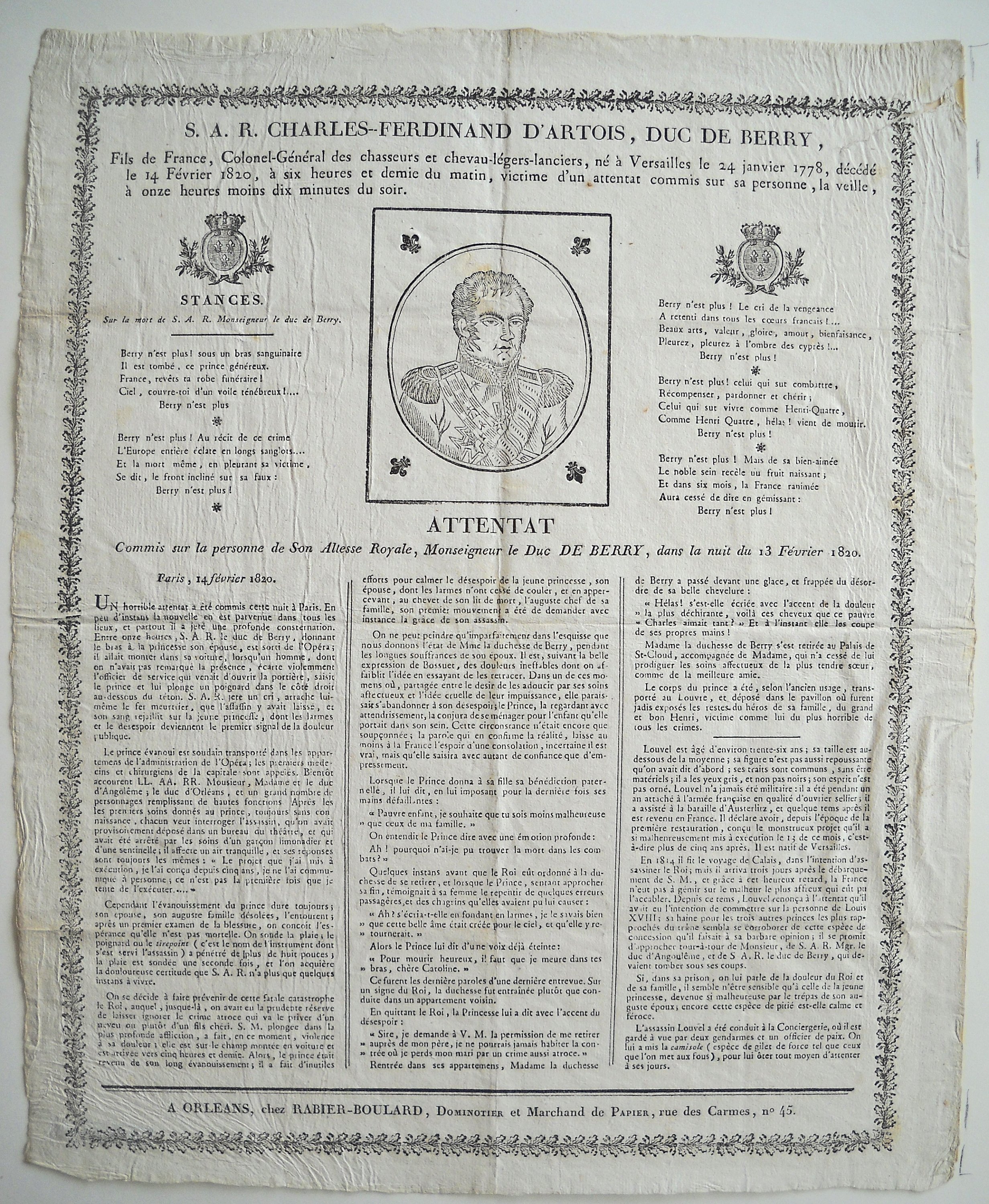 ", 40 x 31 cm (plis, tache, restaurations) - " MONSEIGNEUR LE DUC D'ANGOULÊME ENTRANT DANS LA VILLE DE MADRID / A LA TÊTE DES REGIMENTS DE LA GARDE ROYALE A CHEVAL FAISANTS PARTIE DE CETTE BELLE ARMÉE ", [1823], 67,5 x 85,5 cm (plis, taches, restaurations) - " S.A.R. CHARLES-FERDINAND D'ARTOIS, DUC DE BERRY