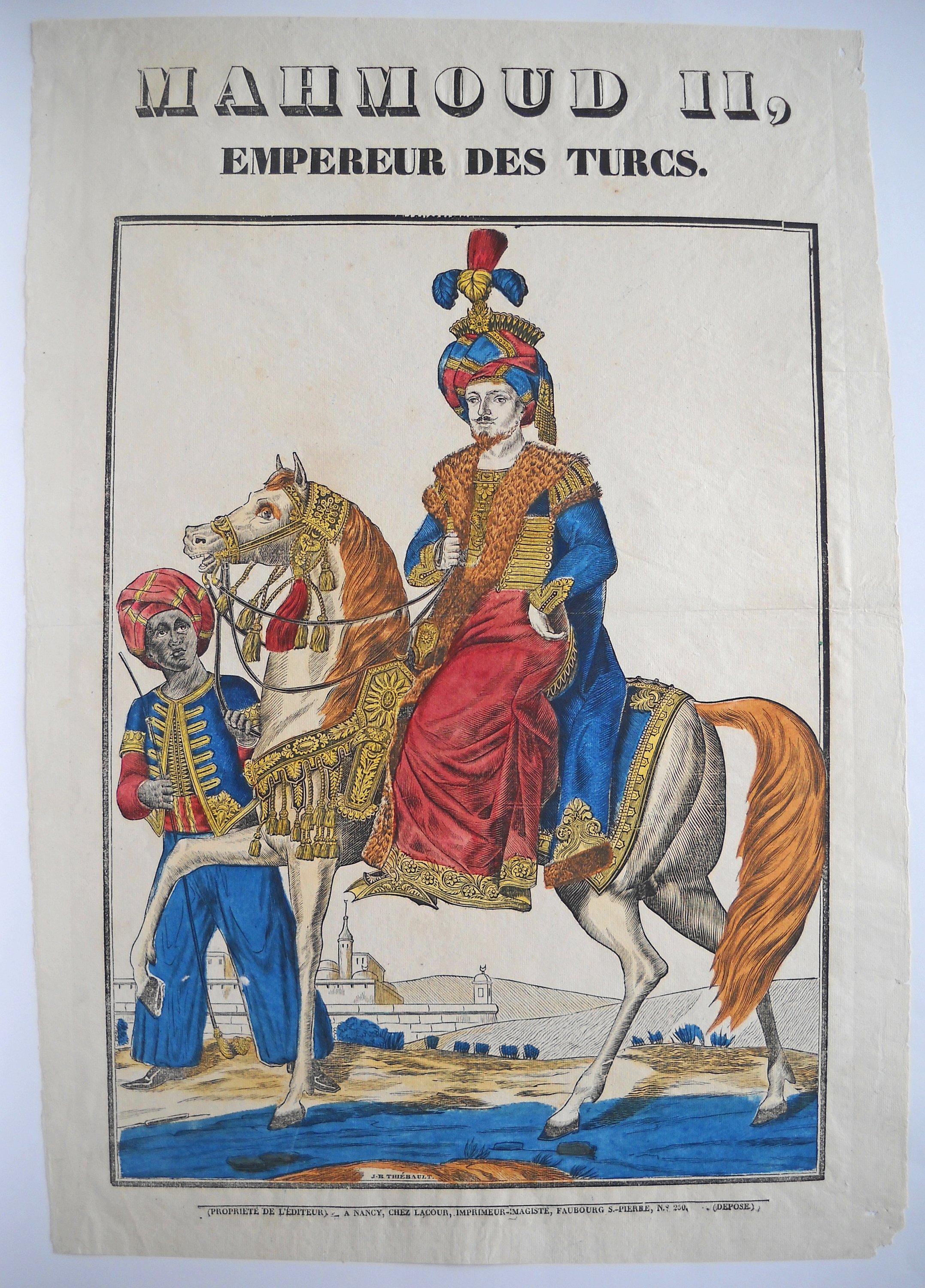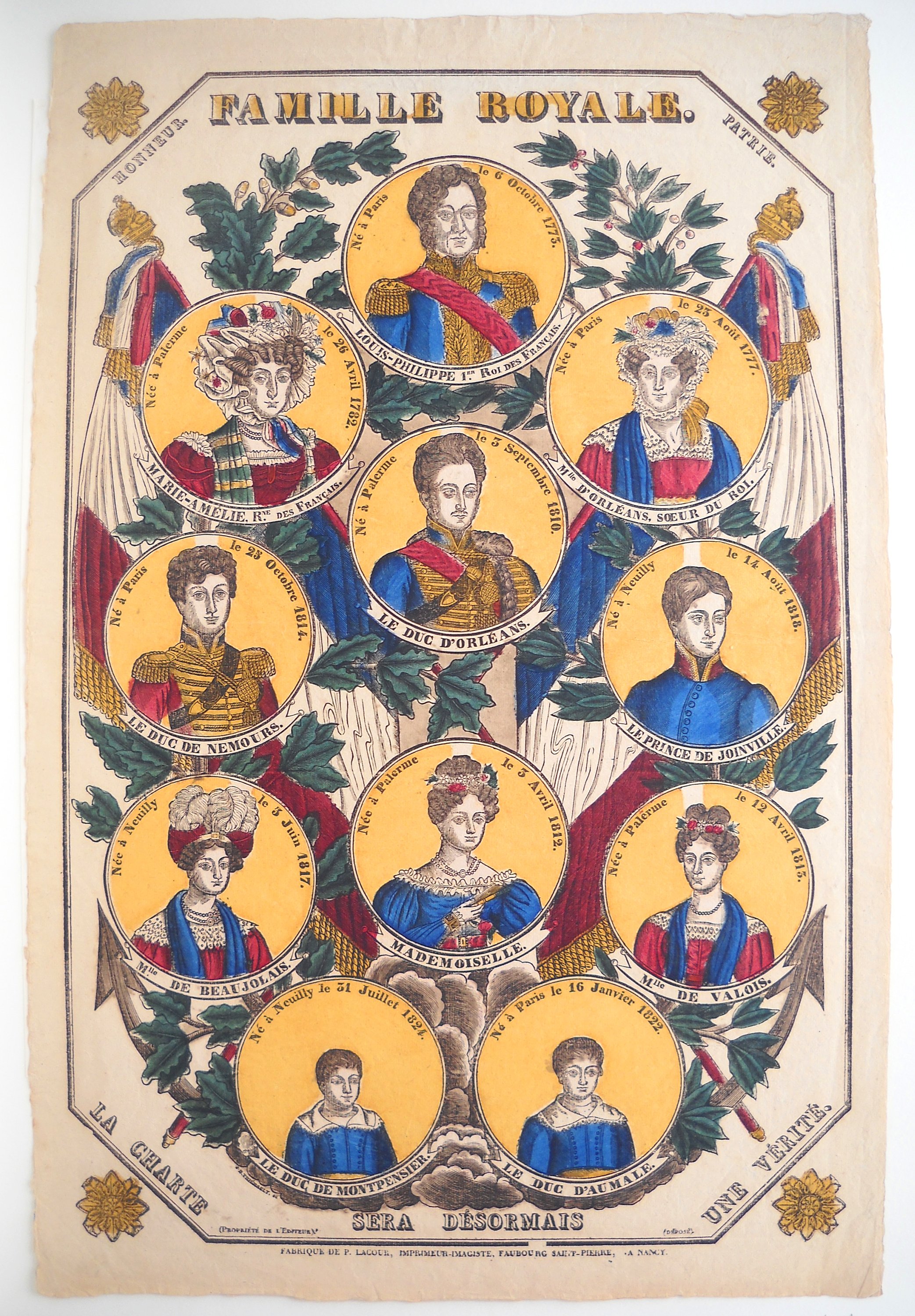 4 épreuves, gravures sur bois, coloris d'époque, sur papier vergé crème, toutes signées par J.B. Thiébault, placées sous passe-partout: " FAMILLE ROYALE ", 64 x 41,5 cm. - Planche à compartiments (2 x 2) " COMPATRIOTES (N°1) ", 42,5 x 30,5 cm - " MAHMOUD II, EMPEREUR DES TURCS ", 61 x 42 cm - " SAINTE GENEVIEVE DE BRABANT ", 40 x 61,5 cm (plis).