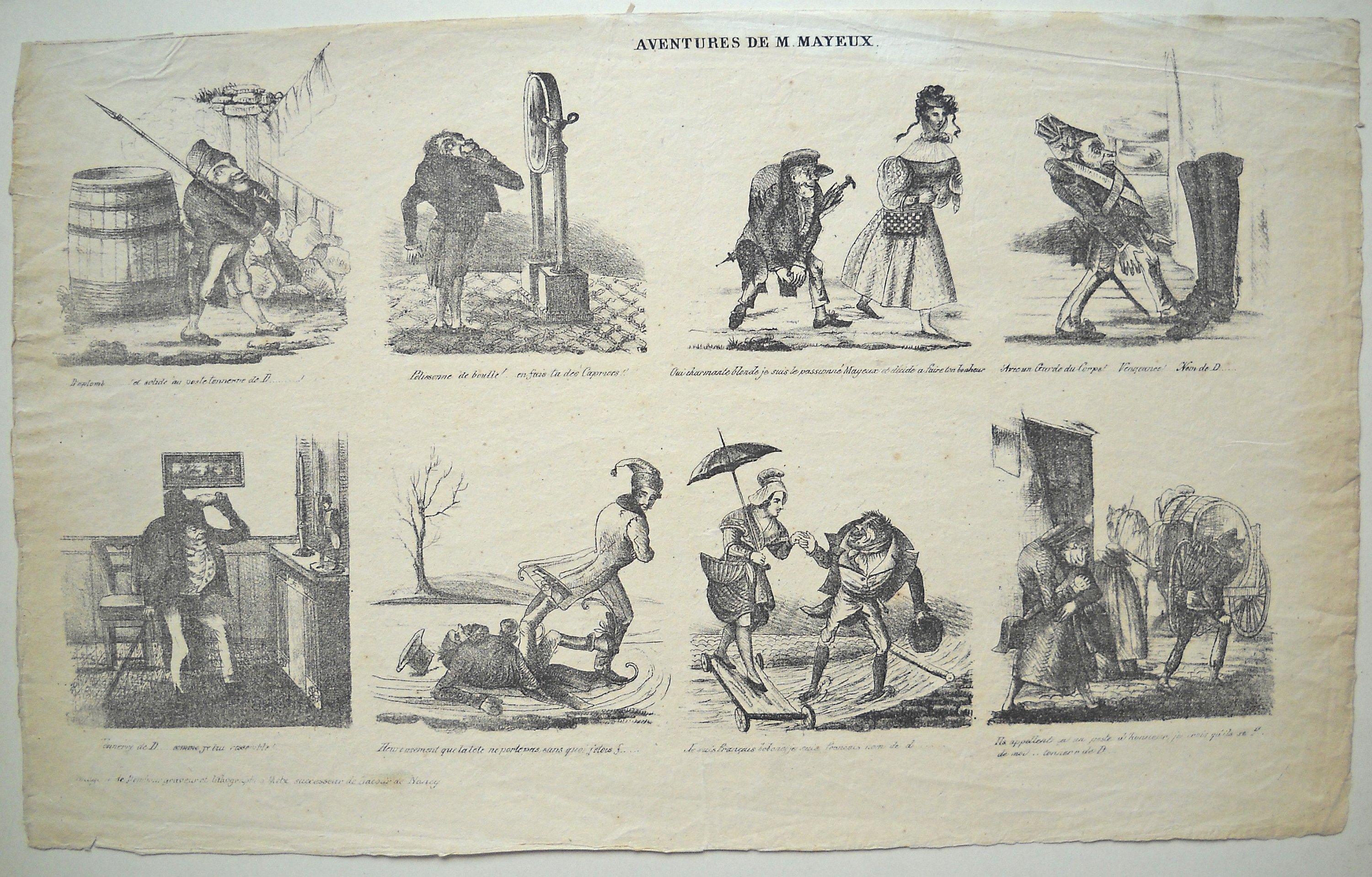 13 épreuves, gravures sur bois, xylographie et lithographie, sur papier vergé ou papier mince, en noir ou coloris de l'époque, certaines placées sous passe-partout ou contrecollées sur carton épais, B à TTB, env. 42 x 28 cm: " RELATION DE L'ATTAQUE ET DE LA PRISE DE DEUX MONSTRES MARINS " - " MORT EPOUVANTABLE D'UN AVARE " - [Cadran d'horloge] (tache, petits déf.) - Planche de militaires: GRENADIERS (taches) - " AVENTURES DE M. MAYEUX " - Planche de saintetés et sujets bibliques (3 x 6) - " CANTIQUE SPIRITUEL / SAINT ALEXIS " (petits déf.) - " SAINT MATHIEU " - " SAINT MARC " - " SAINT LUC, ÉVANGÉLISTE " - " SACRÉ CUR DE MARIE " - " SAINT LUBIN, ÉVÊQUE DE CHARTRES " - " SAINT LAMBERT, ÉVÊQUE DE MAESTRICHT ".