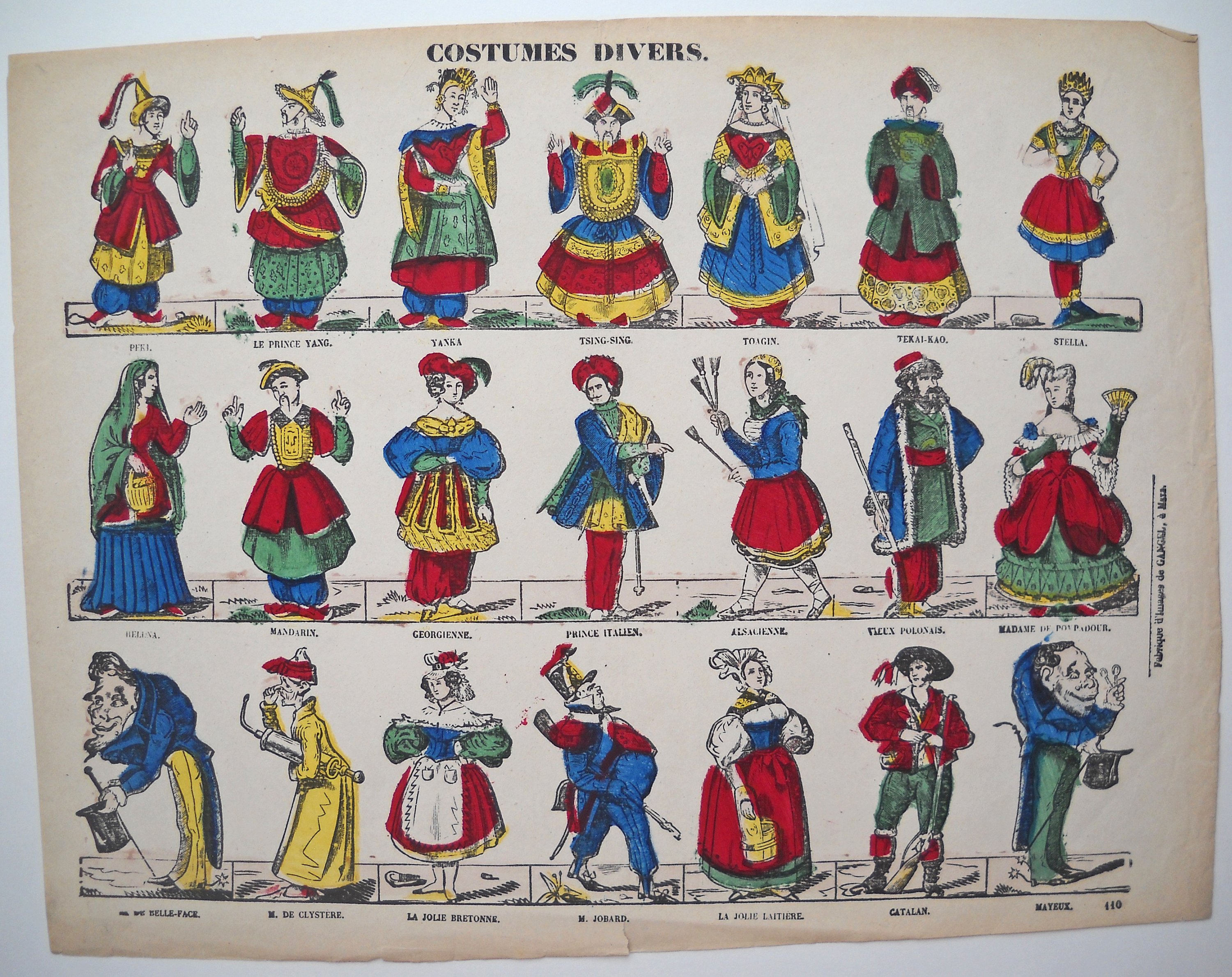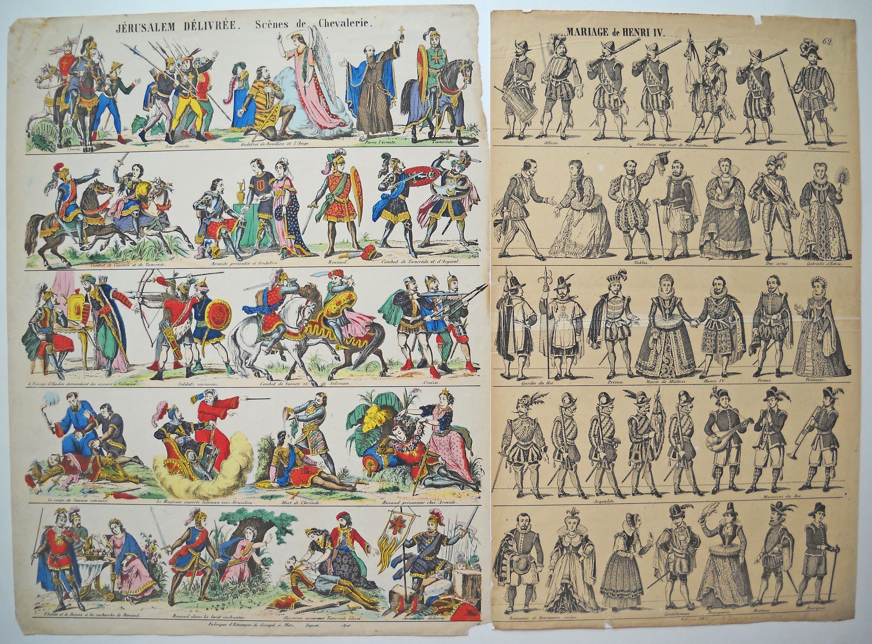 68 épreuves, gravures sur bois, xylographies et lithographies, sur papier mince, en noir ou coloris de l'époque, certaines placées sous passe-partout ou contrecollées sur carton épais, états moyen à TTB: env. 41 x 61 cm: " BATAILLE DE FLEURUS / REMPORTÉE EN 1794, CONTRE LES AUTRICHIENS " ; " LES QUATRE VERITES DU SIECLE " ; " PYRAME ET THISBÉ " ; " HISTOIRE DE DAMON ET HENRIETTE " - 2 ex. " LE JUIF-ERRANT ", 42 x 32 cm - 2 ex. " LES TAILLEURS ALLEMANDS ", 32,5 x 41 cm - Env. 41 x 32 cm et inverse: " OMBRES CHINOISES, LA TENTATION DE St ANTOINE " ; " ADELAIDE ET FERDINAND / OU LES TROIS ANNEAUX " ; 2 ex. " DAMON ET HENRIETTE " ; CADRAN D'HORLOGE ; 4 portraits de femmes: " L'HIVER ", " L'EUROPE ", " CAROLINE ", " ADÈLE " ; 2 ex. " JERUSALEM DELIVREE. Scènes de chevaleries " ; " VAISSEAUX DE LA MARINE FRANCAISE " ; " MARIAGE de HENRI IV " ; " LE PLAISIR DE L'EUROPE " ; 4 ex. de la série " L'ENFANT DE GIBERNE " - " CONTES DES FÉES " ; " CARICATURES " ; " FAMILLE DE JEAN " ; 2 ex. " PERSONNAGES DE THÉÂTRE " ; " SCÈNES VILLAGEOISES " ; 2 ex. " COSTUMES DIVERS " - env. 46 x 35,5 cm et inverse: " COSTUMES DE THÉÂTRE " ; " CHASSE SOUS LOUIS XV " ; 2 ex. " PAYSAGES " ; " HEUR ET MALHEUR DE LA CRINOLINE " ; " LES ÉTRANGERS A L'EXPOSITION UNIVERSELLE " ; " SOUVENIRS DROLATIQUES, HISTORIQUES DE L'EXPOSITION UNIVERSELLE " ; " FINETTE OU L'ADROITE PRINCESSE " ; - 22 planches d'historiettes, env. 42 x 32 cm et inverse: " TERRIBLES AVENTURES DE BABYLES-MACHIN " ; " TABLEAU PHYSIONOMISTE DES DOUZE ARRONDISSEMENTS DE PARIS " ; 2 ex. " HISTOIRE DE DAMON ET HENRIETTE " ; " LES AMOURS MALHEUREUSES / DE PIERRE GUIGNOLET ET DE FIFINE MISTANFLUTE " ; " LA BOUCHERIE LIBRE et ses agréments " ; " CADET ROUSSELLE " ; " HISTOIRE DE PEAU D'ANE " ; " LES POSITIONS DELICATES ET DESAGREABLES " ; FLORISE, conte de Fénélon " ; " L'OISEAU BLEU " ; " LE BOSSU " ; " LE MONDE RENVERSÉ " ; " LA CHINE AU XIXe SIÈCLE " ; " HISTOIRE DE LA PETITE DESOBEISSANTE " ; " HISTOIRE DU PETIT DESOBEISSANT " ; " HISTOIRE DE DON-QUICHOTTE DE LA MANCHE " ; " HISTOIRE DE LA PETITE CENDRILLON " ; " JULIETTE " ; " HISTOIRE TRAGIQUE DE TOUCHE-A-TOUT " ; " LE SIRE DE CRAMOISY " ; " RECREATIONS DE L'ENFANCE " ; " FABLE DE FLORIAN " - 3 planches de rébus.