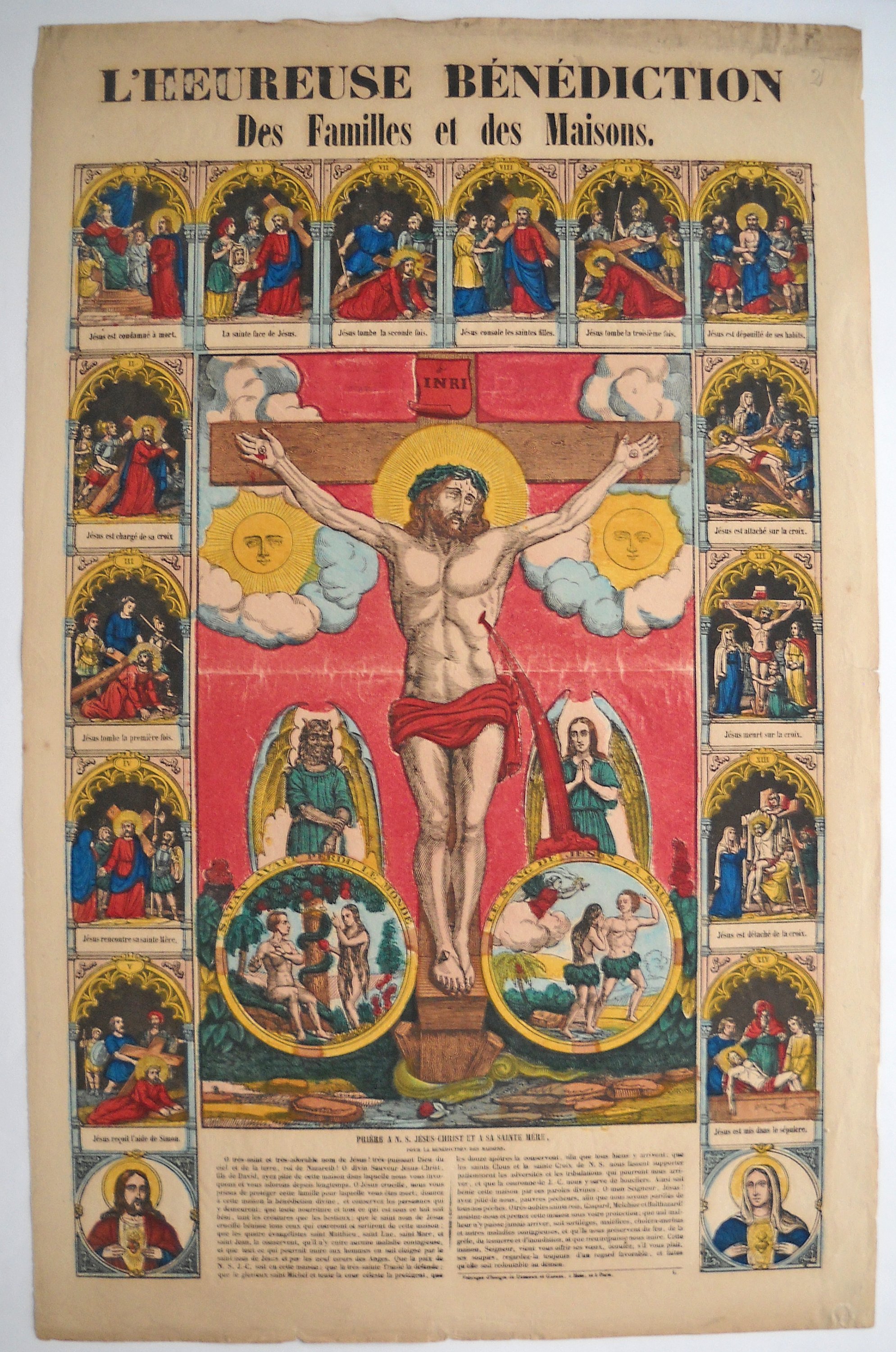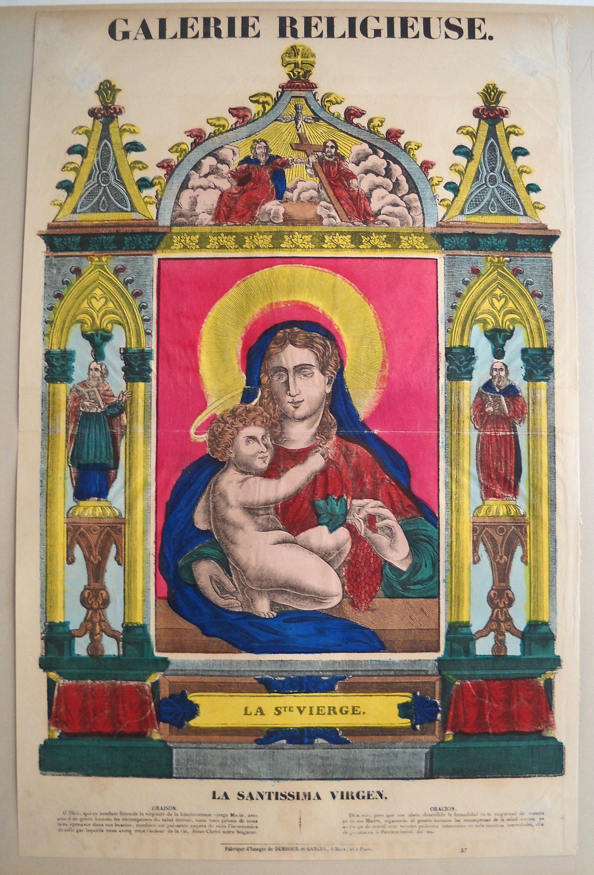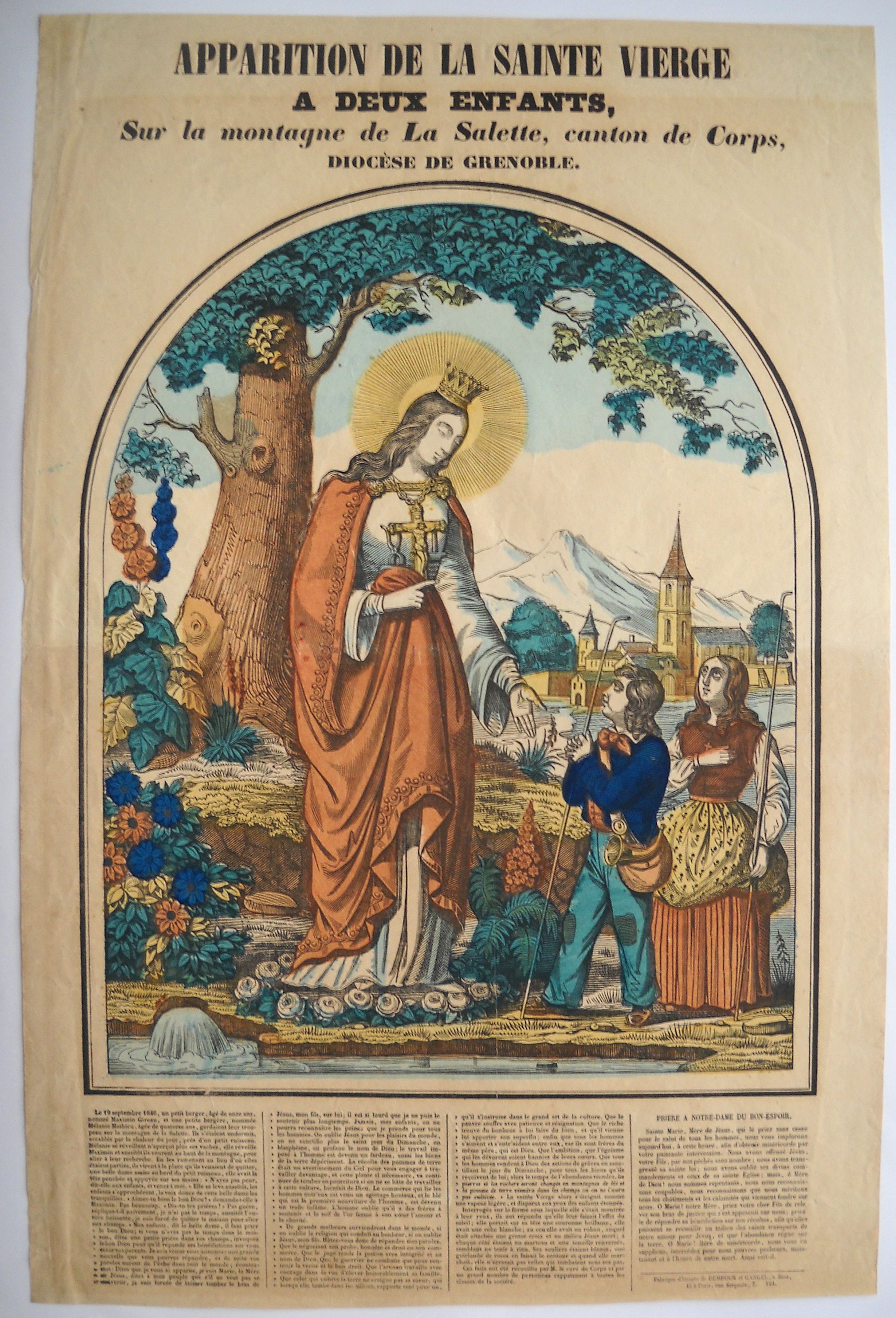 Beau lot de 35 épreuves, gravures sur bois ou xylographies, sur papier mince, coloris de l'époque, certaines avec légende en espagnol, placées sous passe-partout ou contrecollées sur carton épais, env. 65 x 42 cm, B à TTB: " RÉPUBLIQUE FRANCAISE 1848. PAIX SUR LEMONDE " ; " ADELAIDE ET FERDINAND " - " PRIERE A DIEU " ; " GALERIE RELIGIEUSE / NOTRE-DAME AUX FLEURS " ; " DELIVRANCE DES AMES / DU PURGATOIRE " ; " GALERIE RELIGIEUSE / MÉDAILLE MIRACULEUSE " ; 2 ex. " GALERIE RELIGIEUSE / ST JOSEPH " ; " GALERIE RELIGIEUSE / LA STE VIERGE " ; 3 ex. " GALERIE RELIGIEUSE / STE PHILOMÈNE " ; " CHEMIN DE LA CROIX " ; " ADORATION A LA SAINTE FACE DE JESUS-CHRIST " ; " CHRIST AUX APOTRES " ; " PORTRAIT DE N.-S. CHRIST. TABLEAUX DE SES SOUFFRANCES " ; " L'HEUREUSE BÉNÉDICTION Des Familles et des Maisons " ; " TENTATION DE SAINT ANTOINE " ; " L'IMMACULÉE CONCEPTION DE LA GLORIEUSE VIERGE MARIE " ; " CHRIST DE LA MISÉRICORDE " ; " NOTRE-DAME DE VAL FLEURY " ; " " GALERIE RELIGIEUSE / SAINT DÉSIRÉ " (manque) ; " GALERIE RELIGIEUSE / SAINT MATHIEU " ; " NOTRE-DAME DU SAINT ROSAIRE " ; 2 ex. " GALERIE RELIGIEUSE / S. C. DE MARIE " ; " GALERIE RELIGIEUSE / S. C. DE JÉSUS " ; " LA MORT DU JUSTE " ; " APPARITION DE LA SAINTE VIERGE / A DEUX ENFANTS, / Sur la montagne de La Salette, canton de Corps, / DIOCÈSE DE GRENOBLE " ; " NOTRE-DAME DE LIESSE " ; " LE MOURANT PRÊT A PARAITRE DEVANT DIEU " ; " TABLEAU DU ROYAUME DES CIEUX " (en l'état) ; " GALERIE RELIGIEUSE / SAINT MARC " ; 2 ex. " N.-D. DE BONSECOURS ".