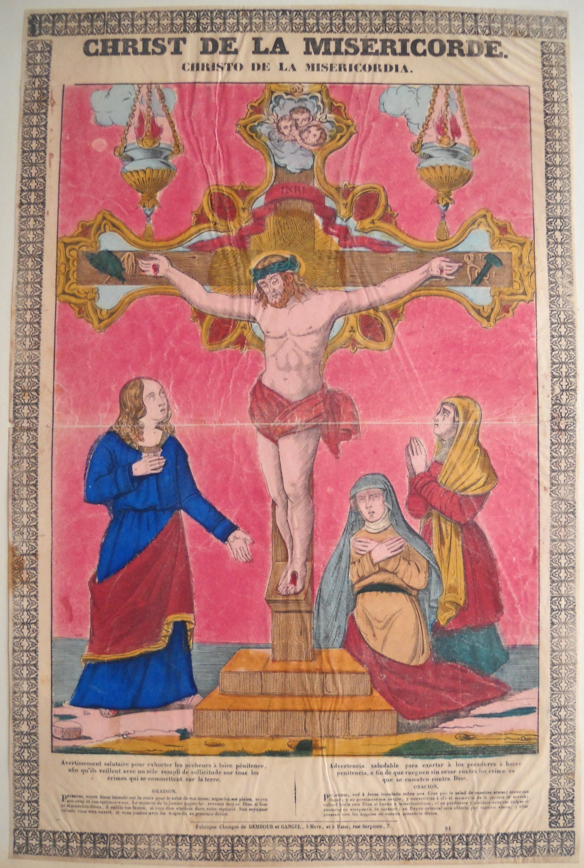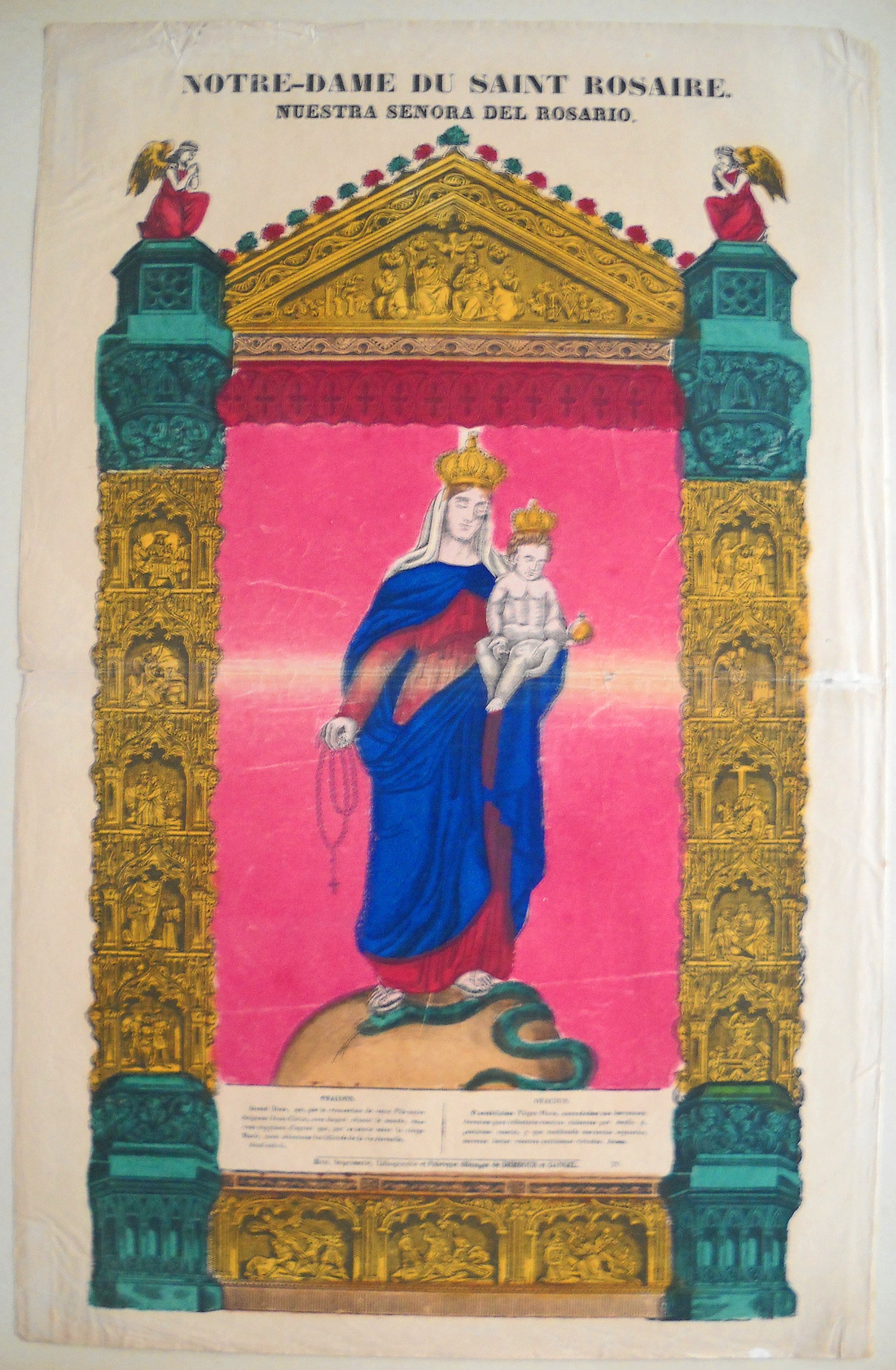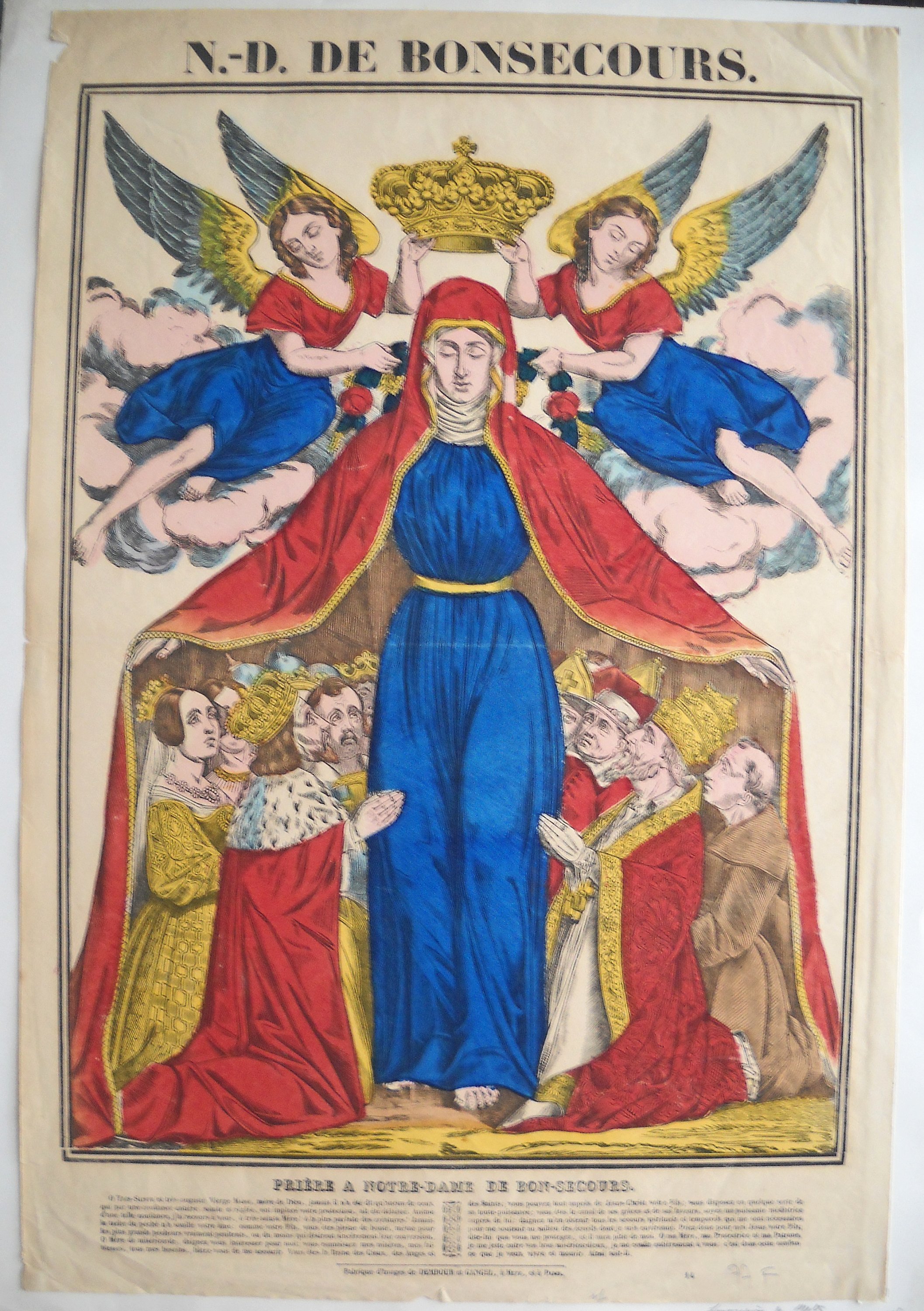 Beau lot de 35 épreuves, gravures sur bois ou xylographies, sur papier mince, coloris de l'époque, certaines avec légende en espagnol, placées sous passe-partout ou contrecollées sur carton épais, env. 65 x 42 cm, B à TTB: " RÉPUBLIQUE FRANCAISE 1848. PAIX SUR LEMONDE " ; " ADELAIDE ET FERDINAND " - " PRIERE A DIEU " ; " GALERIE RELIGIEUSE / NOTRE-DAME AUX FLEURS " ; " DELIVRANCE DES AMES / DU PURGATOIRE " ; " GALERIE RELIGIEUSE / MÉDAILLE MIRACULEUSE " ; 2 ex. " GALERIE RELIGIEUSE / ST JOSEPH " ; " GALERIE RELIGIEUSE / LA STE VIERGE " ; 3 ex. " GALERIE RELIGIEUSE / STE PHILOMÈNE " ; " CHEMIN DE LA CROIX " ; " ADORATION A LA SAINTE FACE DE JESUS-CHRIST " ; " CHRIST AUX APOTRES " ; " PORTRAIT DE N.-S. CHRIST. TABLEAUX DE SES SOUFFRANCES " ; " L'HEUREUSE BÉNÉDICTION Des Familles et des Maisons " ; " TENTATION DE SAINT ANTOINE " ; " L'IMMACULÉE CONCEPTION DE LA GLORIEUSE VIERGE MARIE " ; " CHRIST DE LA MISÉRICORDE " ; " NOTRE-DAME DE VAL FLEURY " ; " " GALERIE RELIGIEUSE / SAINT DÉSIRÉ " (manque) ; " GALERIE RELIGIEUSE / SAINT MATHIEU " ; " NOTRE-DAME DU SAINT ROSAIRE " ; 2 ex. " GALERIE RELIGIEUSE / S. C. DE MARIE " ; " GALERIE RELIGIEUSE / S. C. DE JÉSUS " ; " LA MORT DU JUSTE " ; " APPARITION DE LA SAINTE VIERGE / A DEUX ENFANTS, / Sur la montagne de La Salette, canton de Corps, / DIOCÈSE DE GRENOBLE " ; " NOTRE-DAME DE LIESSE " ; " LE MOURANT PRÊT A PARAITRE DEVANT DIEU " ; " TABLEAU DU ROYAUME DES CIEUX " (en l'état) ; " GALERIE RELIGIEUSE / SAINT MARC " ; 2 ex. " N.-D. DE BONSECOURS ".
