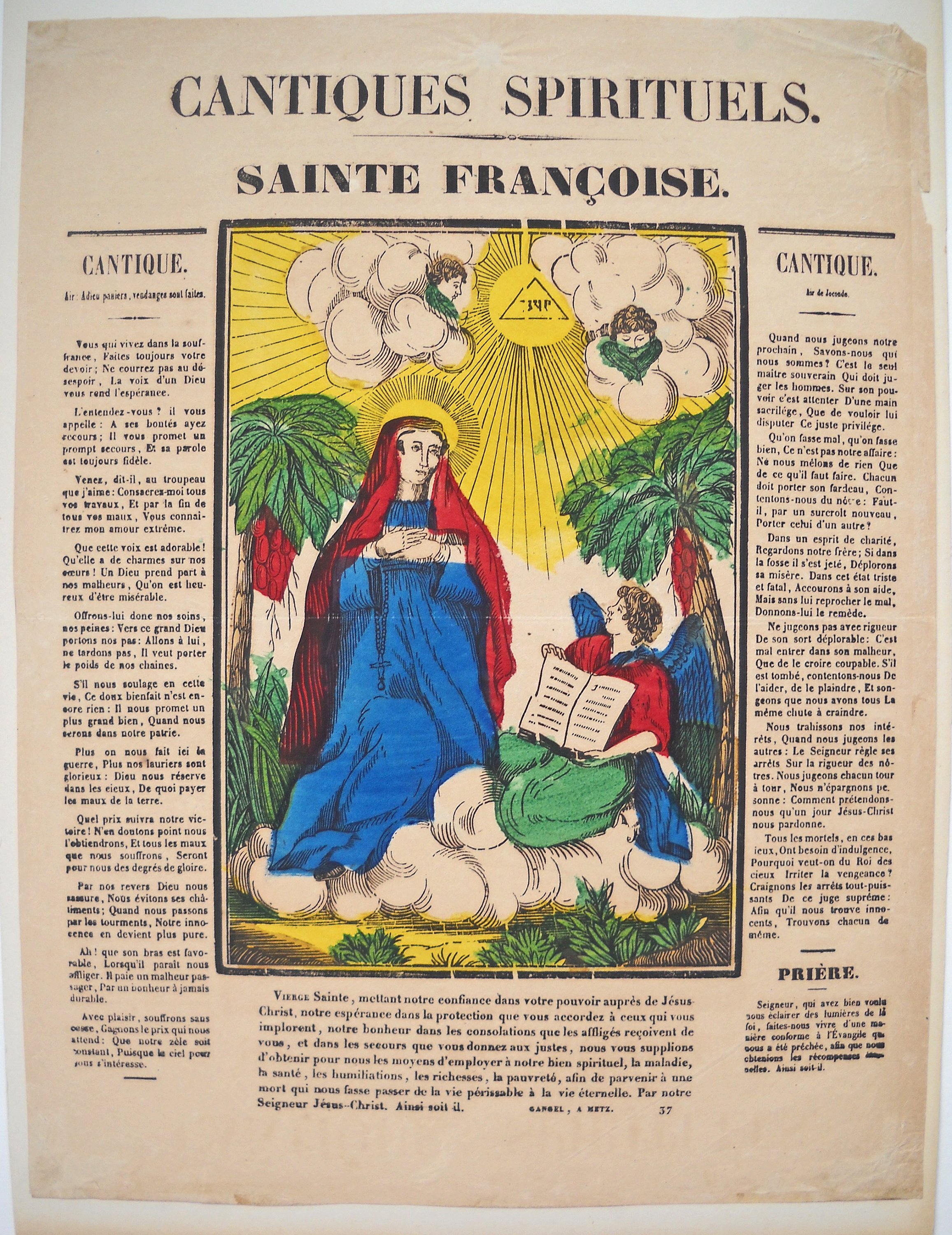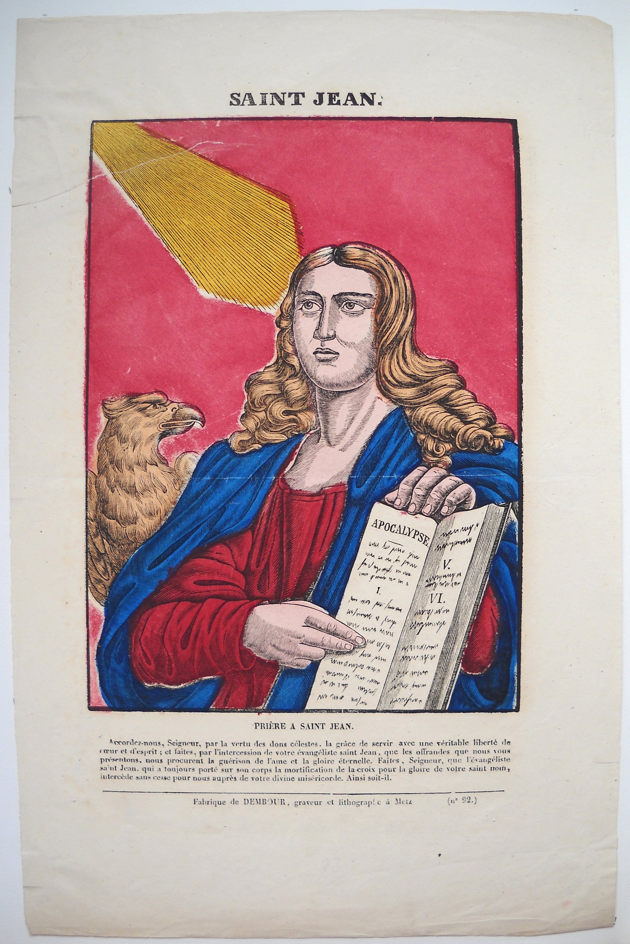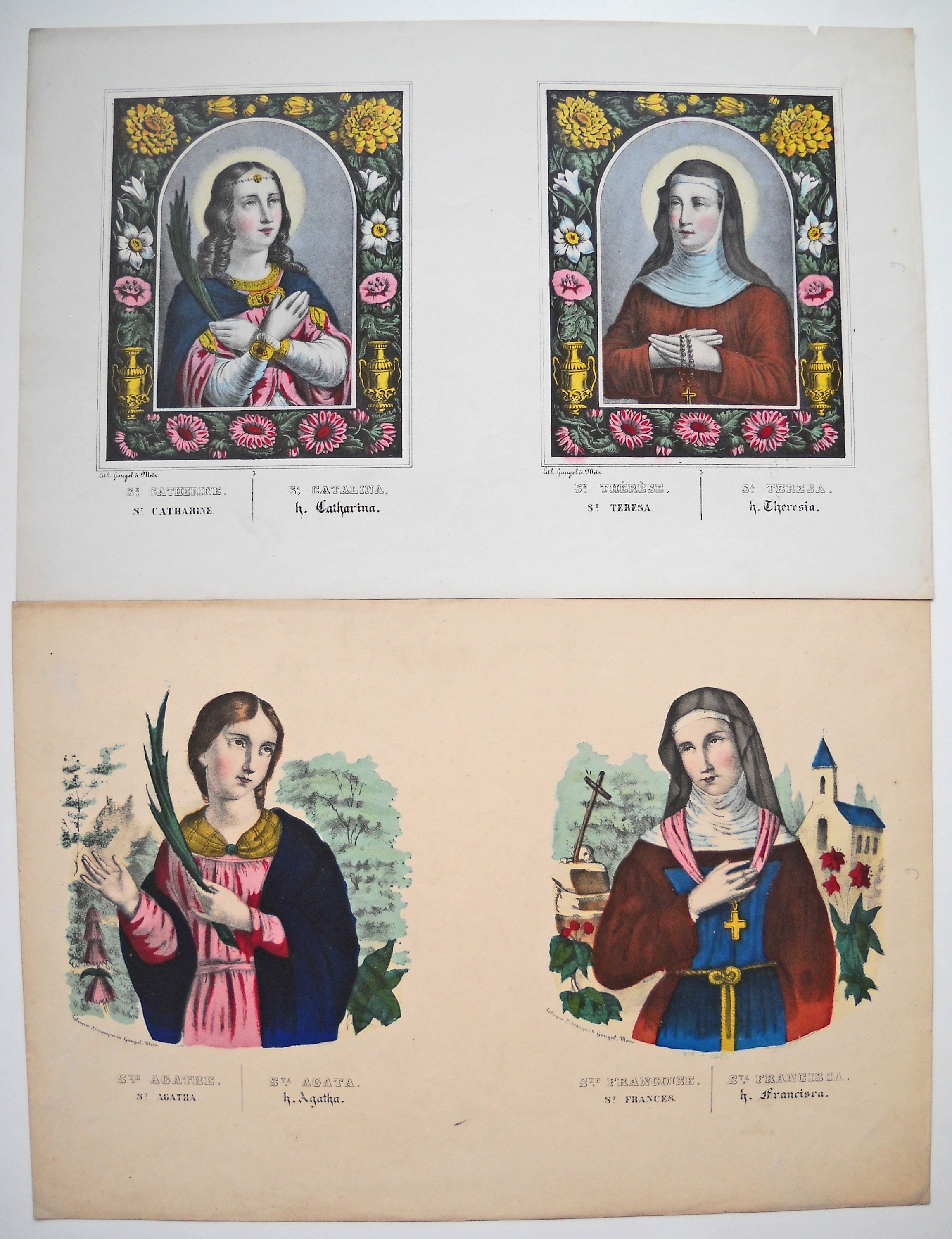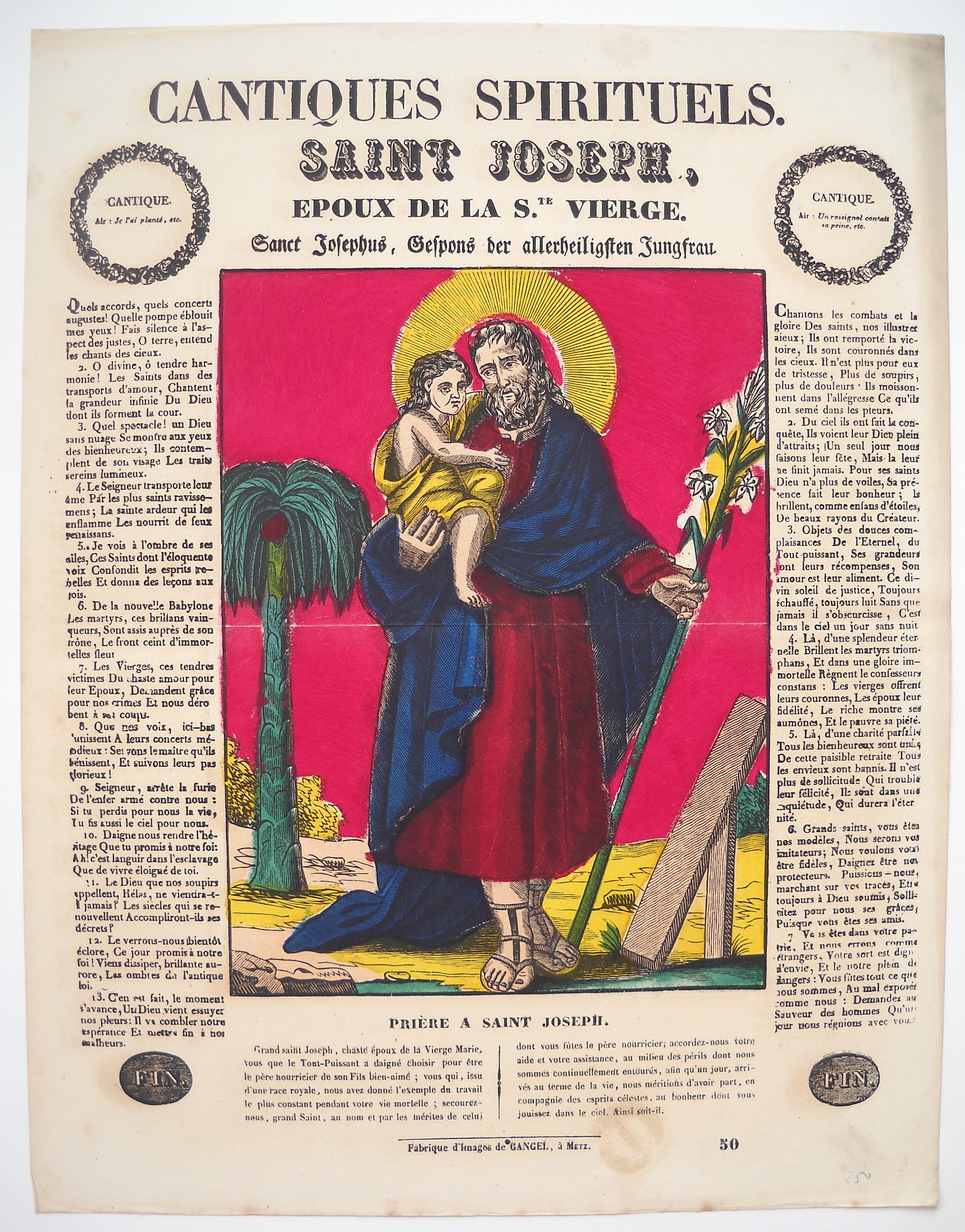 63 épreuves, gravures sur bois, xylographies et lithographies, sur papier mince, en noir ou coloris de l'époque, certaines placées sous passe-partout ou contrecollées sur carton épais, états moyen à TTB: " Planche à vignettes, 39,5 x 55 cm ; " LE JUGEMENT INJUSTE ", 36 x 49 cm - env. 42 x 32 cm et inverse: 2 ex. " L'ENFANT PRODIGUE " ; 4 ex. " PROCESSION DE LA FÊTE-DIEU " ; 12 planches à vignettes ou à compartiments de saintetés ; " JÉSUS MEURT POUR NOS PÉCHÉS " ; " S.C. DE JÉSUS " ; Série des " CANTIQUES SPIRITUELS ": " LA SAINTE FAMILLE ", " N.-S. JESUS CHRIST SUR LA CROIX ", TRÈS-S.-SACREMENT ", " SAINTE FRANÇOISE ", " SAINTE CLOTILDE ", " SAINTE PHILOMÈNE ", " N.-D. DE BONNE DÉLIVRANCE ", " SAINT JOSEPH ", " St CRÉPIN ET St CRÉPINIEN ", " SAINT ALEXIS " ; 3 ex. " SAINT JEAN-BAPTISTE " ; " INTÉRIEUR DE NAZARETH " ; " SAINTE BARBE / PATRONNE DES ARTILLEURS " ; " SAINTE GENEVIÈVE / PATRONNE DE PARIS " ; " SAINTE BARBE " ; " N.-D. DU PUY " ; " N.-D. DE MONTAIGU " ; " S.C. DE MARIE " ; " SAINT HONORÉ, / PATRON DES BOULANGERS " ; " SAINT LAURENT " ; 2 ex. " SAINT FIACRE / PATRON DES JARDINIERS " ; " SAINT BLAISE " ; " SAINT ANTOINE / PÈRE DES SOLITAIRES " ; " St JEAN " ; " St MAURICE " ; 2 ex. " SAINT JOSEPH " ; " JUGEMENT DE Ne Sr JESUS CHRIST " ; 2 planches à double image de saintes ; " NOTRE DAME DE LORETTE " ; " LE PETIT St JEAN " ; " St ROCH " ; " LA BENEDICTION DES FAMILLES / ET DES MAISONS " ; " St CHARLES-BOROMEE " ; " Ste FELICITE " ; " Ste MADELEINE " ; " ADORATION DES SACRES CURS ".