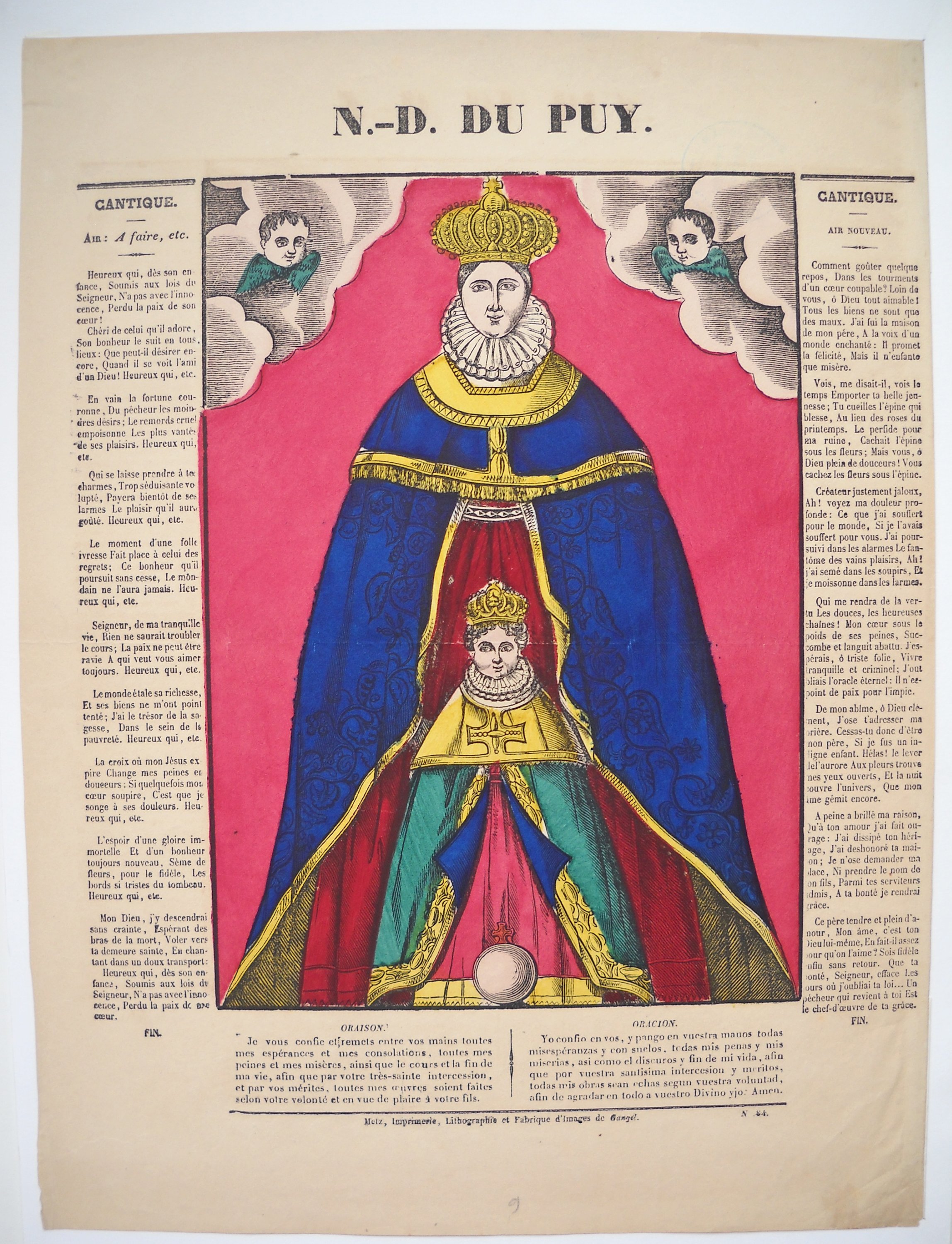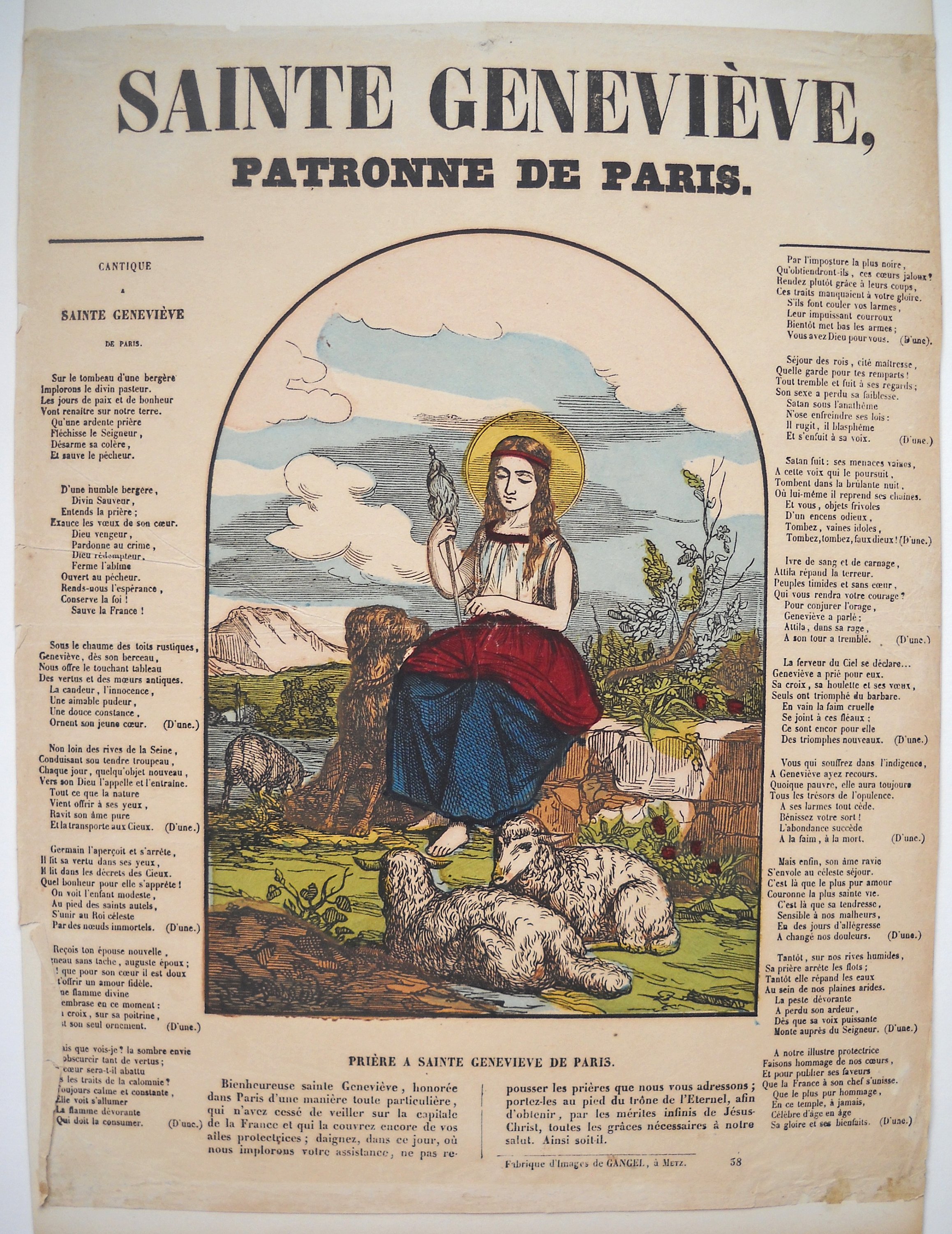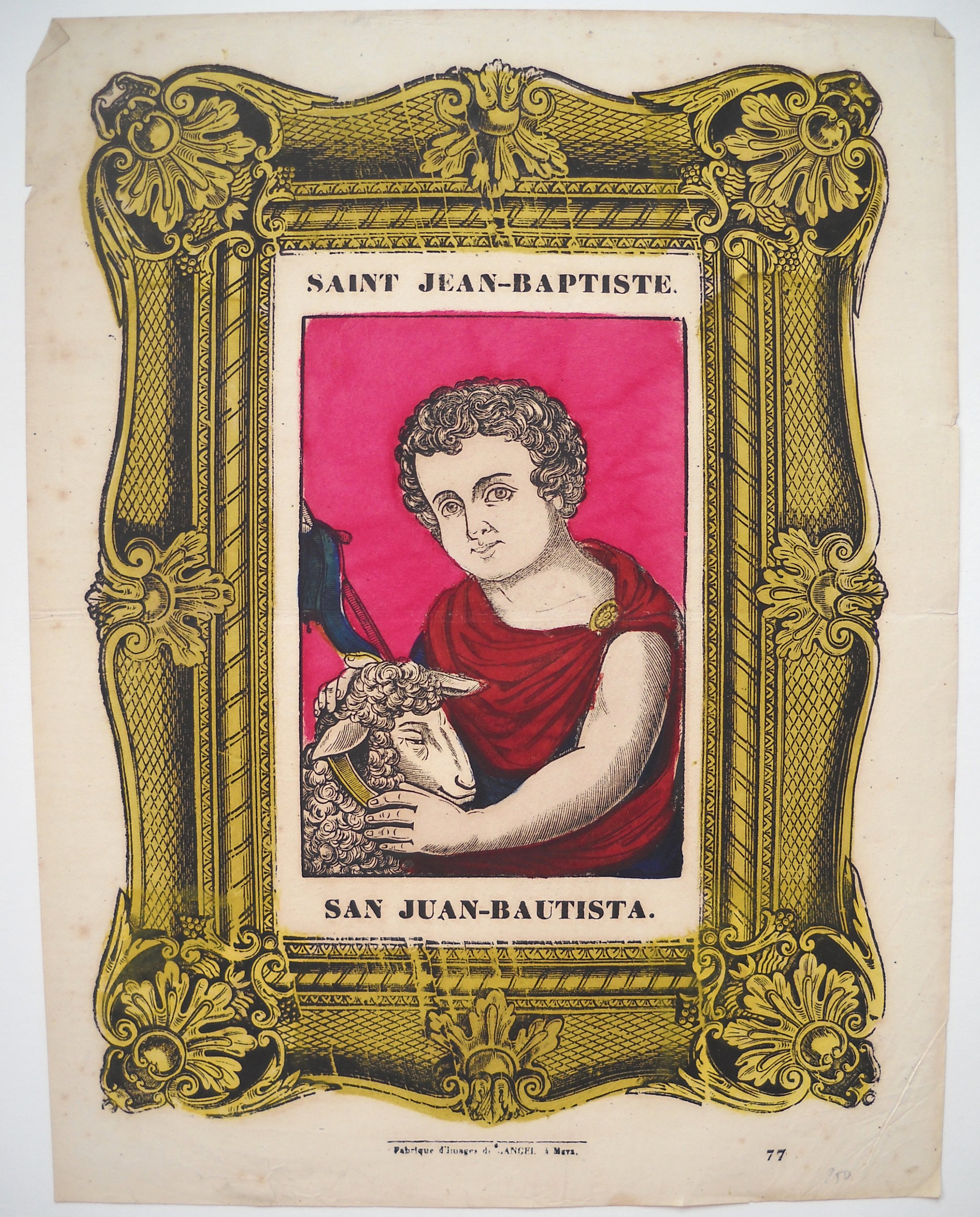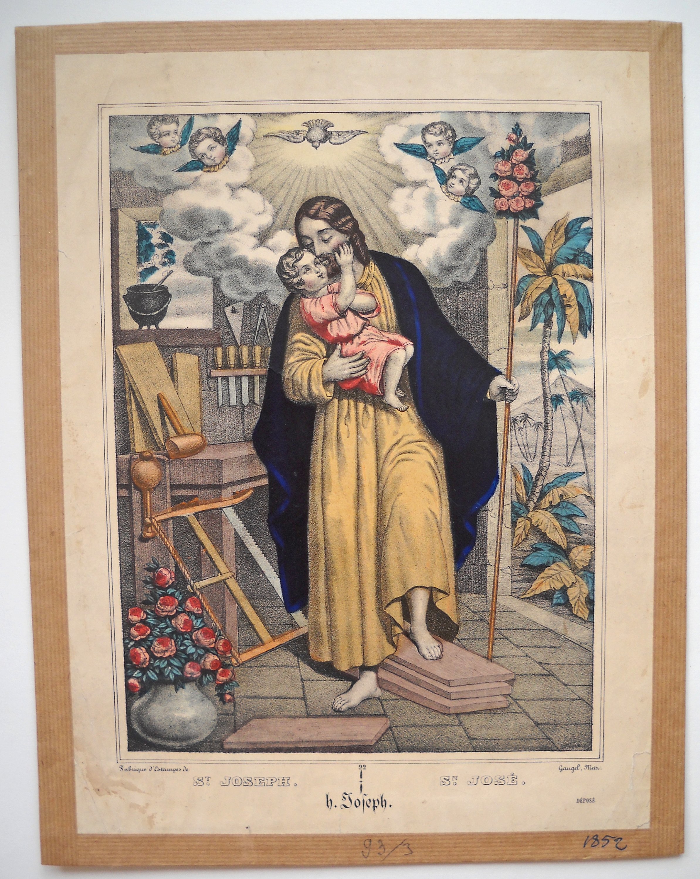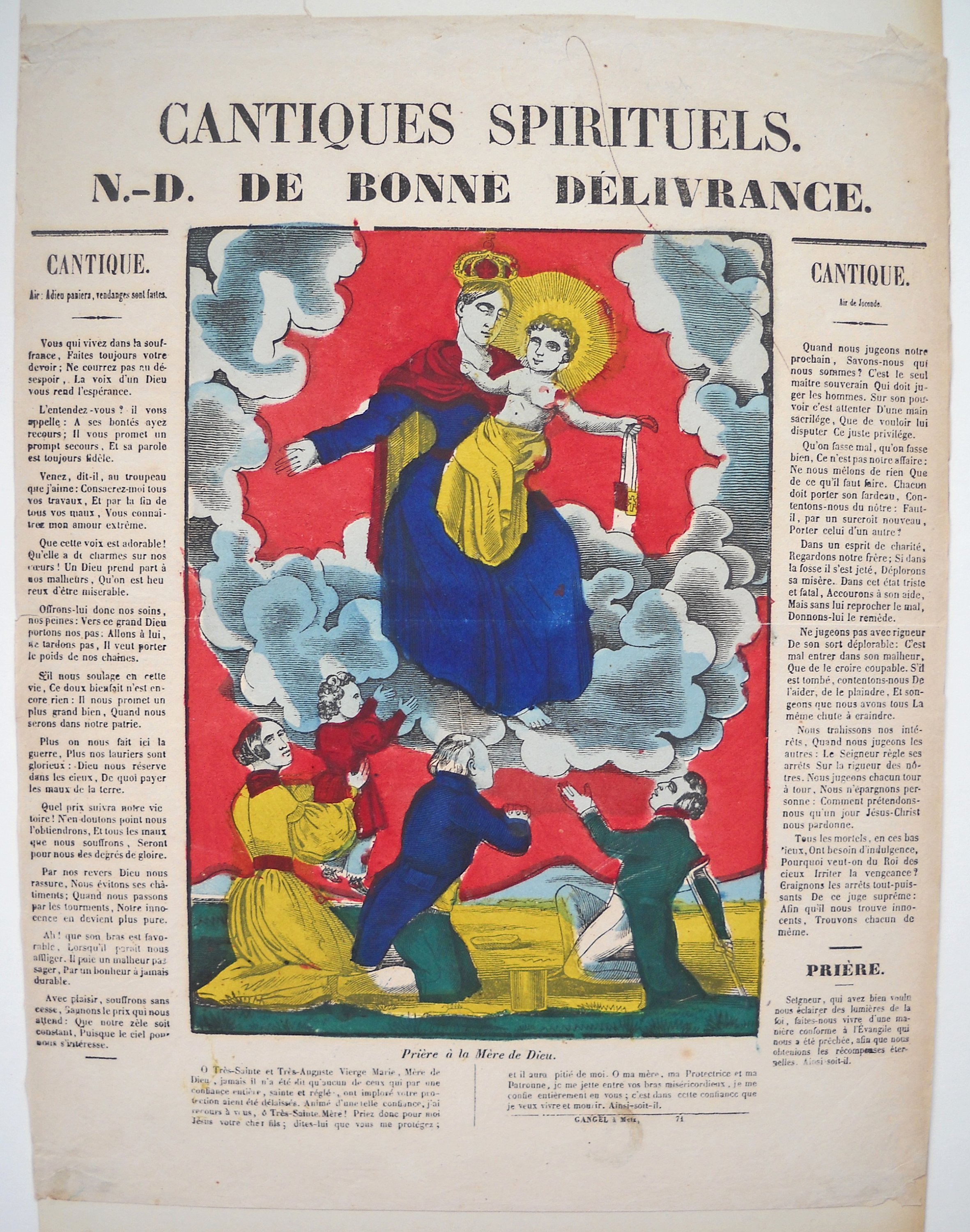 63 épreuves, gravures sur bois, xylographies et lithographies, sur papier mince, en noir ou coloris de l'époque, certaines placées sous passe-partout ou contrecollées sur carton épais, états moyen à TTB: " Planche à vignettes, 39,5 x 55 cm ; " LE JUGEMENT INJUSTE ", 36 x 49 cm - env. 42 x 32 cm et inverse: 2 ex. " L'ENFANT PRODIGUE " ; 4 ex. " PROCESSION DE LA FÊTE-DIEU " ; 12 planches à vignettes ou à compartiments de saintetés ; " JÉSUS MEURT POUR NOS PÉCHÉS " ; " S.C. DE JÉSUS " ; Série des " CANTIQUES SPIRITUELS ": " LA SAINTE FAMILLE ", " N.-S. JESUS CHRIST SUR LA CROIX ", TRÈS-S.-SACREMENT ", " SAINTE FRANÇOISE ", " SAINTE CLOTILDE ", " SAINTE PHILOMÈNE ", " N.-D. DE BONNE DÉLIVRANCE ", " SAINT JOSEPH ", " St CRÉPIN ET St CRÉPINIEN ", " SAINT ALEXIS " ; 3 ex. " SAINT JEAN-BAPTISTE " ; " INTÉRIEUR DE NAZARETH " ; " SAINTE BARBE / PATRONNE DES ARTILLEURS " ; " SAINTE GENEVIÈVE / PATRONNE DE PARIS " ; " SAINTE BARBE " ; " N.-D. DU PUY " ; " N.-D. DE MONTAIGU " ; " S.C. DE MARIE " ; " SAINT HONORÉ, / PATRON DES BOULANGERS " ; " SAINT LAURENT " ; 2 ex. " SAINT FIACRE / PATRON DES JARDINIERS " ; " SAINT BLAISE " ; " SAINT ANTOINE / PÈRE DES SOLITAIRES " ; " St JEAN " ; " St MAURICE " ; 2 ex. " SAINT JOSEPH " ; " JUGEMENT DE Ne Sr JESUS CHRIST " ; 2 planches à double image de saintes ; " NOTRE DAME DE LORETTE " ; " LE PETIT St JEAN " ; " St ROCH " ; " LA BENEDICTION DES FAMILLES / ET DES MAISONS " ; " St CHARLES-BOROMEE " ; " Ste FELICITE " ; " Ste MADELEINE " ; " ADORATION DES SACRES CURS ".