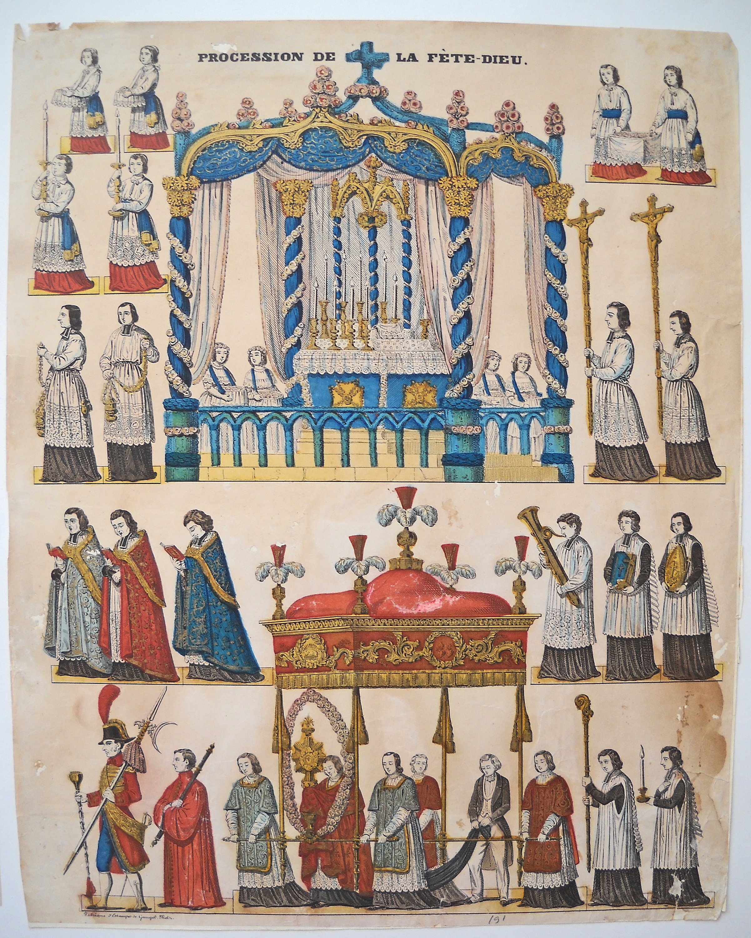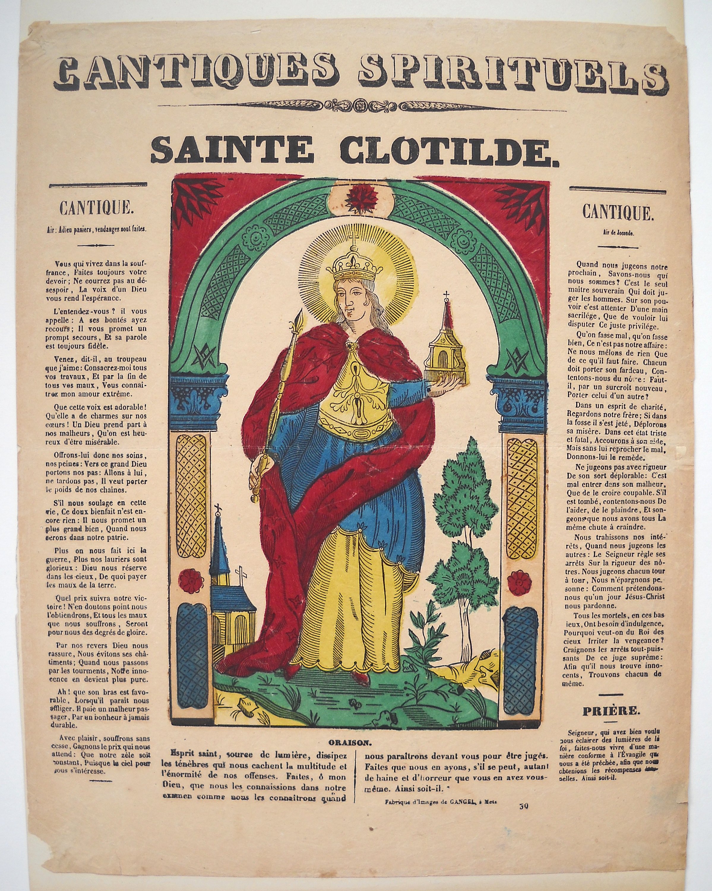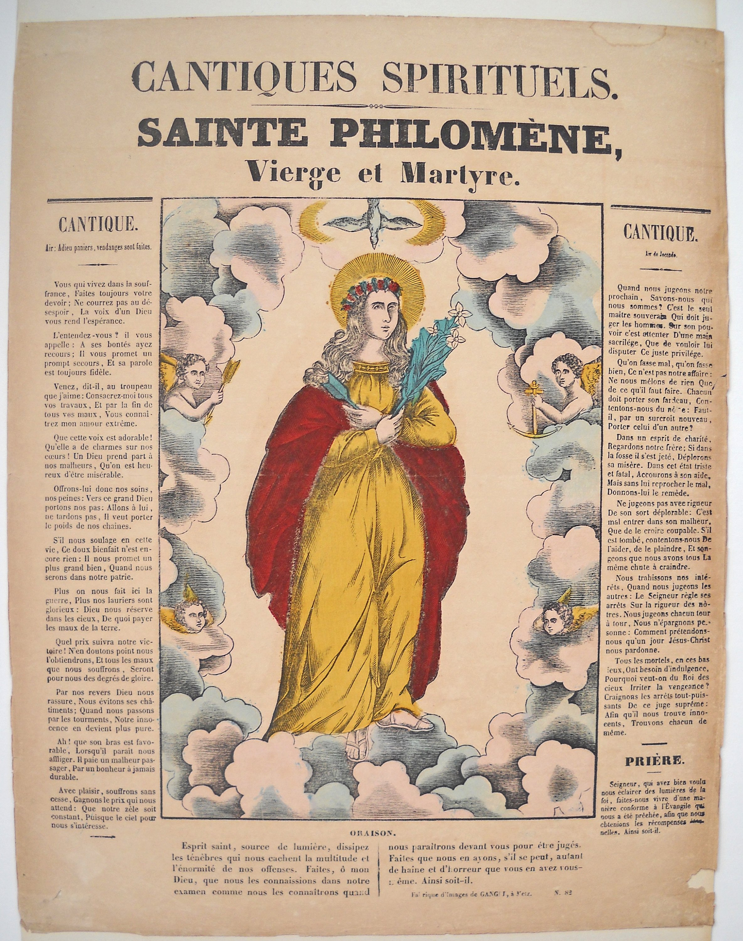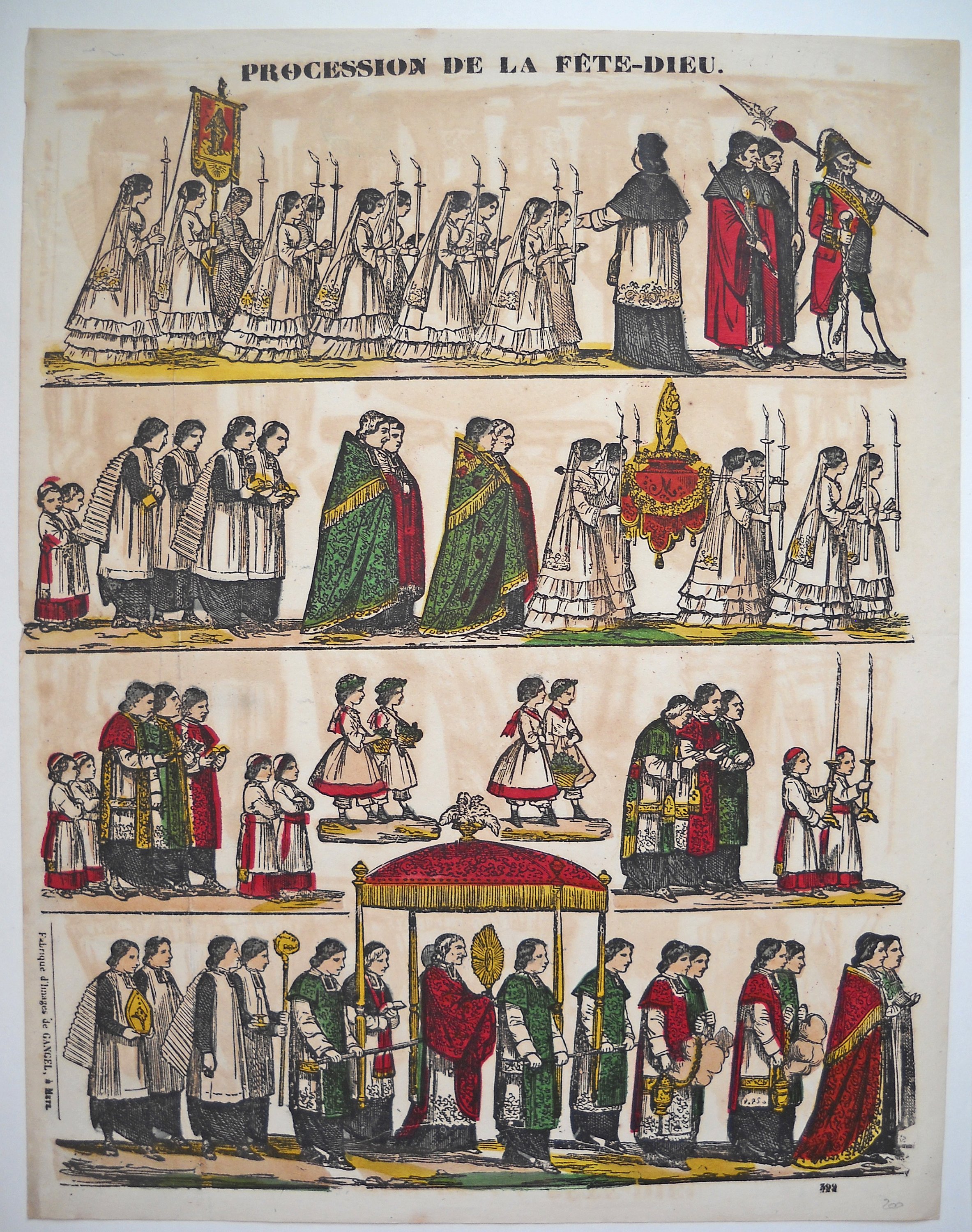 63 épreuves, gravures sur bois, xylographies et lithographies, sur papier mince, en noir ou coloris de l'époque, certaines placées sous passe-partout ou contrecollées sur carton épais, états moyen à TTB: " Planche à vignettes, 39,5 x 55 cm ; " LE JUGEMENT INJUSTE ", 36 x 49 cm - env. 42 x 32 cm et inverse: 2 ex. " L'ENFANT PRODIGUE " ; 4 ex. " PROCESSION DE LA FÊTE-DIEU " ; 12 planches à vignettes ou à compartiments de saintetés ; " JÉSUS MEURT POUR NOS PÉCHÉS " ; " S.C. DE JÉSUS " ; Série des " CANTIQUES SPIRITUELS ": " LA SAINTE FAMILLE ", " N.-S. JESUS CHRIST SUR LA CROIX ", TRÈS-S.-SACREMENT ", " SAINTE FRANÇOISE ", " SAINTE CLOTILDE ", " SAINTE PHILOMÈNE ", " N.-D. DE BONNE DÉLIVRANCE ", " SAINT JOSEPH ", " St CRÉPIN ET St CRÉPINIEN ", " SAINT ALEXIS " ; 3 ex. " SAINT JEAN-BAPTISTE " ; " INTÉRIEUR DE NAZARETH " ; " SAINTE BARBE / PATRONNE DES ARTILLEURS " ; " SAINTE GENEVIÈVE / PATRONNE DE PARIS " ; " SAINTE BARBE " ; " N.-D. DU PUY " ; " N.-D. DE MONTAIGU " ; " S.C. DE MARIE " ; " SAINT HONORÉ, / PATRON DES BOULANGERS " ; " SAINT LAURENT " ; 2 ex. " SAINT FIACRE / PATRON DES JARDINIERS " ; " SAINT BLAISE " ; " SAINT ANTOINE / PÈRE DES SOLITAIRES " ; " St JEAN " ; " St MAURICE " ; 2 ex. " SAINT JOSEPH " ; " JUGEMENT DE Ne Sr JESUS CHRIST " ; 2 planches à double image de saintes ; " NOTRE DAME DE LORETTE " ; " LE PETIT St JEAN " ; " St ROCH " ; " LA BENEDICTION DES FAMILLES / ET DES MAISONS " ; " St CHARLES-BOROMEE " ; " Ste FELICITE " ; " Ste MADELEINE " ; " ADORATION DES SACRES CURS ".