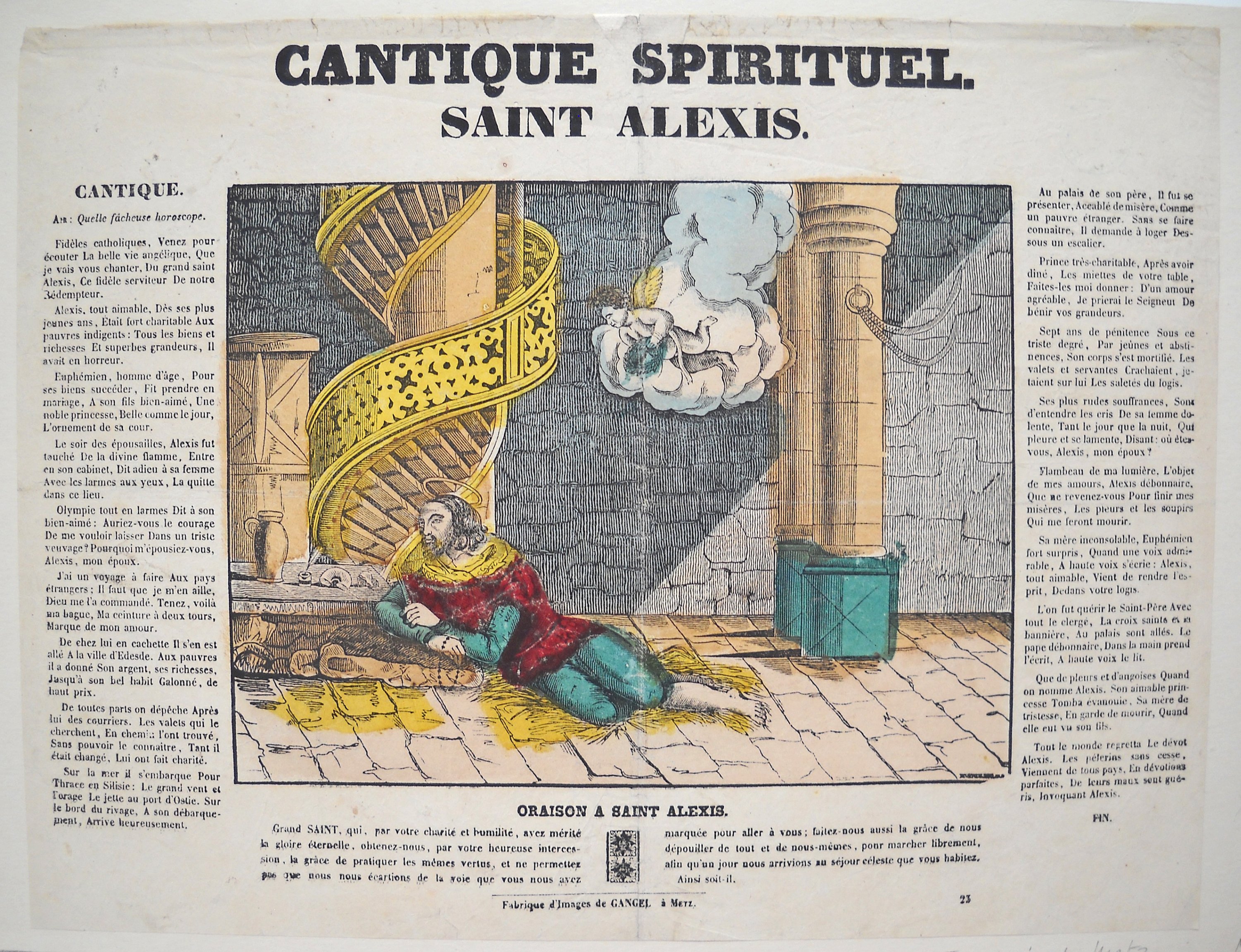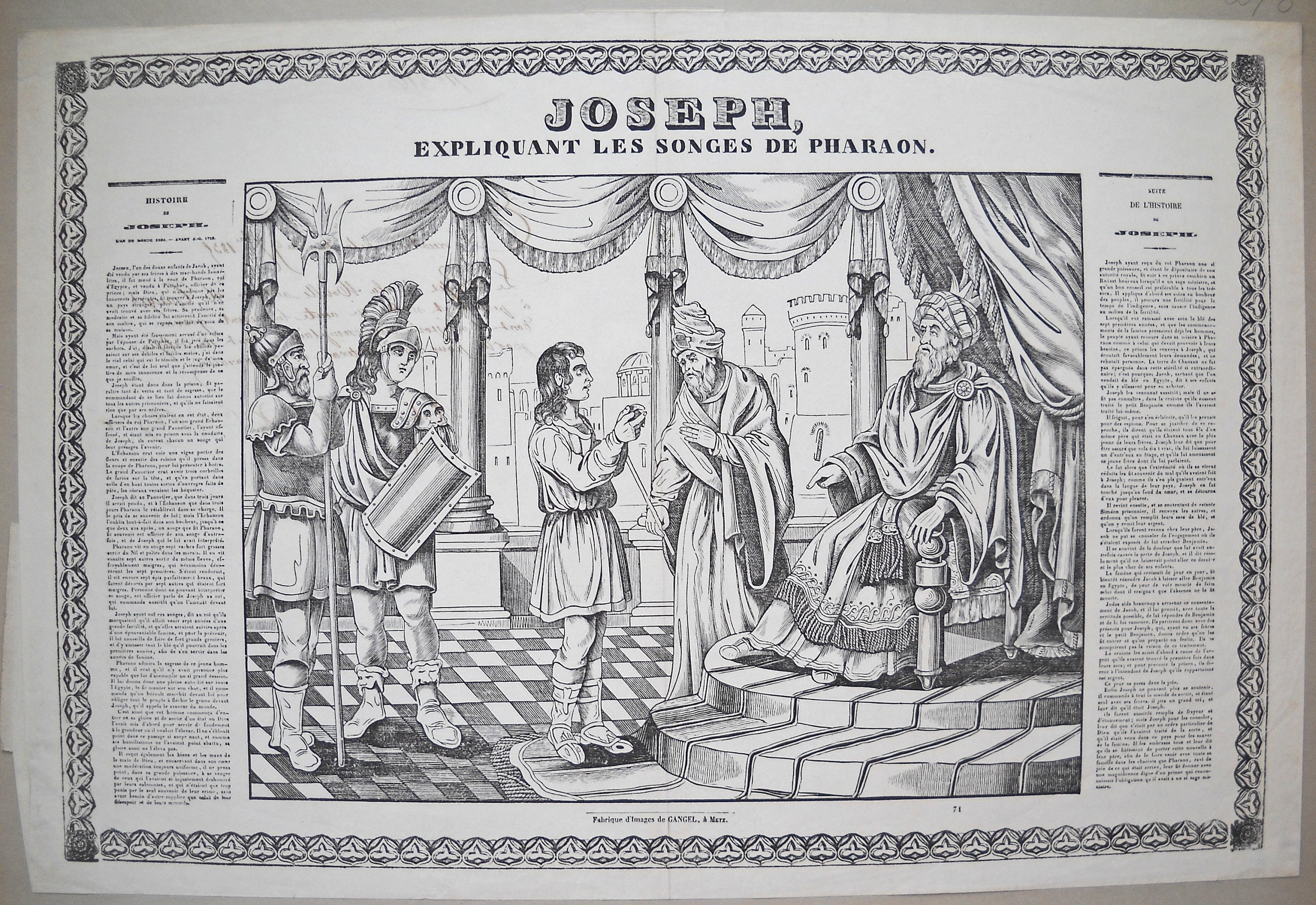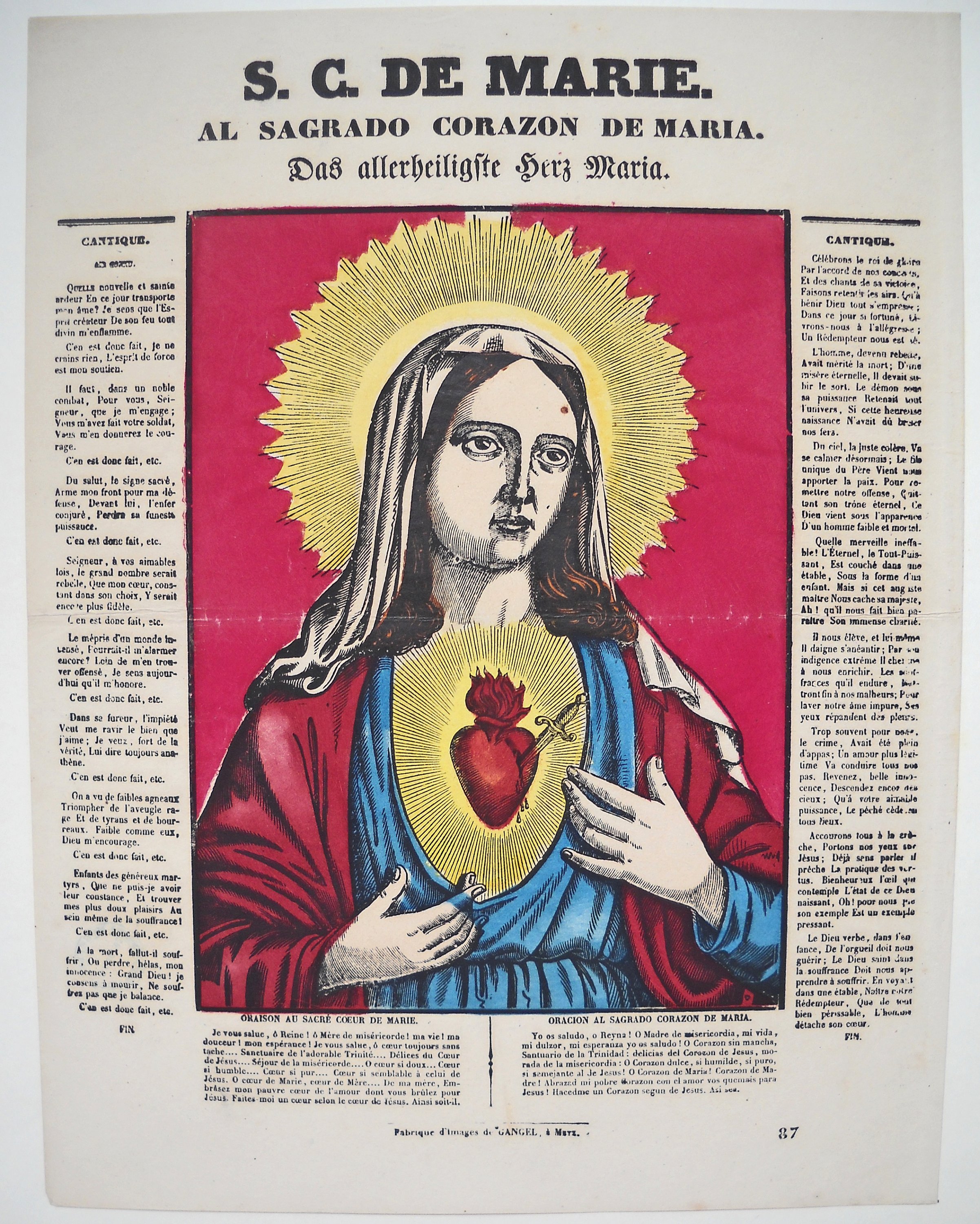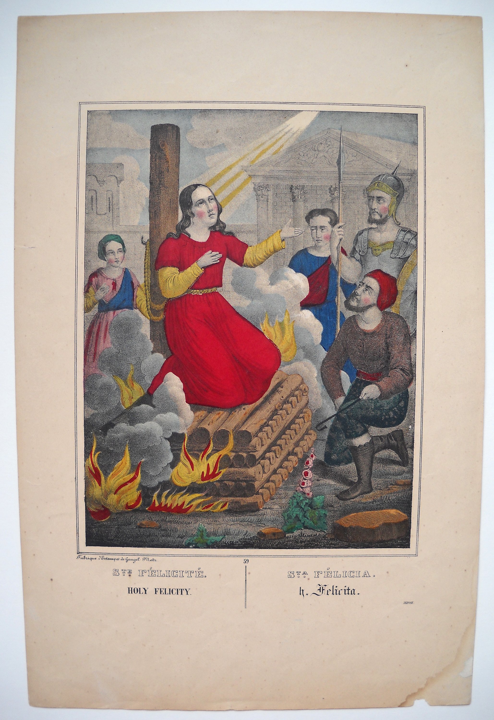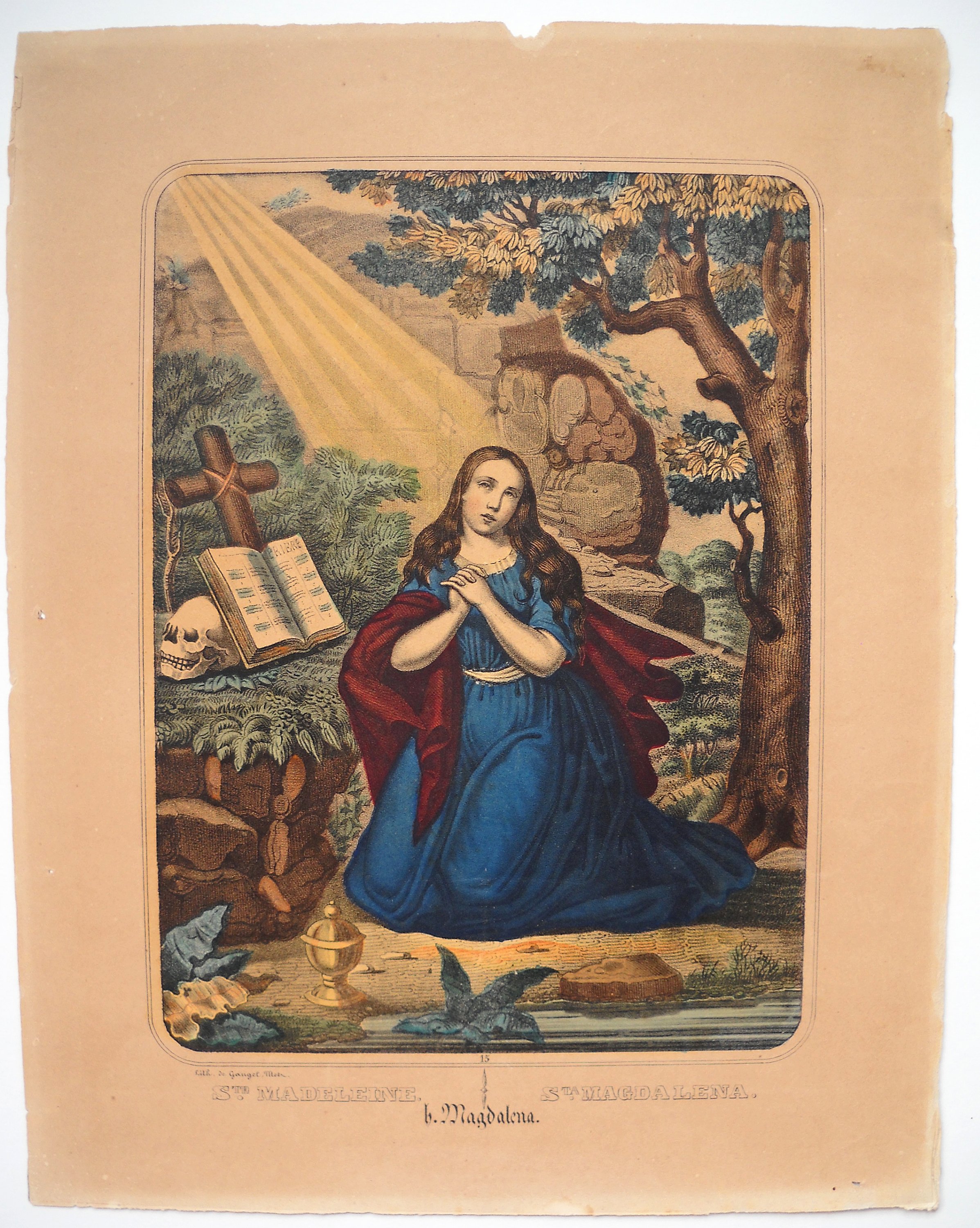 63 épreuves, gravures sur bois, xylographies et lithographies, sur papier mince, en noir ou coloris de l'époque, certaines placées sous passe-partout ou contrecollées sur carton épais, états moyen à TTB: " Planche à vignettes, 39,5 x 55 cm ; " LE JUGEMENT INJUSTE ", 36 x 49 cm - env. 42 x 32 cm et inverse: 2 ex. " L'ENFANT PRODIGUE " ; 4 ex. " PROCESSION DE LA FÊTE-DIEU " ; 12 planches à vignettes ou à compartiments de saintetés ; " JÉSUS MEURT POUR NOS PÉCHÉS " ; " S.C. DE JÉSUS " ; Série des " CANTIQUES SPIRITUELS ": " LA SAINTE FAMILLE ", " N.-S. JESUS CHRIST SUR LA CROIX ", TRÈS-S.-SACREMENT ", " SAINTE FRANÇOISE ", " SAINTE CLOTILDE ", " SAINTE PHILOMÈNE ", " N.-D. DE BONNE DÉLIVRANCE ", " SAINT JOSEPH ", " St CRÉPIN ET St CRÉPINIEN ", " SAINT ALEXIS " ; 3 ex. " SAINT JEAN-BAPTISTE " ; " INTÉRIEUR DE NAZARETH " ; " SAINTE BARBE / PATRONNE DES ARTILLEURS " ; " SAINTE GENEVIÈVE / PATRONNE DE PARIS " ; " SAINTE BARBE " ; " N.-D. DU PUY " ; " N.-D. DE MONTAIGU " ; " S.C. DE MARIE " ; " SAINT HONORÉ, / PATRON DES BOULANGERS " ; " SAINT LAURENT " ; 2 ex. " SAINT FIACRE / PATRON DES JARDINIERS " ; " SAINT BLAISE " ; " SAINT ANTOINE / PÈRE DES SOLITAIRES " ; " St JEAN " ; " St MAURICE " ; 2 ex. " SAINT JOSEPH " ; " JUGEMENT DE Ne Sr JESUS CHRIST " ; 2 planches à double image de saintes ; " NOTRE DAME DE LORETTE " ; " LE PETIT St JEAN " ; " St ROCH " ; " LA BENEDICTION DES FAMILLES / ET DES MAISONS " ; " St CHARLES-BOROMEE " ; " Ste FELICITE " ; " Ste MADELEINE " ; " ADORATION DES SACRES CURS ".