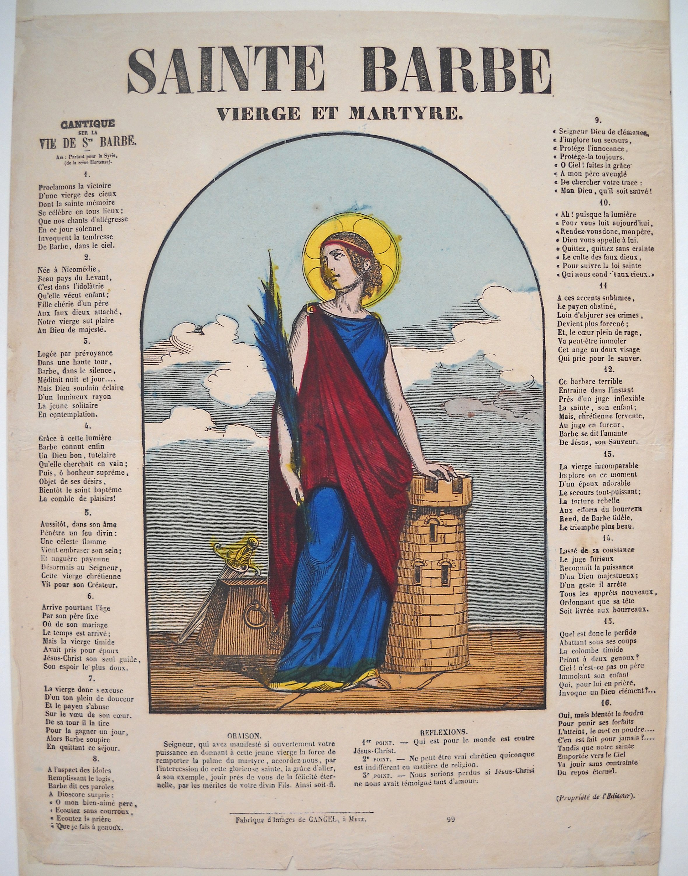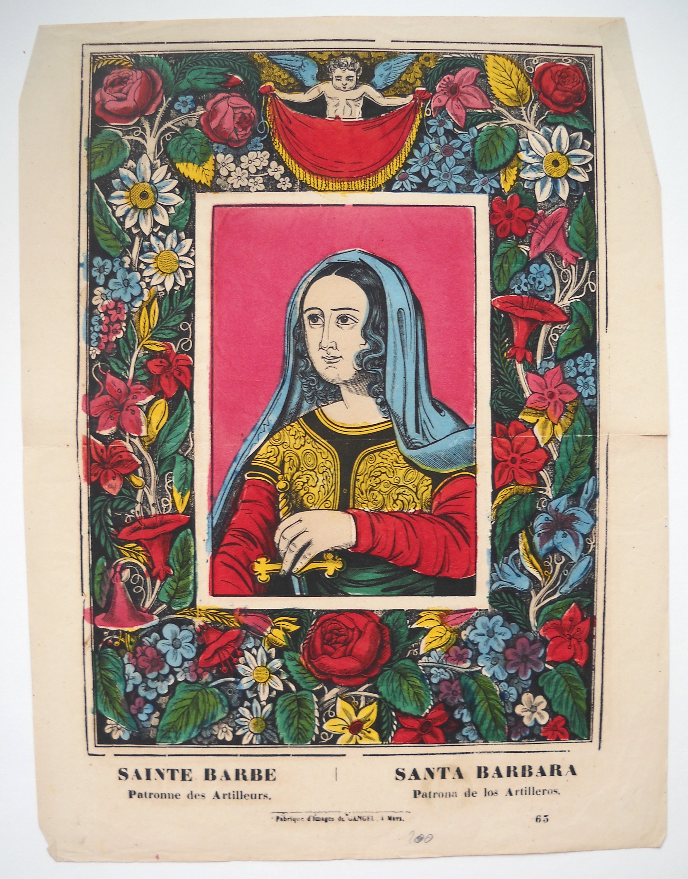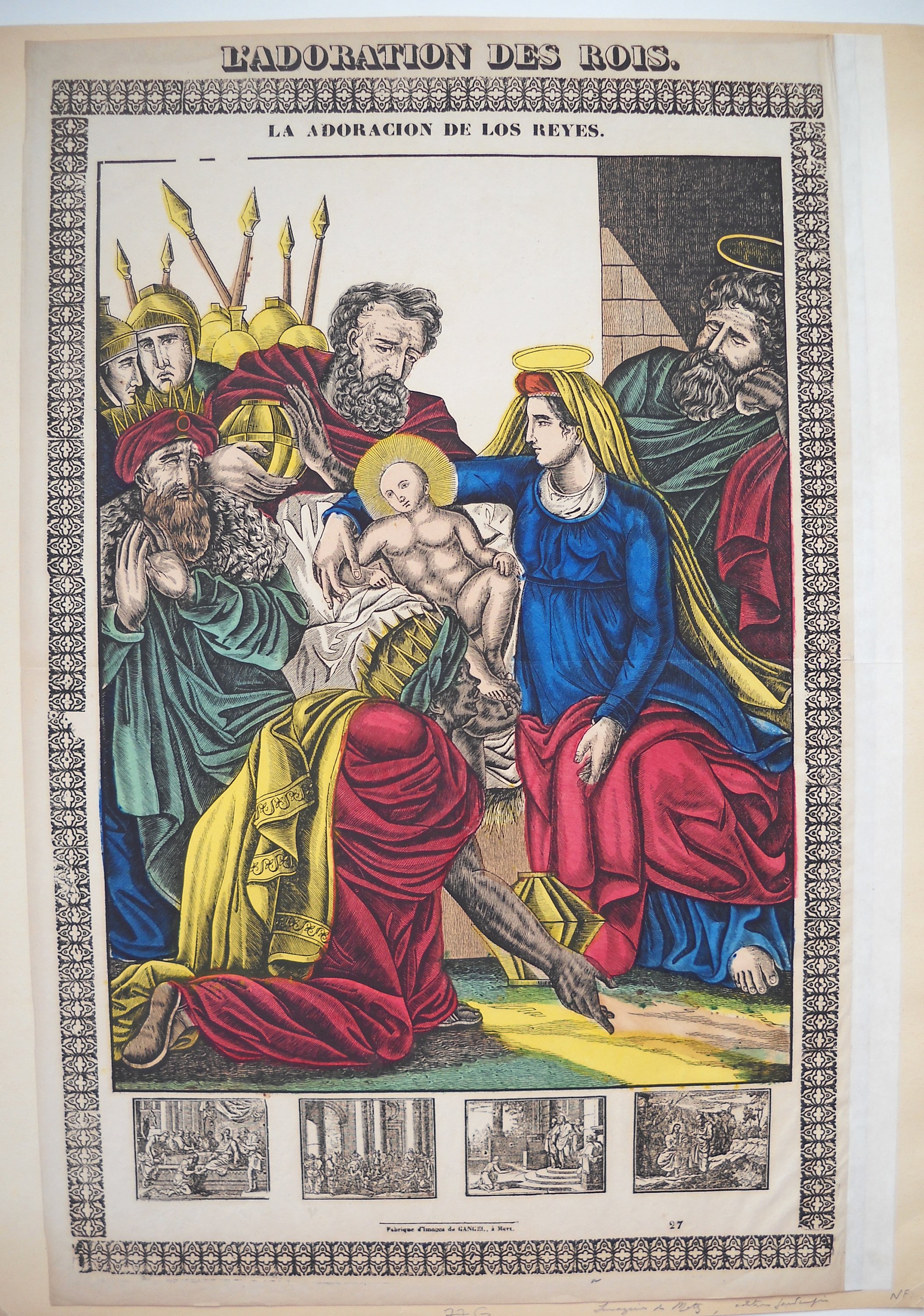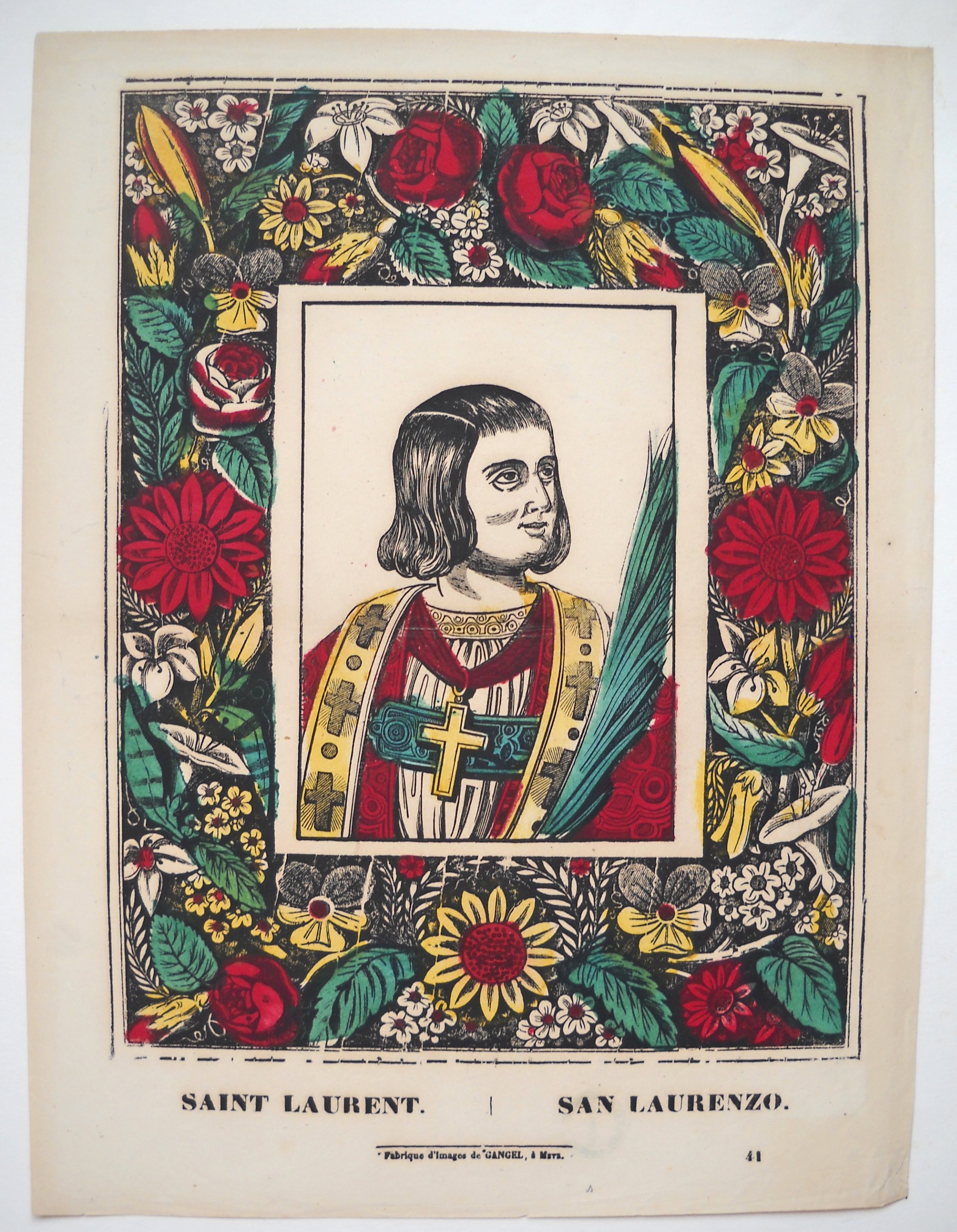 63 épreuves, gravures sur bois, xylographies et lithographies, sur papier mince, en noir ou coloris de l'époque, certaines placées sous passe-partout ou contrecollées sur carton épais, états moyen à TTB: " Planche à vignettes, 39,5 x 55 cm ; " LE JUGEMENT INJUSTE ", 36 x 49 cm - env. 42 x 32 cm et inverse: 2 ex. " L'ENFANT PRODIGUE " ; 4 ex. " PROCESSION DE LA FÊTE-DIEU " ; 12 planches à vignettes ou à compartiments de saintetés ; " JÉSUS MEURT POUR NOS PÉCHÉS " ; " S.C. DE JÉSUS " ; Série des " CANTIQUES SPIRITUELS ": " LA SAINTE FAMILLE ", " N.-S. JESUS CHRIST SUR LA CROIX ", TRÈS-S.-SACREMENT ", " SAINTE FRANÇOISE ", " SAINTE CLOTILDE ", " SAINTE PHILOMÈNE ", " N.-D. DE BONNE DÉLIVRANCE ", " SAINT JOSEPH ", " St CRÉPIN ET St CRÉPINIEN ", " SAINT ALEXIS " ; 3 ex. " SAINT JEAN-BAPTISTE " ; " INTÉRIEUR DE NAZARETH " ; " SAINTE BARBE / PATRONNE DES ARTILLEURS " ; " SAINTE GENEVIÈVE / PATRONNE DE PARIS " ; " SAINTE BARBE " ; " N.-D. DU PUY " ; " N.-D. DE MONTAIGU " ; " S.C. DE MARIE " ; " SAINT HONORÉ, / PATRON DES BOULANGERS " ; " SAINT LAURENT " ; 2 ex. " SAINT FIACRE / PATRON DES JARDINIERS " ; " SAINT BLAISE " ; " SAINT ANTOINE / PÈRE DES SOLITAIRES " ; " St JEAN " ; " St MAURICE " ; 2 ex. " SAINT JOSEPH " ; " JUGEMENT DE Ne Sr JESUS CHRIST " ; 2 planches à double image de saintes ; " NOTRE DAME DE LORETTE " ; " LE PETIT St JEAN " ; " St ROCH " ; " LA BENEDICTION DES FAMILLES / ET DES MAISONS " ; " St CHARLES-BOROMEE " ; " Ste FELICITE " ; " Ste MADELEINE " ; " ADORATION DES SACRES CURS ".