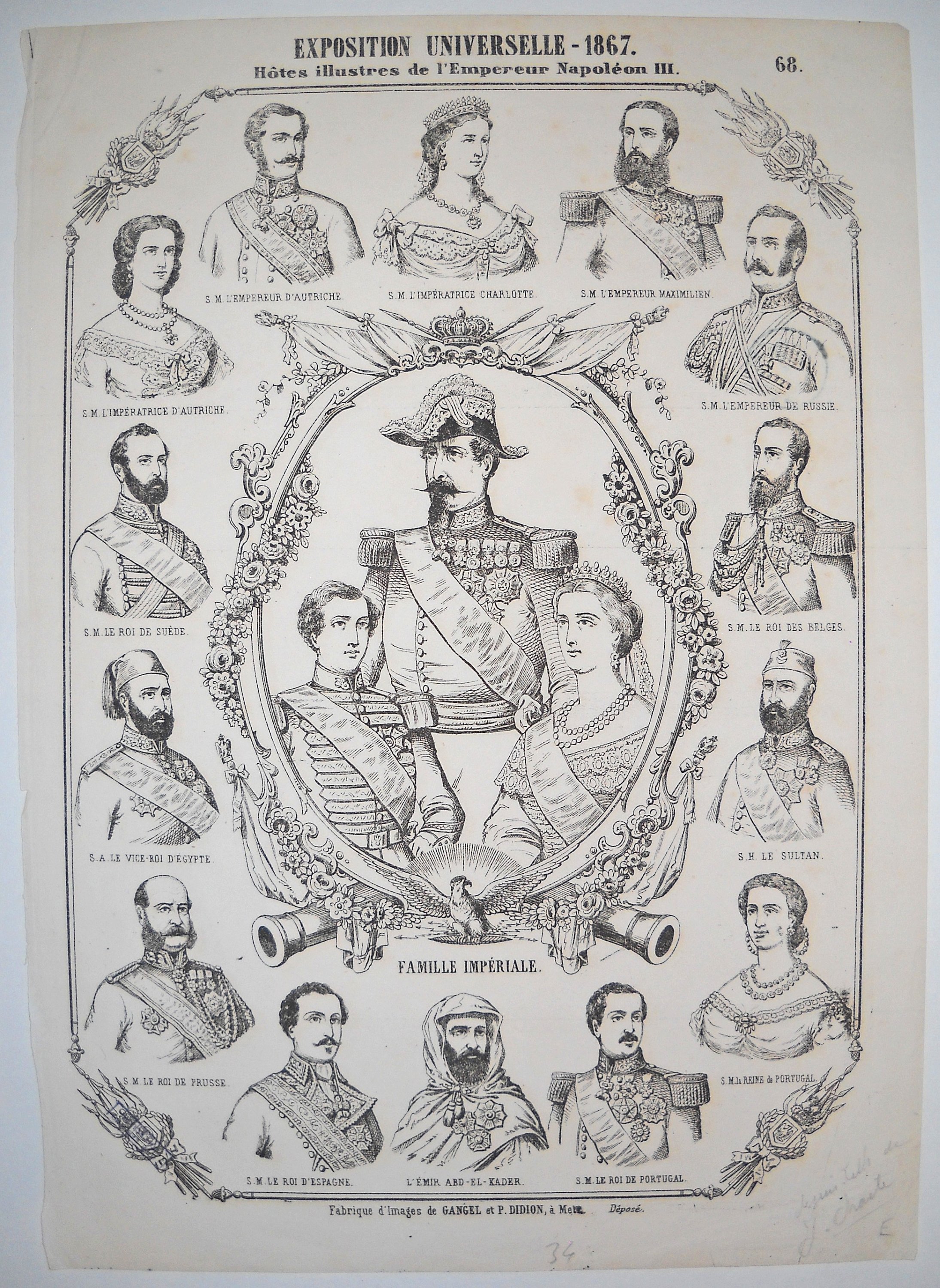 61 épreuves, xylographie et lithographie à la plume, sur papier mince, en noir ou coloris de l'époque, certaines placées sous passe-partout ou contrecollées sur carton épais, états moyen à TTB ; contes, chansons, historiettes, actualités, costumes, etc, dont " ATTENTAT DU POLONAIS BEREZOWSKI SUR LE CSAR ALEXANDRE II " ; " EXPOSITION UNIVERSELLE - 1867 " ; " LE TEMPS DE L'AMOUR " ; " GRANDE PROCESSION DE St JOSEPH " ; " AUX COURSES " ; " VIE DE M. TROPPMANN " ; " IL PLEUT, BERGERE " ; " LA MEUNIERE " ; " LA MERE BONTEMPS " ; " LA JEUNE BATELIERE " ; " POLICHINEL DOCTEUR " ; " LA MODE NOUVELLE " ; " FINETTE CENDRON " ; " PHYSIOLOGIE DES ANIMAUX " ; " M. et Mme CROQUEMITAINE " ; " SAINT ROCH (complainte) MALGRÉ LA BATAILLE " ; etc. Qqs multiples.