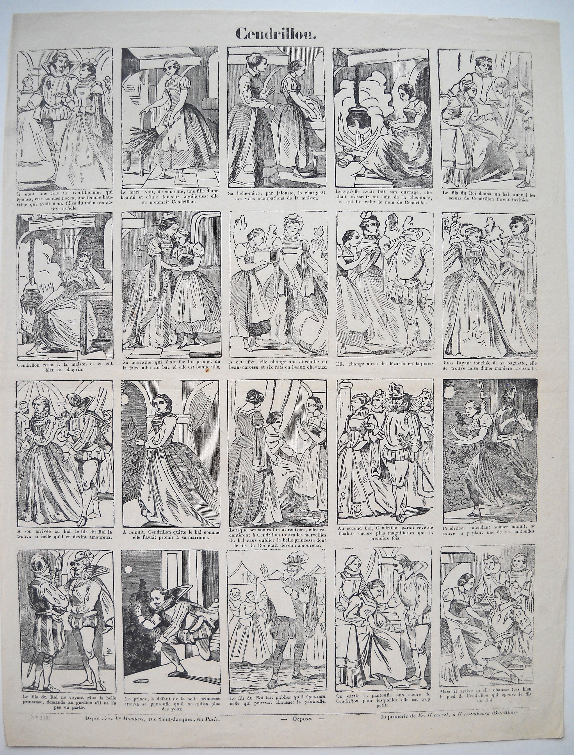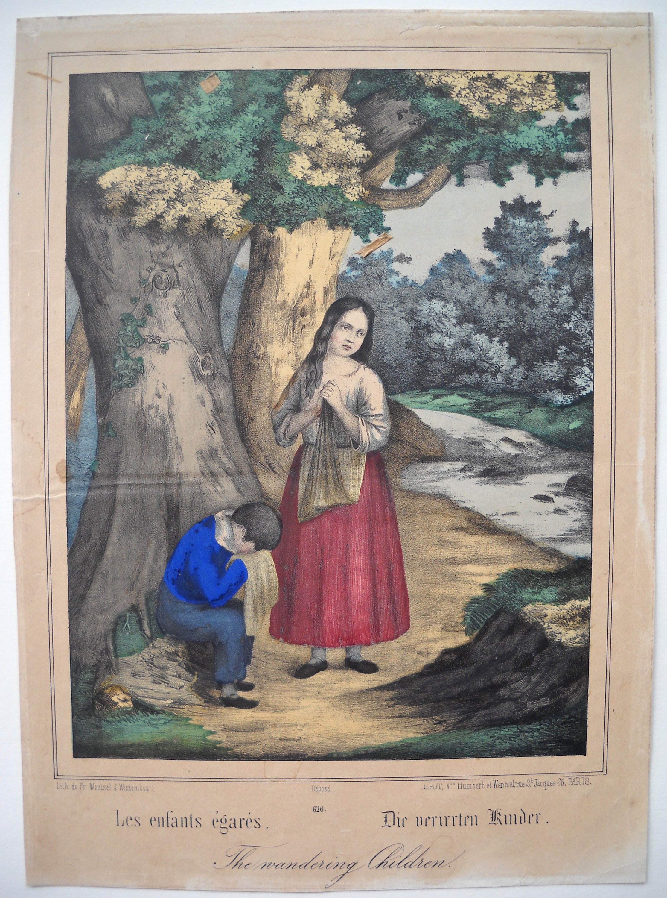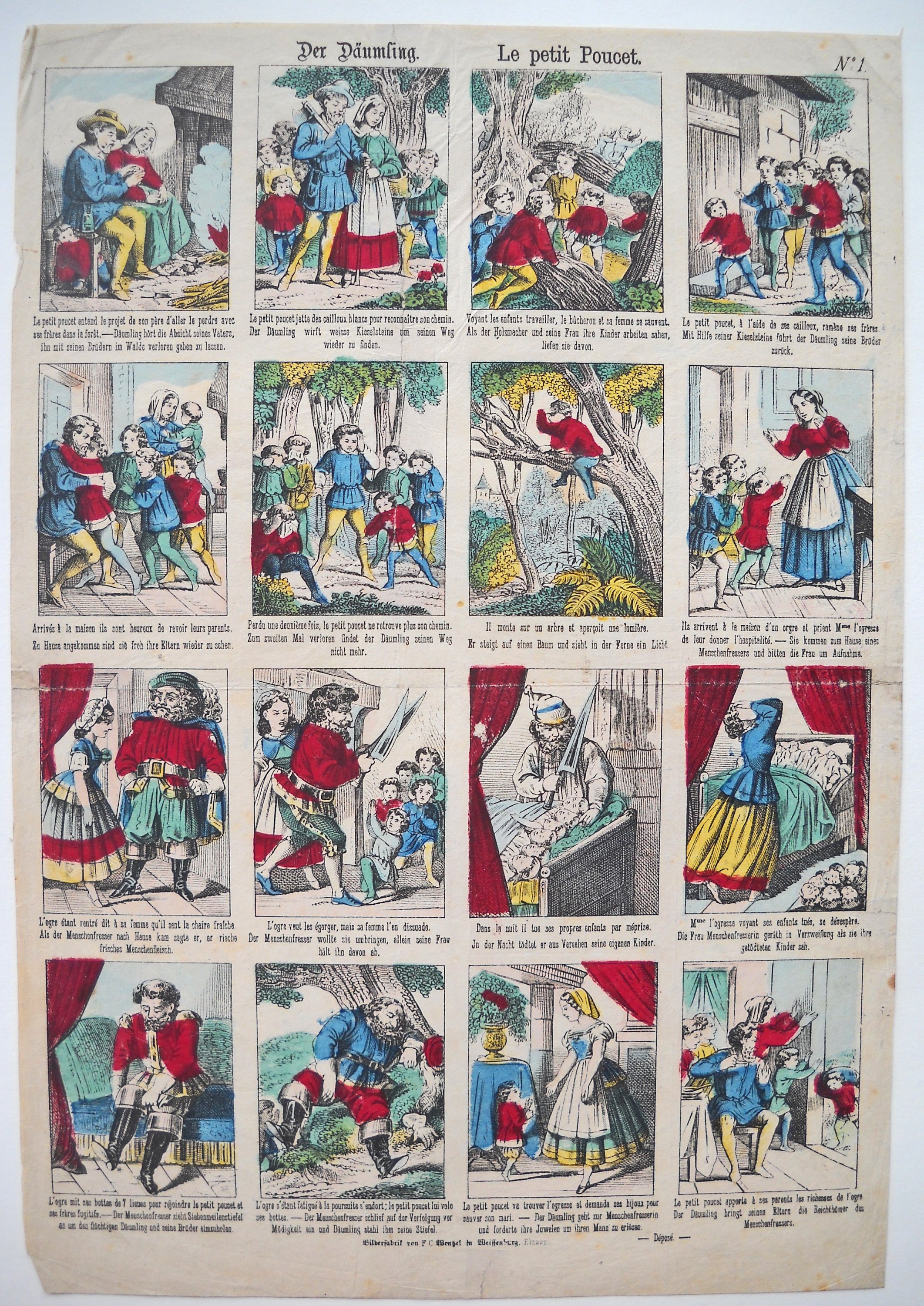 Lot de 69 épreuves, gravures sur bois et lithographies, en majorité rehaussées de coloris d'époque légendées en français, en allemand, en anglais ou hollandais, certaines contrecollées sur carton épais, formats divers, états B à TTB, dont 8 gravures sur bois: " JÉSUS MEURT POUR NOS PÉCHÉS ", 42 x 32 cm ; 5 planches d'ombres chinoises ; " DAMON et HENRIETTE " ; " L'ENFANT PRODIGUE " - 20 lithographies à la craie: " " LES CINQ PARTIES DU MONDE " ; " Les enfants égarés " ; " La promenade sur le lac " ; " LE NAUFRAGE DU VENGEUR " ; " Le départ du conscrit " ; " Apparition du Sacré Cur à Marie Marguerite " ; etc - 16 lithographies à la plume: " Das Christbaumspiel " ; 3 planches d'historiettes enfantines dont " Le meunier, son fils et l'âne " ; " LES GRANDES EAUX DE VERSAILLES " ; " HISTOIRE DU SEIGNEUR BARBE BLEUE " ; " Cendrillon " ; " La Fée des broussailles " ; " Bobêche et Galimafré " ; " Histoire de Martin-Pêcheur " ; " Le chat Botté " ; " MAMAN CONFITURE " ; " Le Petit Poucet " ; etc. - 23 planches d'historiettes légendées en allemand et en hollandais (1 ex.), édit. C. Burckardt - 22 planches d'historiettes en allemand, édit. Ackermann.