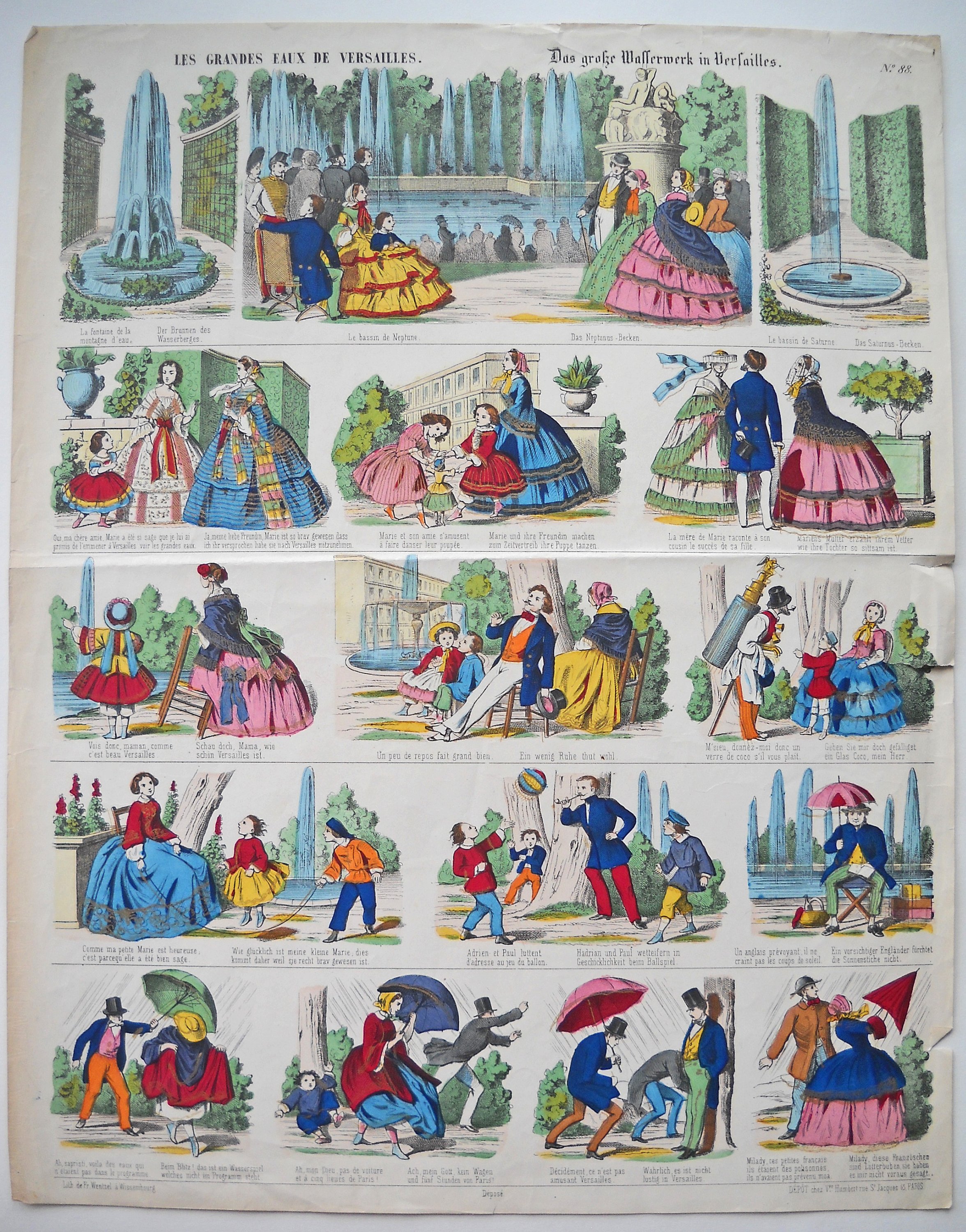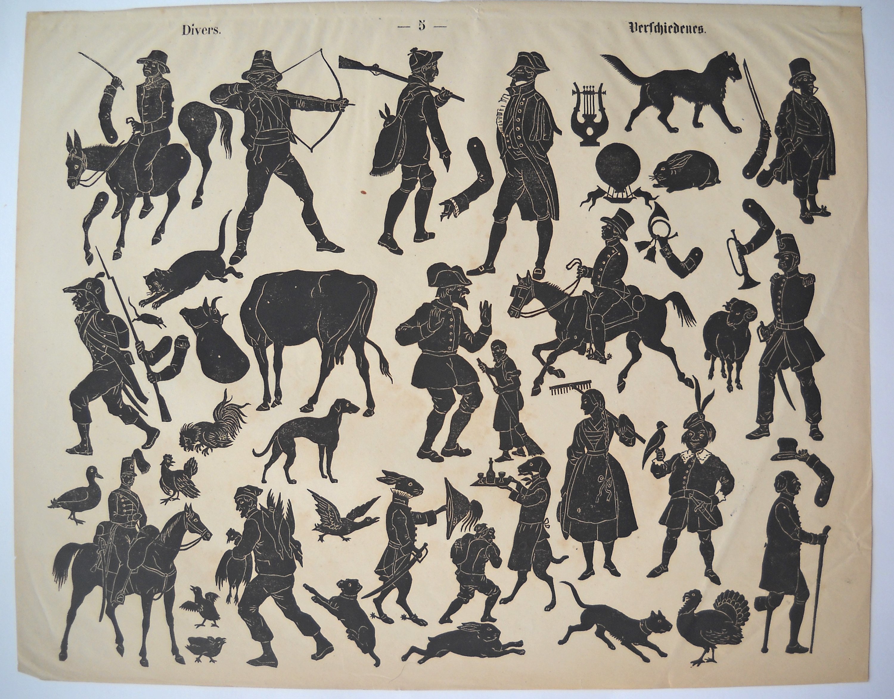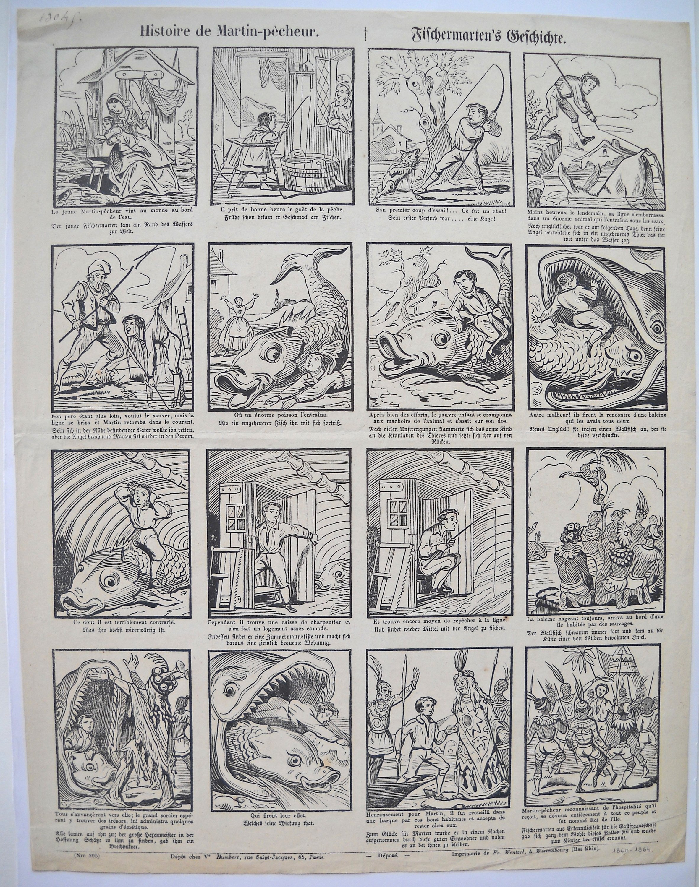 Lot de 69 épreuves, gravures sur bois et lithographies, en majorité rehaussées de coloris d'époque légendées en français, en allemand, en anglais ou hollandais, certaines contrecollées sur carton épais, formats divers, états B à TTB, dont 8 gravures sur bois: " JÉSUS MEURT POUR NOS PÉCHÉS ", 42 x 32 cm ; 5 planches d'ombres chinoises ; " DAMON et HENRIETTE " ; " L'ENFANT PRODIGUE " - 20 lithographies à la craie: " " LES CINQ PARTIES DU MONDE " ; " Les enfants égarés " ; " La promenade sur le lac " ; " LE NAUFRAGE DU VENGEUR " ; " Le départ du conscrit " ; " Apparition du Sacré Cur à Marie Marguerite " ; etc - 16 lithographies à la plume: " Das Christbaumspiel " ; 3 planches d'historiettes enfantines dont " Le meunier, son fils et l'âne " ; " LES GRANDES EAUX DE VERSAILLES " ; " HISTOIRE DU SEIGNEUR BARBE BLEUE " ; " Cendrillon " ; " La Fée des broussailles " ; " Bobêche et Galimafré " ; " Histoire de Martin-Pêcheur " ; " Le chat Botté " ; " MAMAN CONFITURE " ; " Le Petit Poucet " ; etc. - 23 planches d'historiettes légendées en allemand et en hollandais (1 ex.), édit. C. Burckardt - 22 planches d'historiettes en allemand, édit. Ackermann.