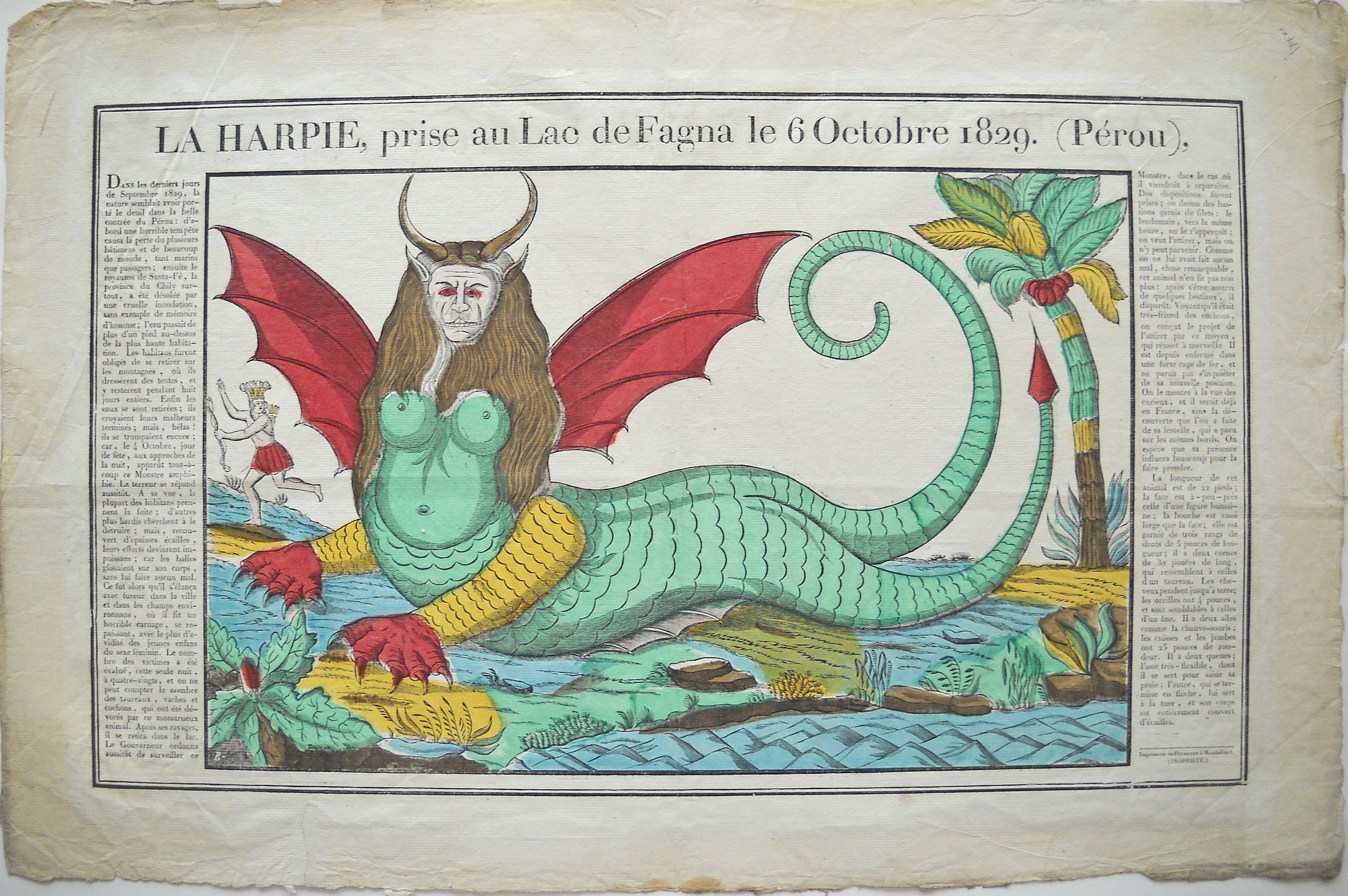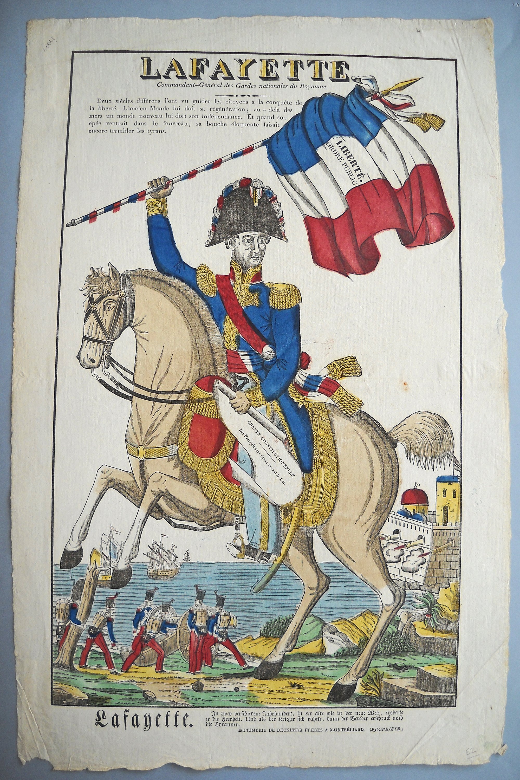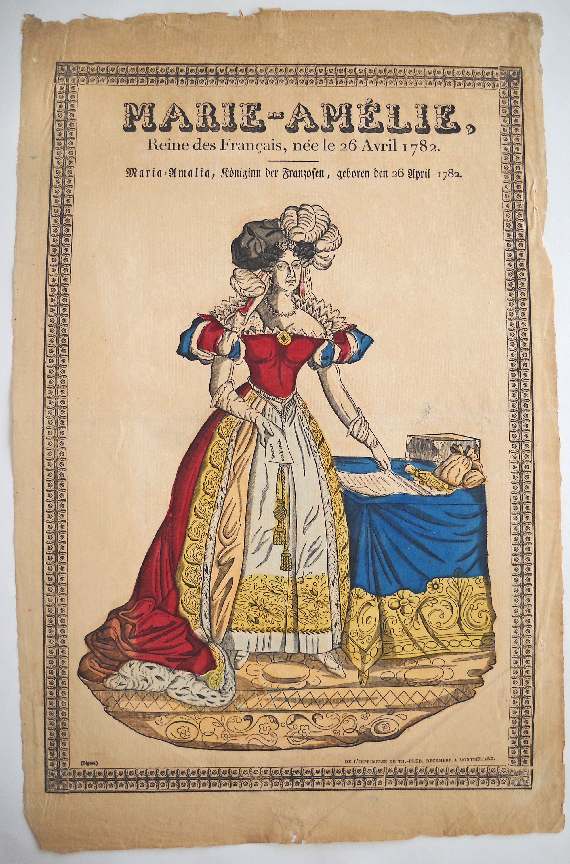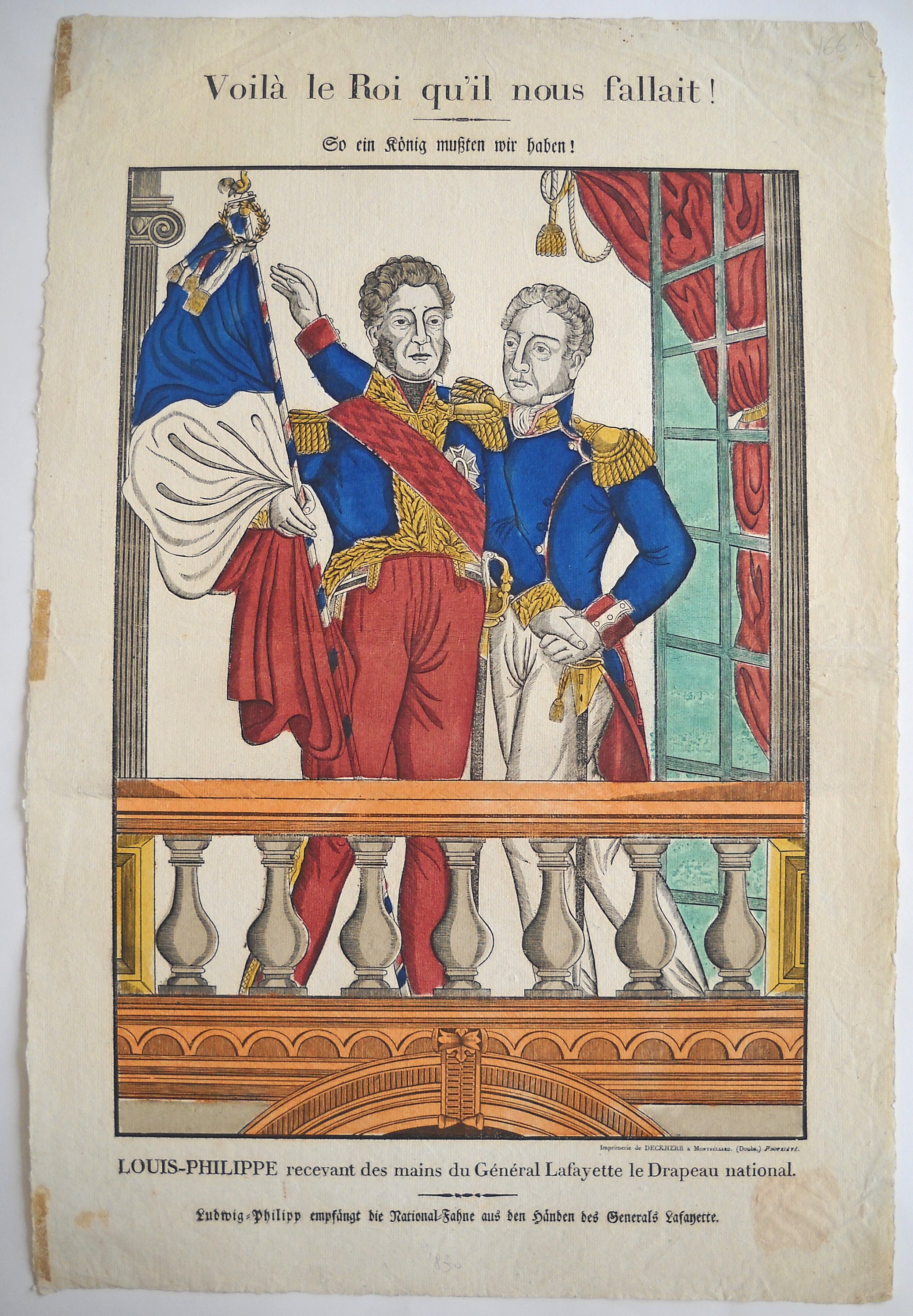 6 épreuves, gravures sur bois, coloris d'époque, sur papier vergé, placées sous passe-partout: " MARIE-AMÉLIE, Reine des Français, née le 26 avril 1782 ", 65,5 x 41,5 cm (plis, insolée, rest.) - " Voilà le Roi qu'il nous fallait! ", texte bilingue en allemand, Lafayette étreignant le roi Louis-Philippe, 63,5 x 42 cm (légers plis) - " MORT ET CONVOI DE L'INVINCIBLE MALBOROUGH ", 59 x 35,5 cm (plis, taches) - " LA HARPIE, prise au Lac de Fagna le 6 octobre 1829 (Pérou) ", 44,5 x 67,5 cm (plis) - " LAFAYETTE ", texte bilingue en allemand, 64 x 41 cm (plis, petits manques hors texte) - " L'Horloge de la Passion ", dépôt légal en juillet 1826, 55,5 x 32,5 cm (marges courtes, manques).