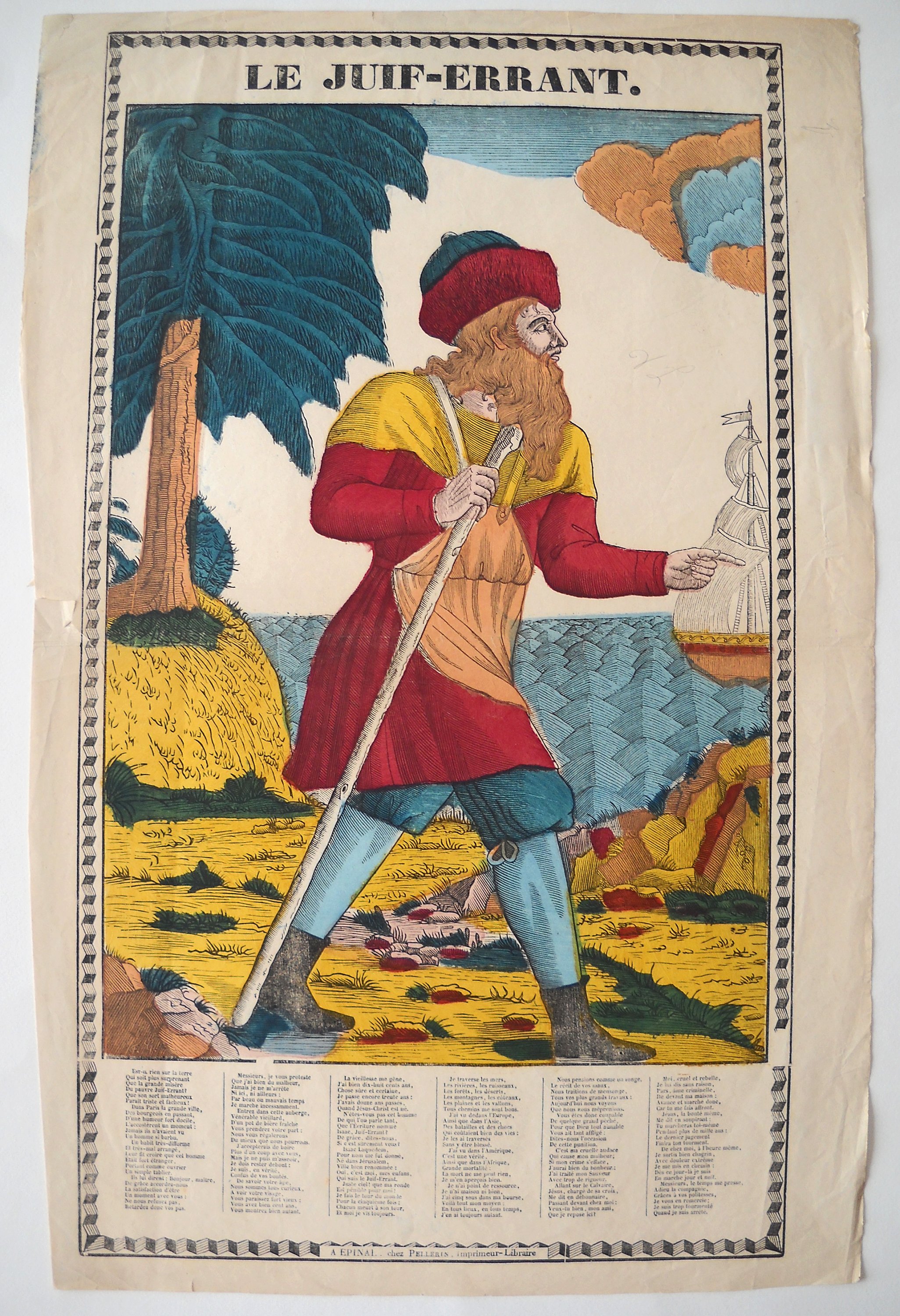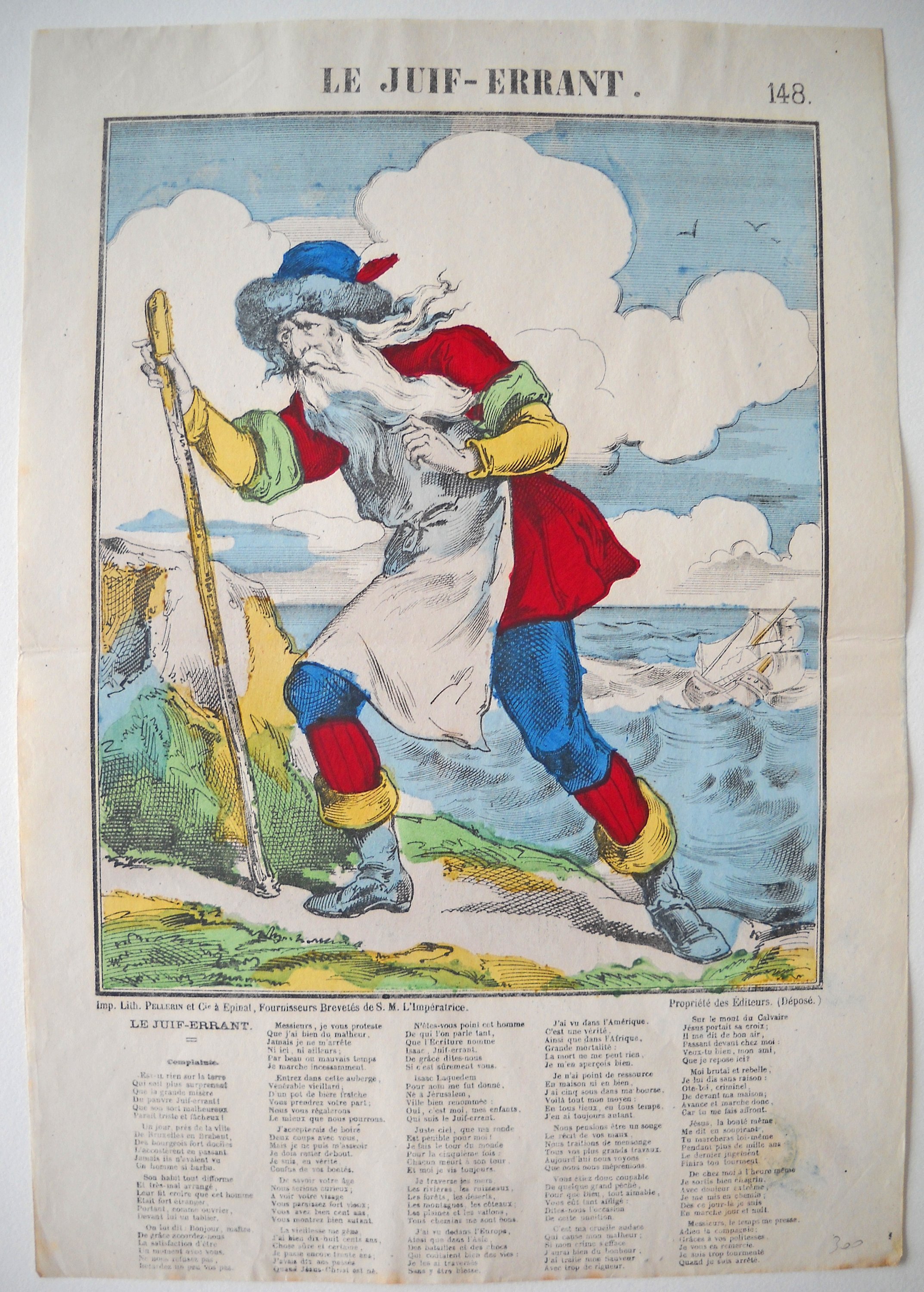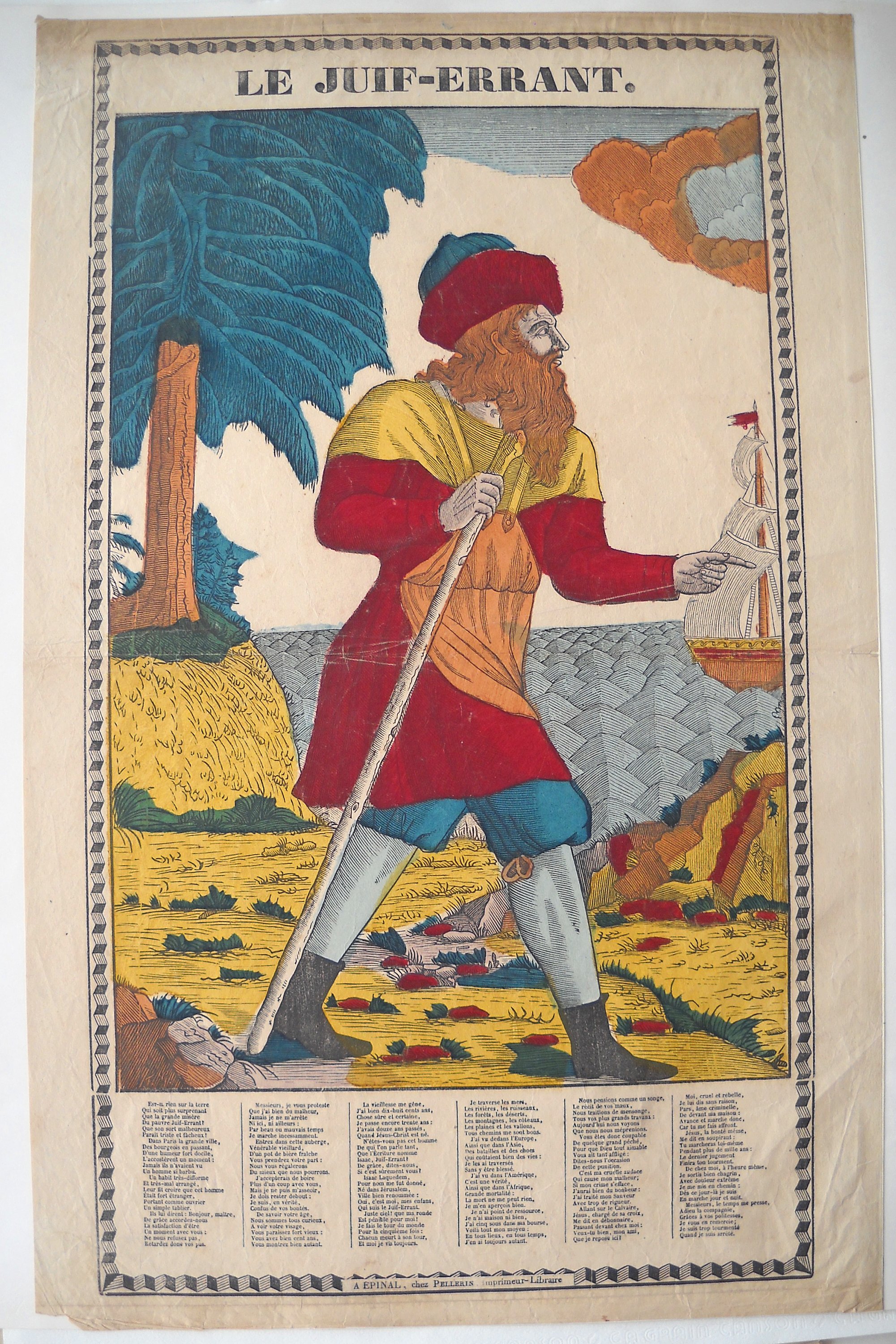 13 épreuves, gravures sur bois, sur papier, coloris de l'époque, certaines contrecollées sur carton épais: 2 ex. " LE JUIF-ERRANT ", " A EPINAL, chez PELLERIN ", par François GEORGIN graveur, [dépôt légal du 23 juillet 1826], 63,5 x 42 cm (petits défauts, déchirure) et 63,5 x 40,5 cm - 2 ex. " LE VRAI PORTRAIT DU JUIF-ERRANT ", par Jean-Baptiste VANSON graveur, Fabrique de PELLERIN, [dépôt légal du 29 avril 1857], 42 x 32 cm - 3 ex. " LE JUIF-ERRANT ", Pellerin & Cie, vers 1870, 40 x 30 cm - 2 ex. " LA MORT DU JUIF-ERRANT ", par Gabriel GOSTIAUX dit PHOSTY dessinateur, [1895], Pellerin & Cie, 38,5 x 27,5 cm - " Véritable complainte du JUIF-ERRANT ", après 1890, Pellerin & Cie, 39 x 28 cm - " LE VRAI PORTRAIT DU JUIF-ERRANT ", [1842], Fabrique de PELLERIN, 41,5 x 32,5 cm - 2 ex. " LE VRAI PORTRAIT DU JUIF-ERRANT ", par Léonce SCHERER, [1860], Fabrique de PELLERIN, 42,5 x 31,5 cm.