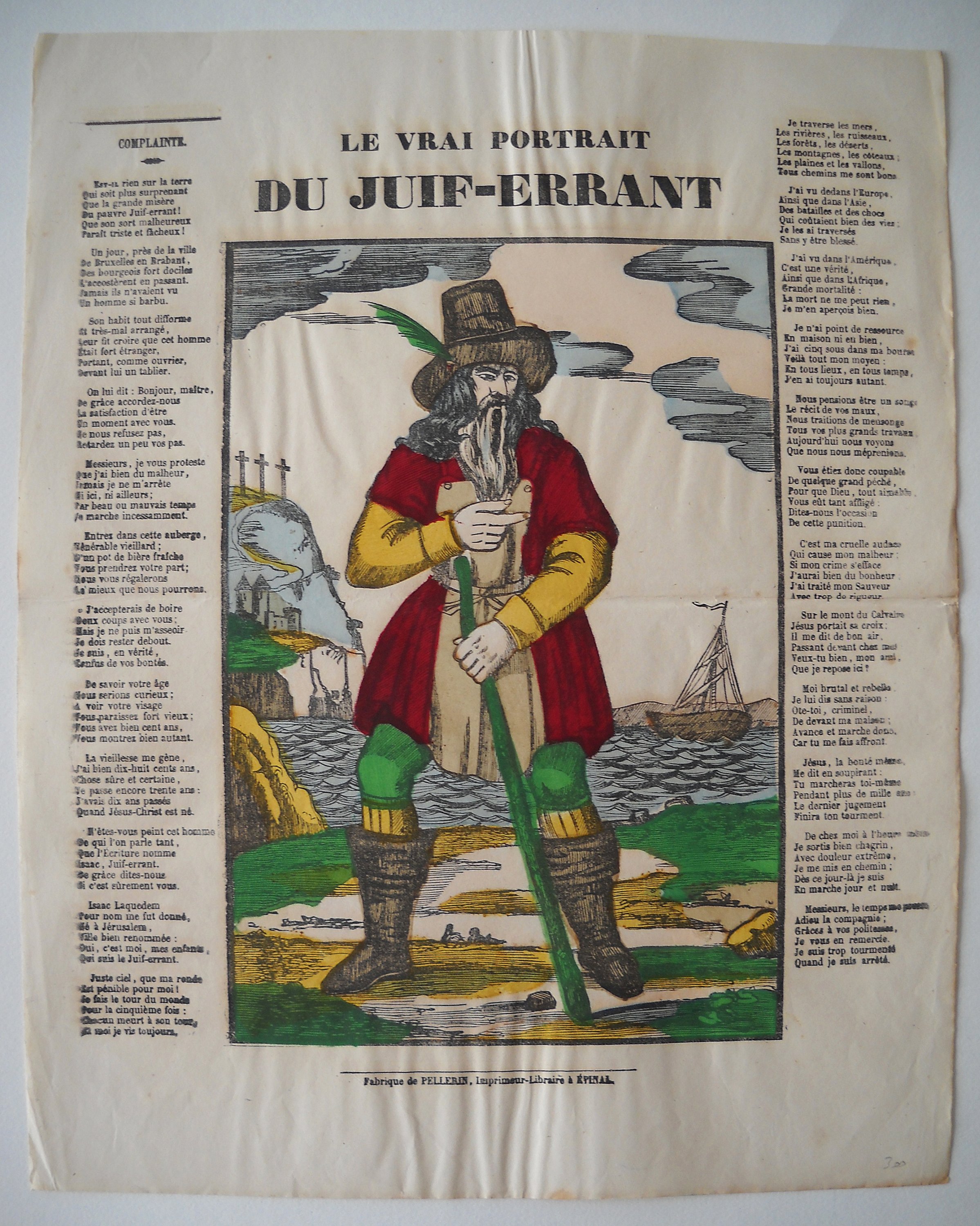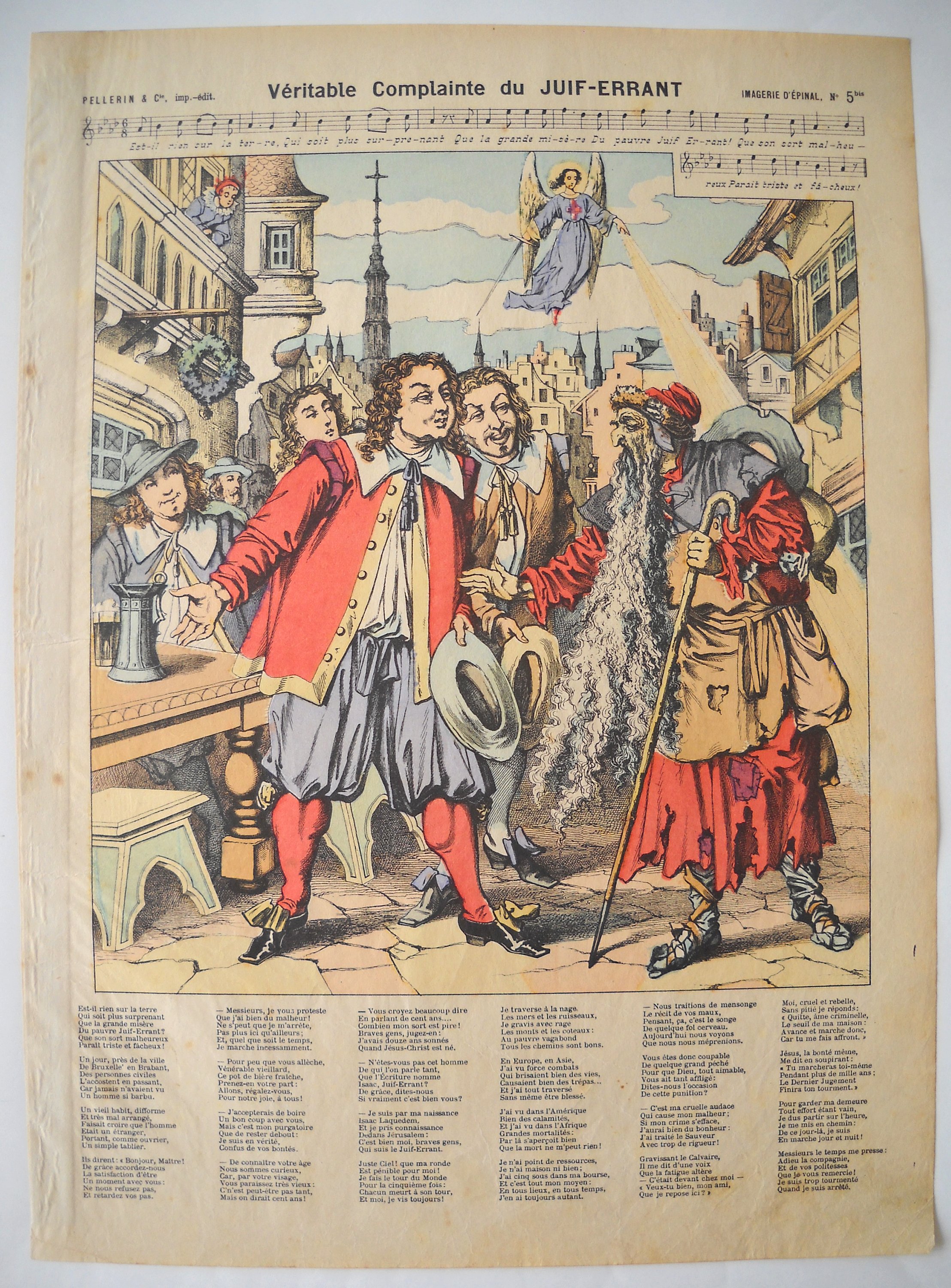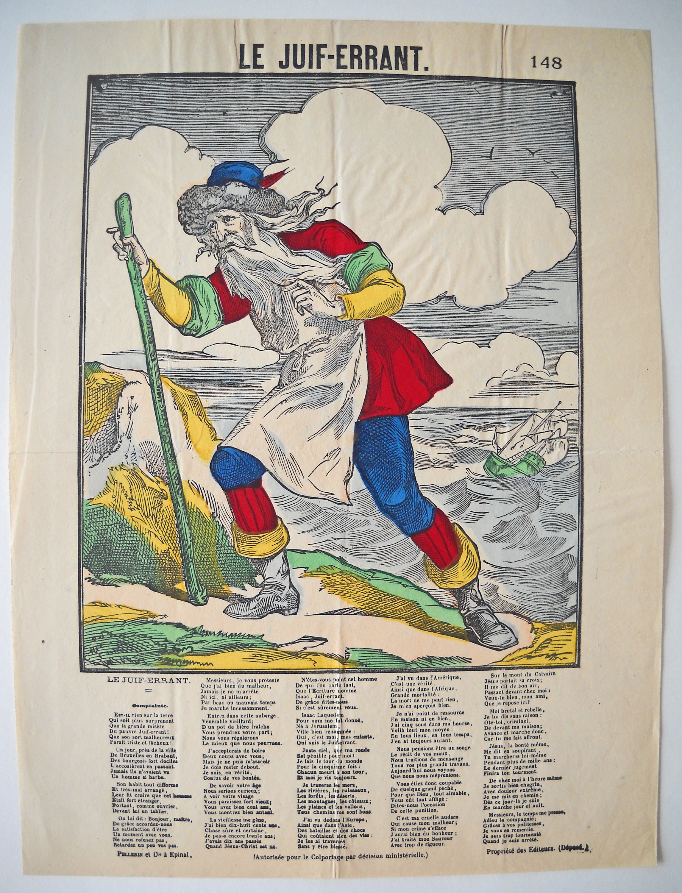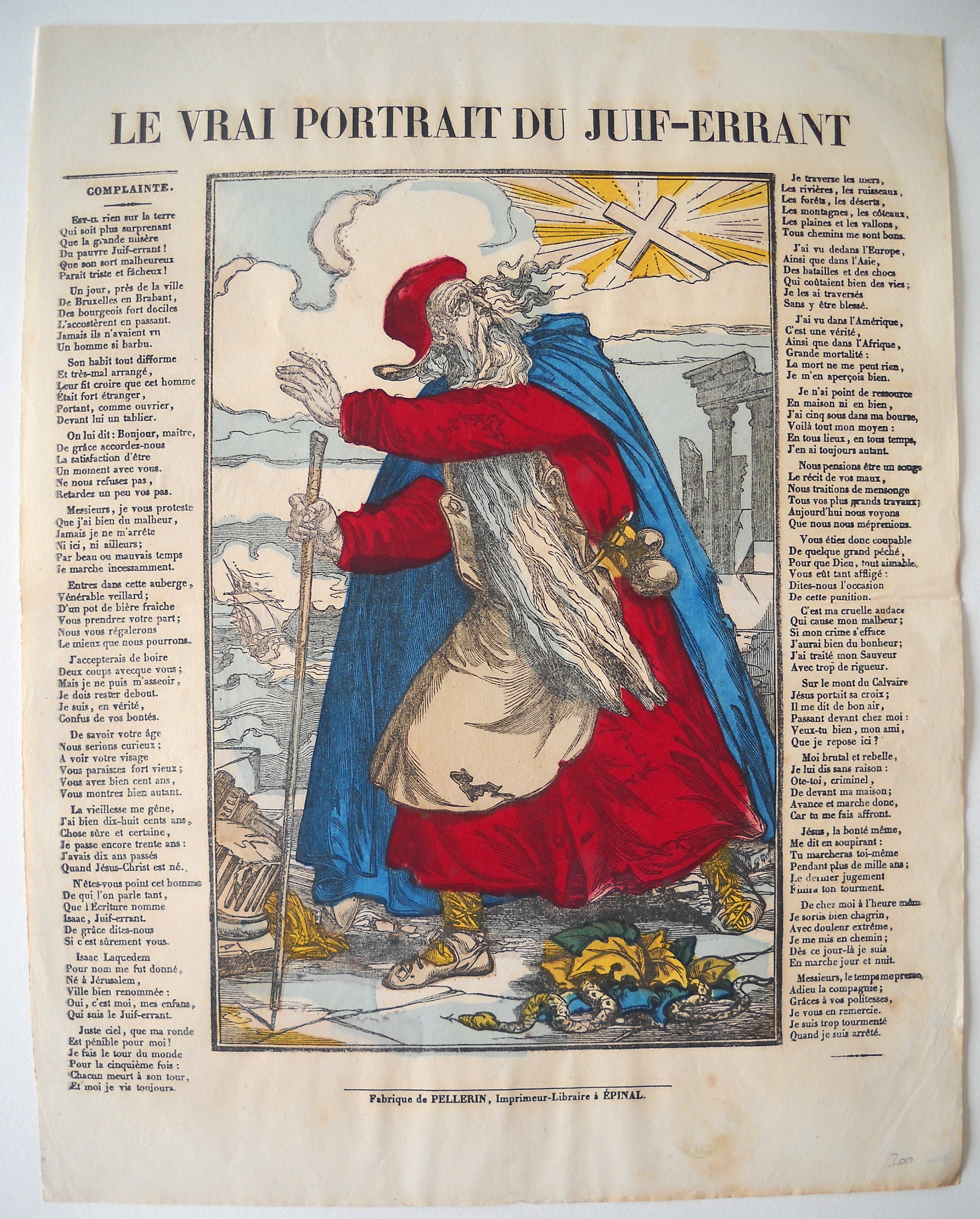 13 épreuves, gravures sur bois, sur papier, coloris de l'époque, certaines contrecollées sur carton épais: 2 ex. " LE JUIF-ERRANT ", " A EPINAL, chez PELLERIN ", par François GEORGIN graveur, [dépôt légal du 23 juillet 1826], 63,5 x 42 cm (petits défauts, déchirure) et 63,5 x 40,5 cm - 2 ex. " LE VRAI PORTRAIT DU JUIF-ERRANT ", par Jean-Baptiste VANSON graveur, Fabrique de PELLERIN, [dépôt légal du 29 avril 1857], 42 x 32 cm - 3 ex. " LE JUIF-ERRANT ", Pellerin & Cie, vers 1870, 40 x 30 cm - 2 ex. " LA MORT DU JUIF-ERRANT ", par Gabriel GOSTIAUX dit PHOSTY dessinateur, [1895], Pellerin & Cie, 38,5 x 27,5 cm - " Véritable complainte du JUIF-ERRANT ", après 1890, Pellerin & Cie, 39 x 28 cm - " LE VRAI PORTRAIT DU JUIF-ERRANT ", [1842], Fabrique de PELLERIN, 41,5 x 32,5 cm - 2 ex. " LE VRAI PORTRAIT DU JUIF-ERRANT ", par Léonce SCHERER, [1860], Fabrique de PELLERIN, 42,5 x 31,5 cm.