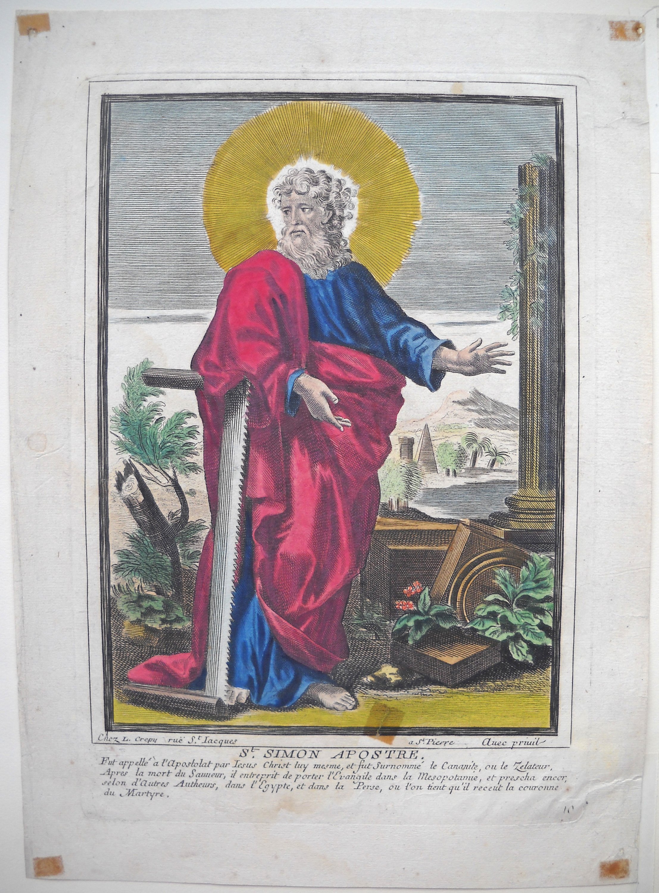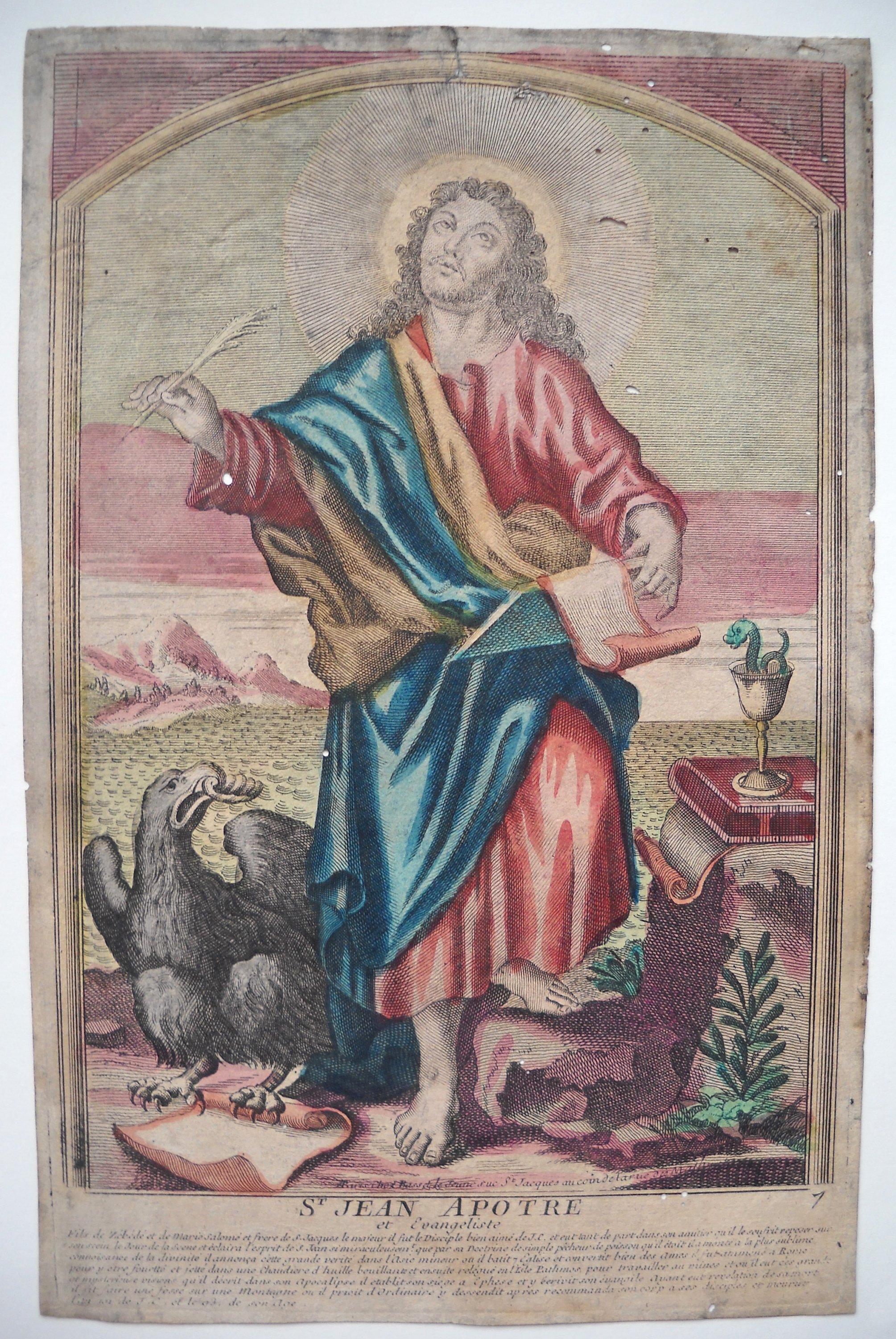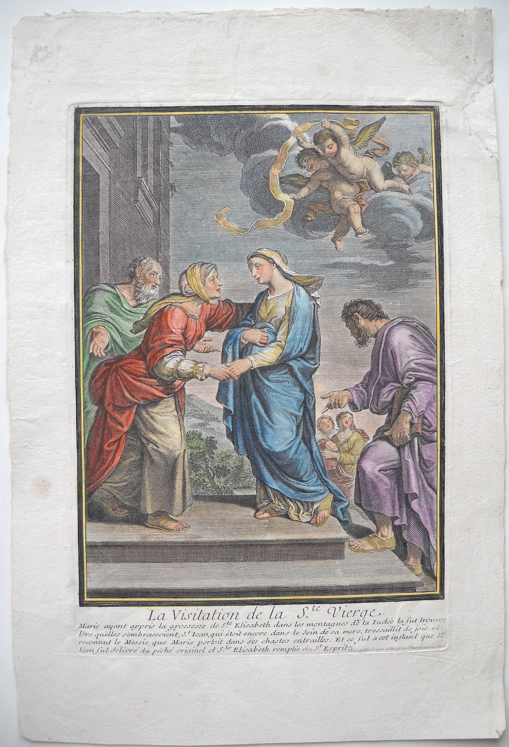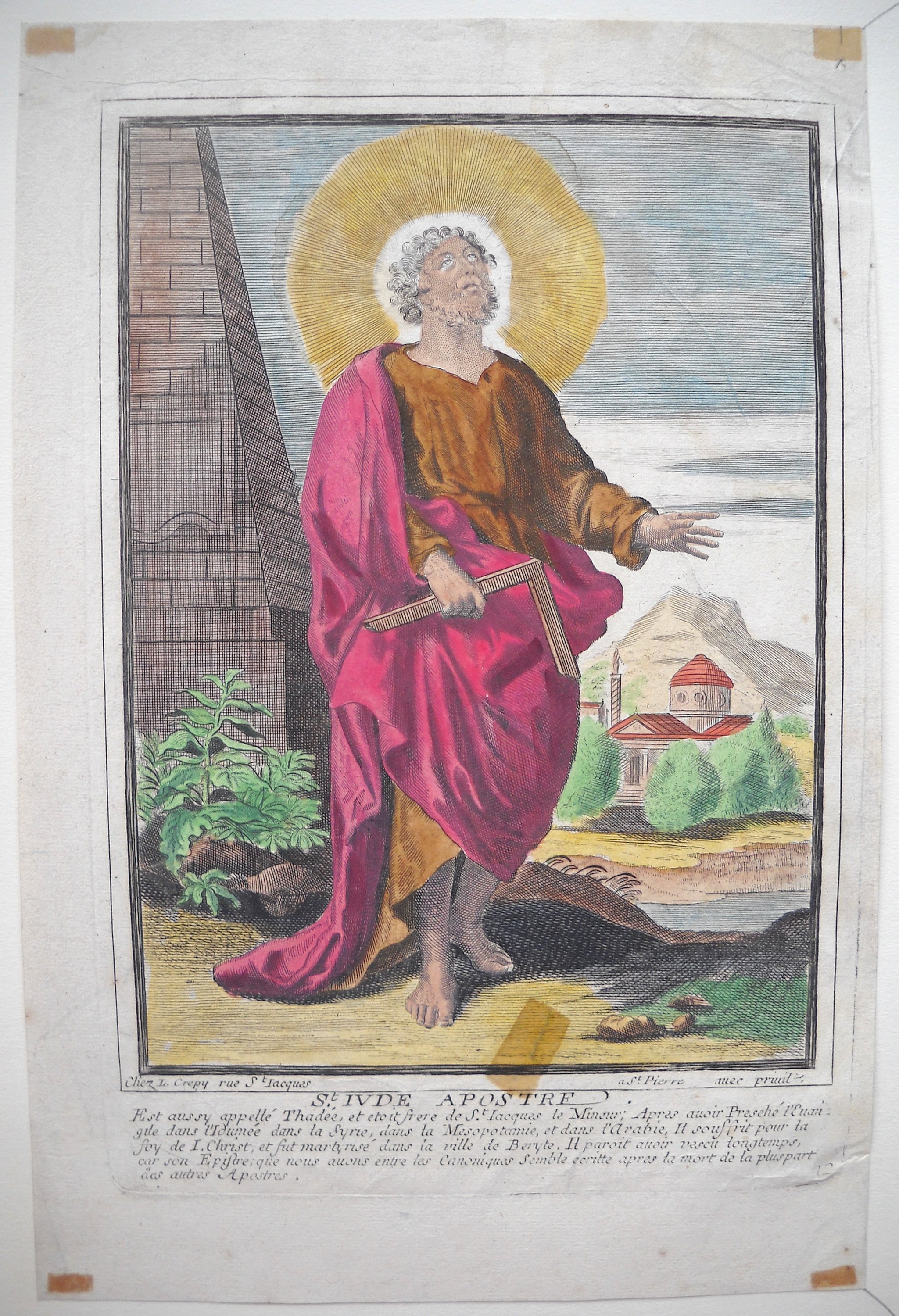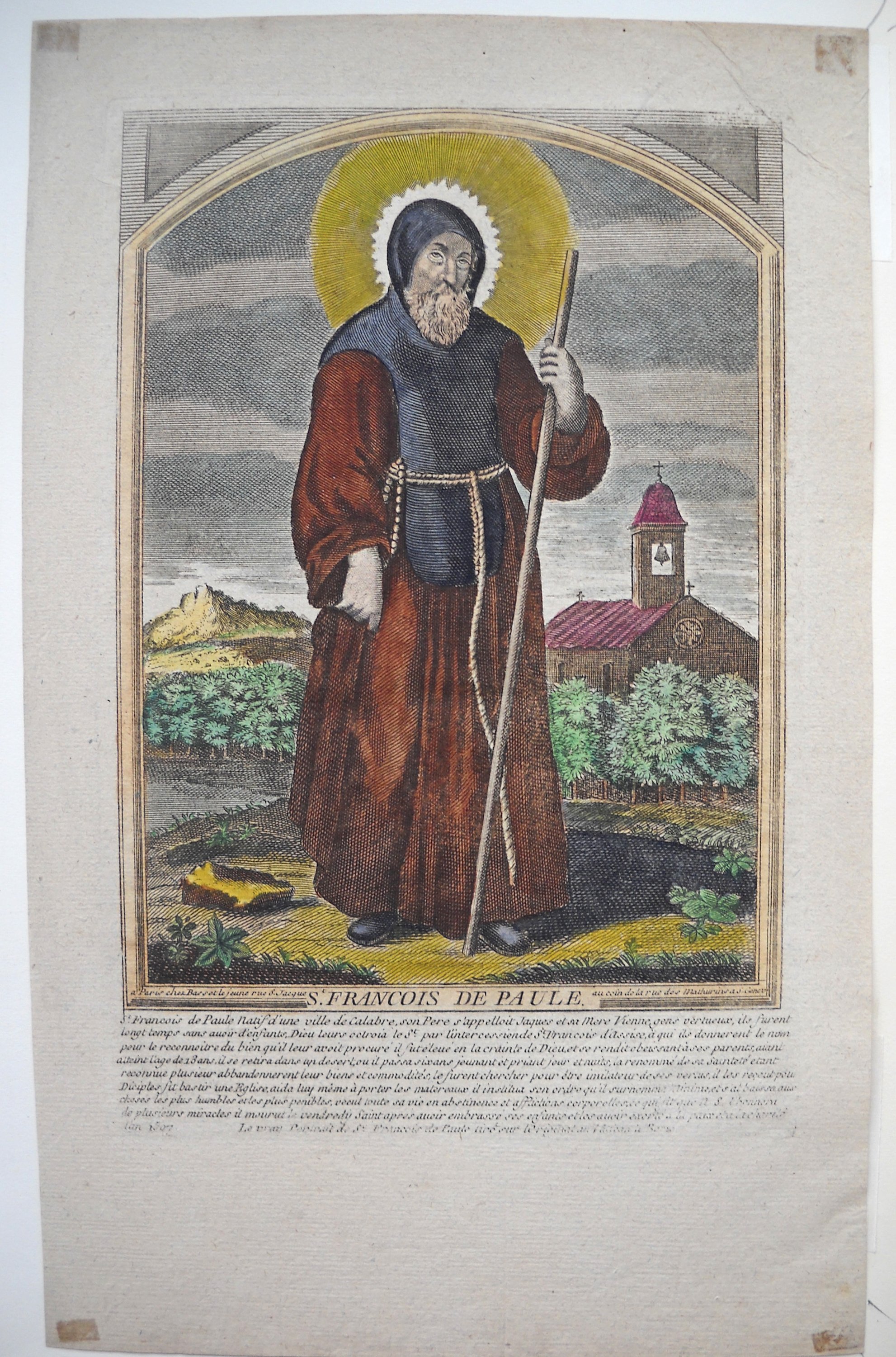 Réunion de 40 estampes, gravées en taille-douce sur papier vergé ou vélin, en majorité rehaussées de coloris d'époque, la plupart placées sous passe-partout ou contrecollées sur carton épais, éditeurs divers: de POILLY " La Visitation de la Ste Vierge ", fin XVIIe s., 40 x 27 cm - NOLIN " Saint Fursy ses actions et principaux miracle ", c. 1682, 51 x 36 cm - Henry II BONNART " DONNER A BOIRE A CEUX QUI ONT SOIF ", fin du XVIIe s., 33 x 22 cm (en l'état) - Famille BASSET, 10 p., XVIIIe et début du XIXe s.: " St FRANCOIS DE PAULE ", 39,5 x 24 cm ; " St JEAN APOTRE ", 33,5 x 21,5 cm (en l'état) ; " St THOMAS APÔTRE DES INDES ", 41,5 x 27 cm ; " NOTRE DAME DE LILLE ", 43 x 26,5 cm ; " S. JOACHIM EPOUX DE Ste ANNE ", 34,5 x 21,5 cm ; " St SIMON ET St JUDES APÔTRES ", 42,5 x 26,5 cm ; 2 ex. " Représentation de la Croix plantée à Compiègne Paroisse Saint Antoine ", 43 x 26,5 cm ; " Ste CHRISTINE ", 40 x 27 cm ; " S. Fernando Roy d'Espana ", 34 x 23,5 cm - C. GUERARD " St DENIS ET SES COMPAGNONS ", avant 1750, 36,5 x 23,5 cm - Michel CORRETTE (rue Montorgueil à la Croix d'Argent) " St Pierre ", après 1754, 18,5 x 24,5 cm (en l'état) - Jacques CHEREAU, 2 p., entre 1720 et 1769: " Ste Barbe Vierge et Martyre ", 37,5 x 25,5 cm ; " Maria Virgini Contemplanti ", 27,5 x 21,5 cm - DAUMONT: " Représentation de l'image miraculeuse de Notre Dame de Bon Secours ", avant 1775, 31 x 22,5 cm - MONDHARE, 2 p., milieu du XVIIIe s., " RADIX JESSE ", 29 x 19,5 cm ; " PORTRAIT DE NOTRE SEIGNEUR JESUS Christ ", 34,5 x 22,5 cm - Louis CREPY, 3 p., milieu du XVIIIe s.: " St THOMAS APOSTRE " ; " St SIMON APOSTRE " ; " St IVIDE APOSTRE ", 34,5 x 22,5 cm - Jacques CHIQUET, 3 p., avant 1768: " La Magdeleine quittant les habits du Monde ", 37,5 x 25,5 cm ; " Saint Joseph ", 25 x 20 cm ; " Saint André Apostre ", 25,5 x 20,5 cm - JEAN " HISTOIRE DE SAMSON ", début XIXe s., 27,5 x 41,5 cm - JAGOT " L'IMMACULEE CONCEPTION ", vers 1800, 39 x 26 cm - François BONNEVILLE, 2 p., avant 1805: " L'EXCELLENT POURVOYEUR ", 35,5 x 24 cm ; " LE St PERE LE PAPE PIE VII ", 30,5 x 21 cm - GENTY " St AUGUSTIN ", avant 1818, 38 x 26 cm - etc.