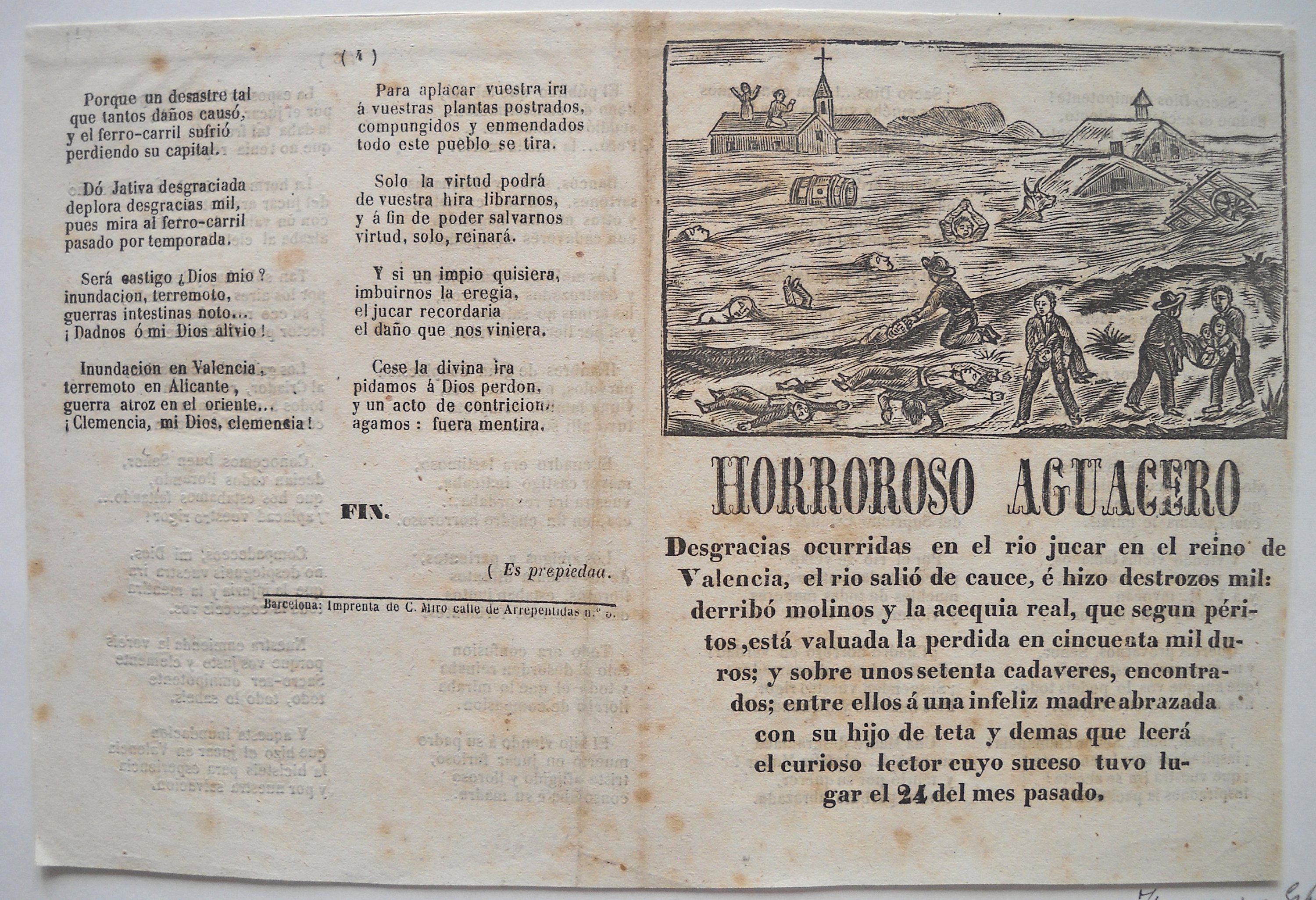 Joint: placard titré " Horroroso Aguacero ", évoquant des inondations de la rivière Jucar dans la région de Valence, XIXe siècle. 19,5 x 29,5 cm.