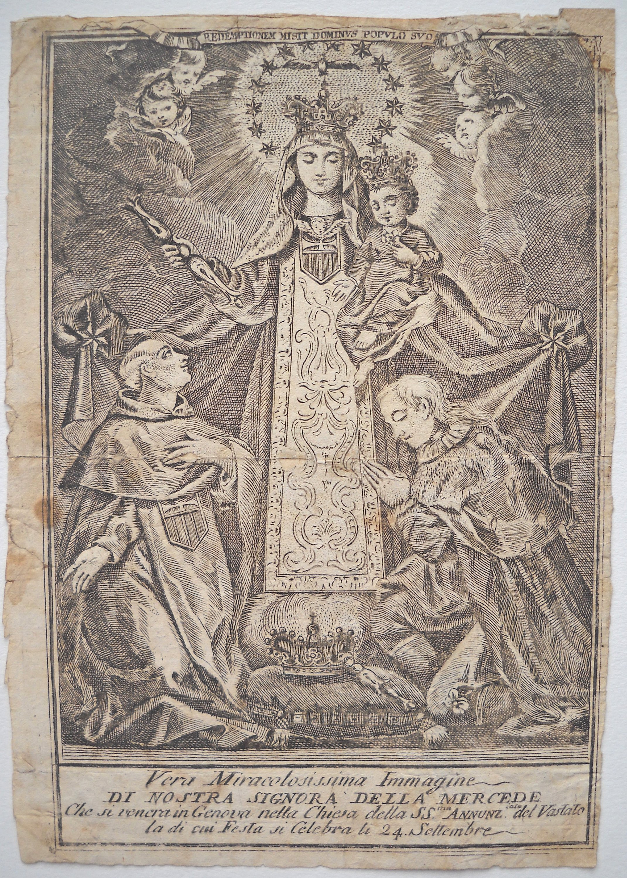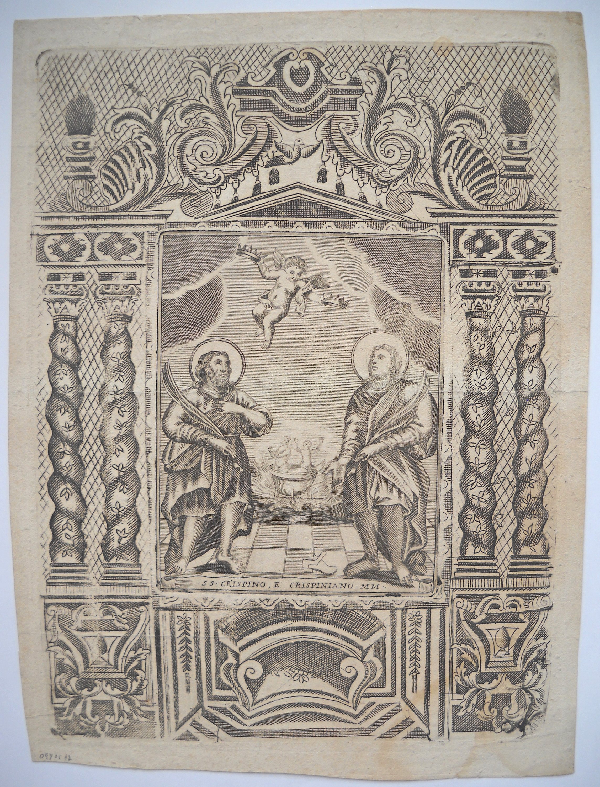 Réunion de 28 estampes, gravures en taille-douce, en majorité sur papier vergé, formats et états divers, certaines contrecollées sur carton épais, dont " SS. CRISPINO E CRISPINIANO MM ", gravure en taille-douce sur papier vergé, 35 x 26cm - " SANCTUS COSINUS SANCTUS DAMIANUS ", 21,5 x 15,5 cm - " Vera Miracolosissima Immagine / DI NOSTRA SIGNORA DELLA MERCEDE ", 22,5 x 15,5 cm - " Deusqui nobis in sancta Syndone