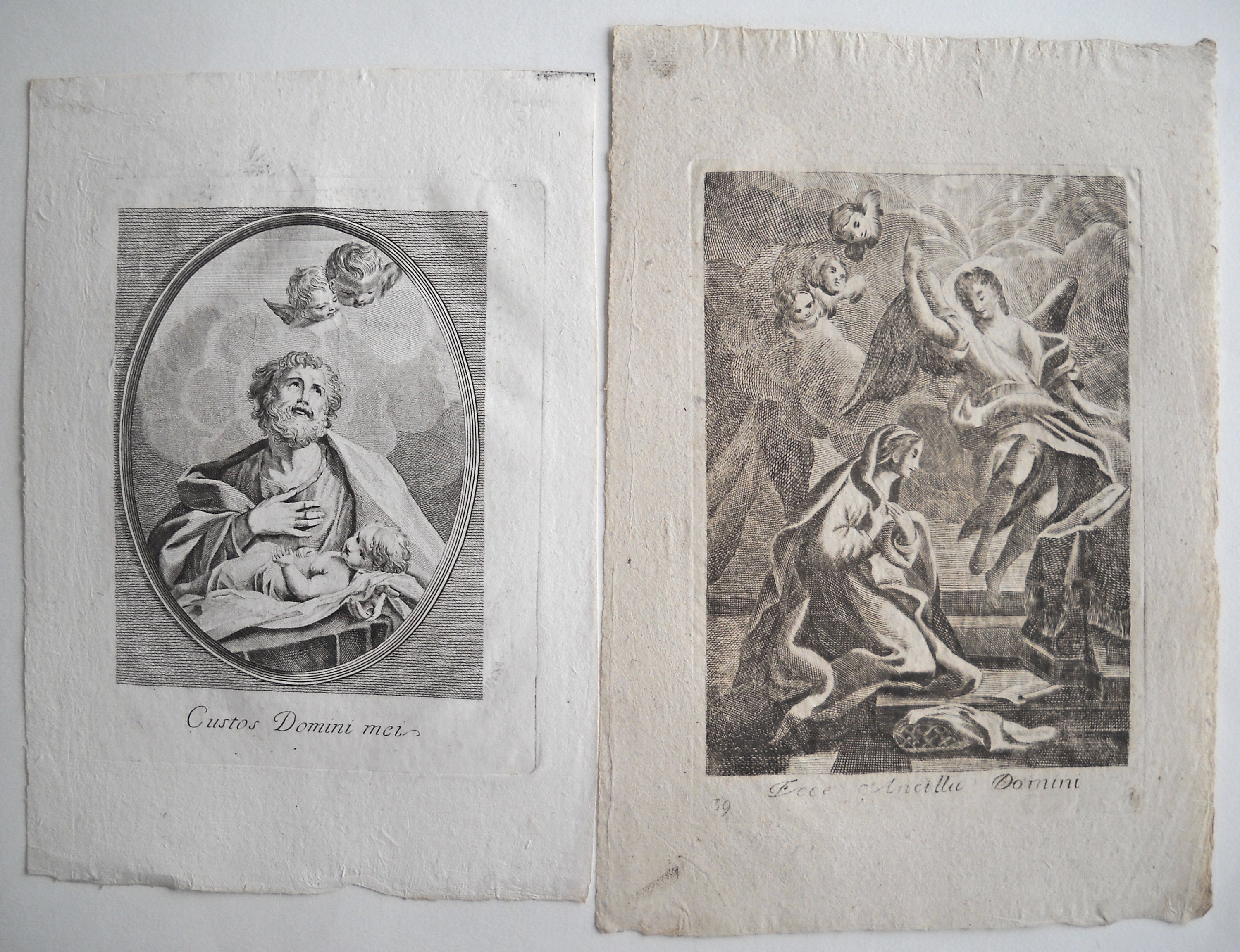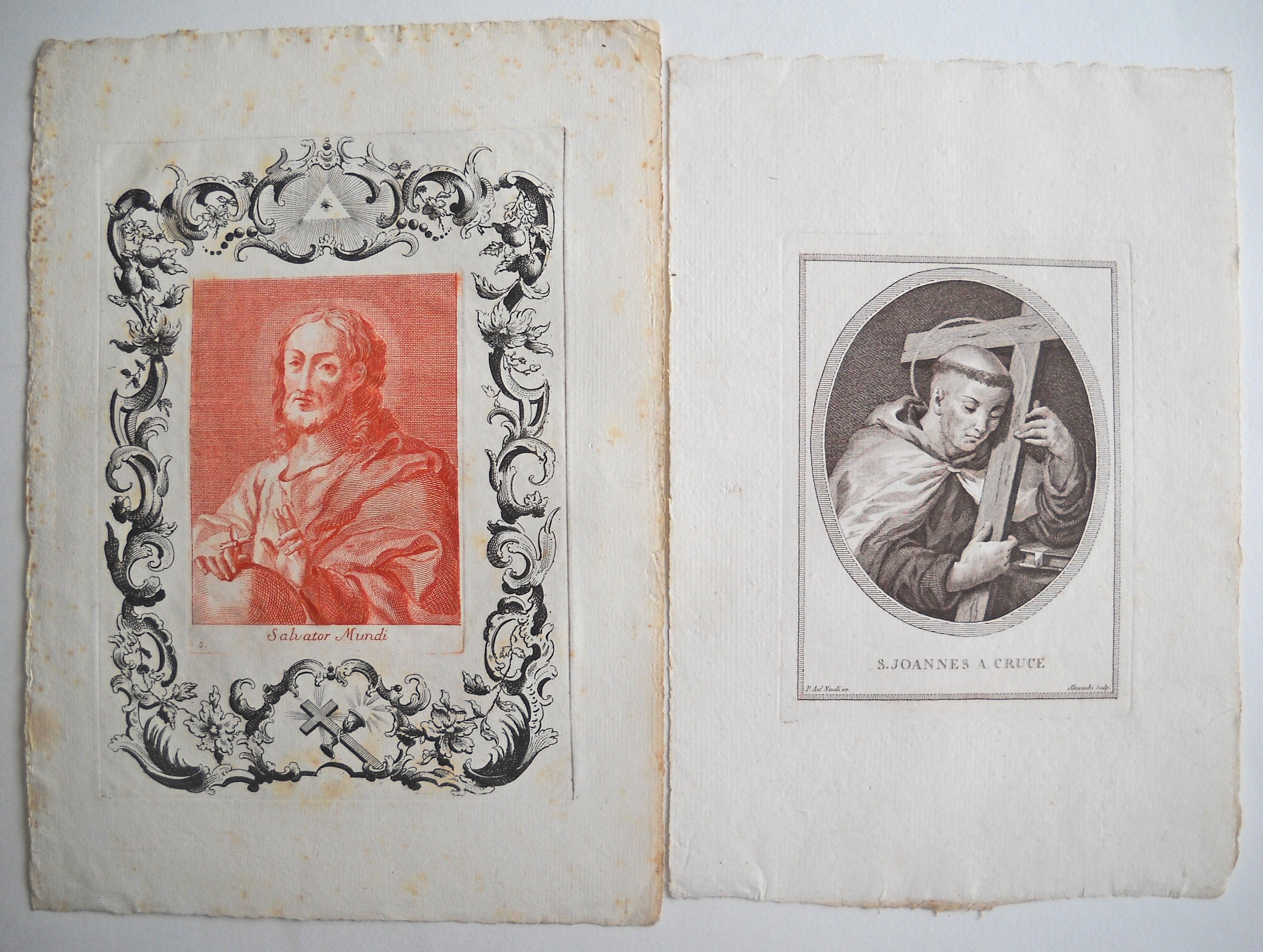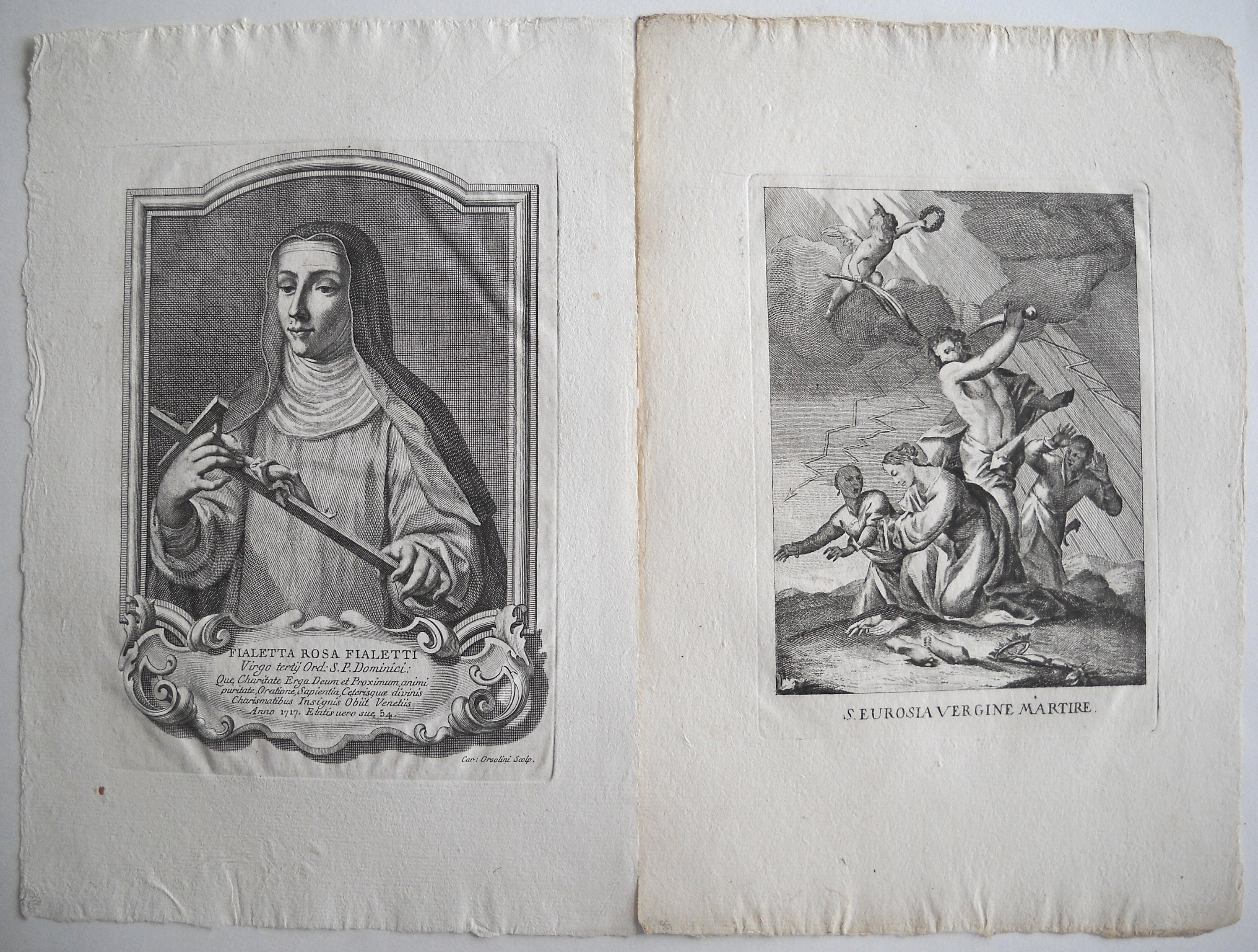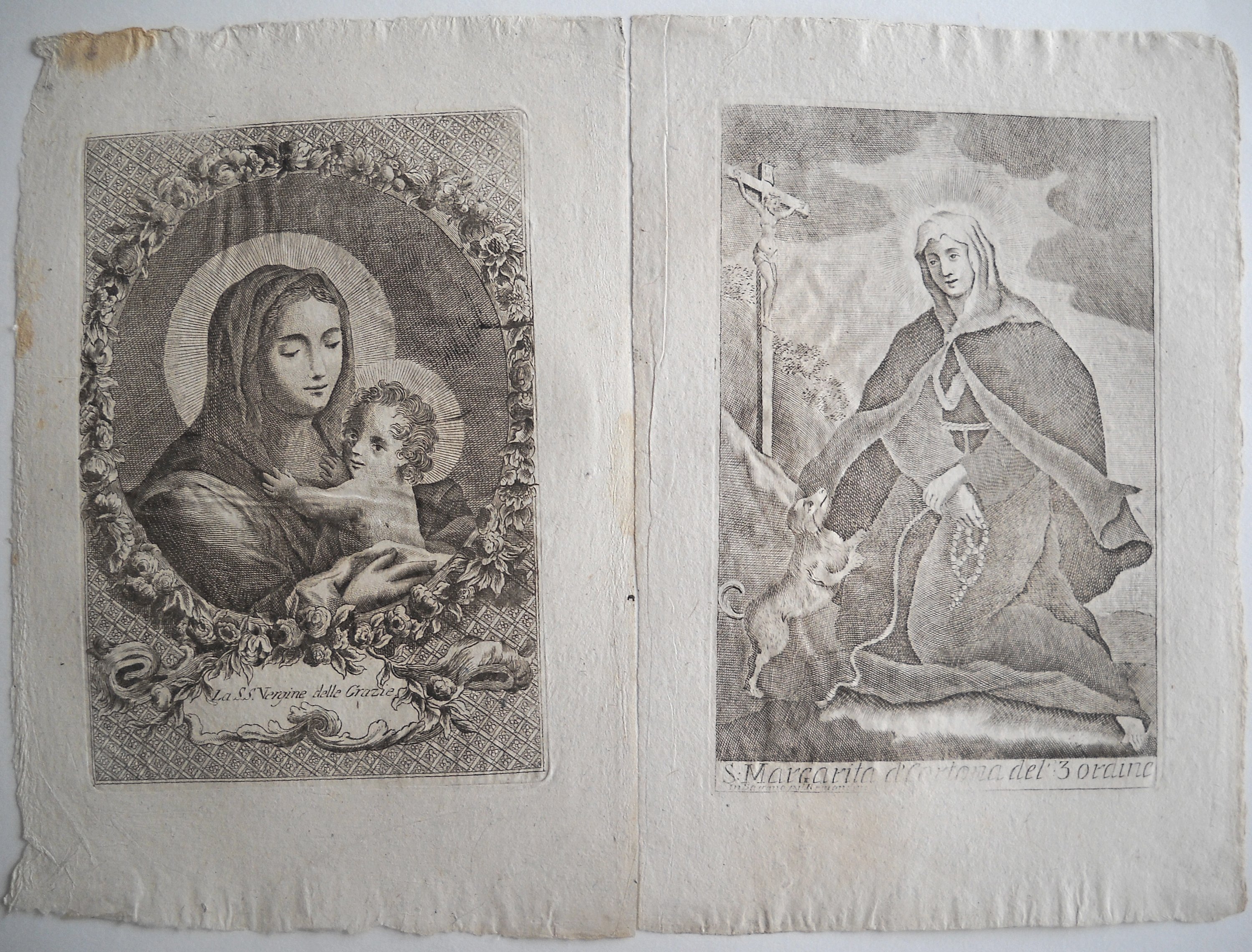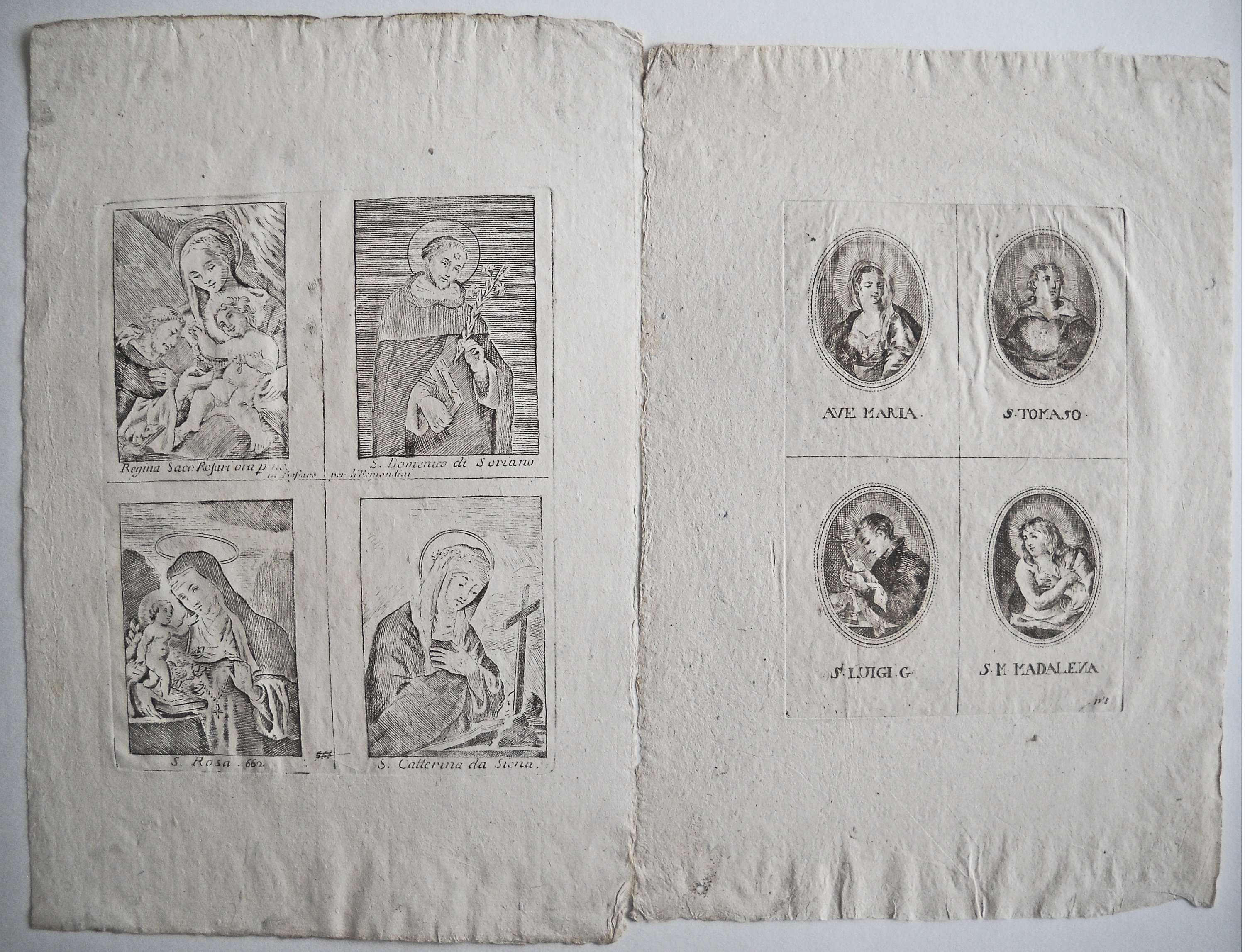 1783 " par " Gaetano Sancon sculps. " ; " S. MARIA MAGDALENA " ; " S. ALOYSIUS GONZAGA " ; " B. Lorenzo da Brindisi Cappuccino " ; " Custos Domini mei " ; " S. Barbara V. et M. " ; " " S. Stanislaus Kostka " ; " EGO PANEM DABO " ; " S.JACOBUS MAJOR " ; " La S.S. Vergine delle Grazie " ; " FIALETTA ROSA FIALETTI " par " Orsolini sculp. " ; " S. EUROSIA VERGINE MARTIRE " ; " S. VALENTINUS M. " ; " ASSUMPTIO B.V. MARIE IN CELUM " ; " ADORABILE NOMEN JESU " ; " S. PETRUS " ; " S. PIETRO APOSTOLO " ; " Fuga in Aegyptum " ; " Benedetto Giuseppe Labré " ; " S. MICHAEL " ; " ANNUNCIACION DE NUESTRA SENORA " ; etc.