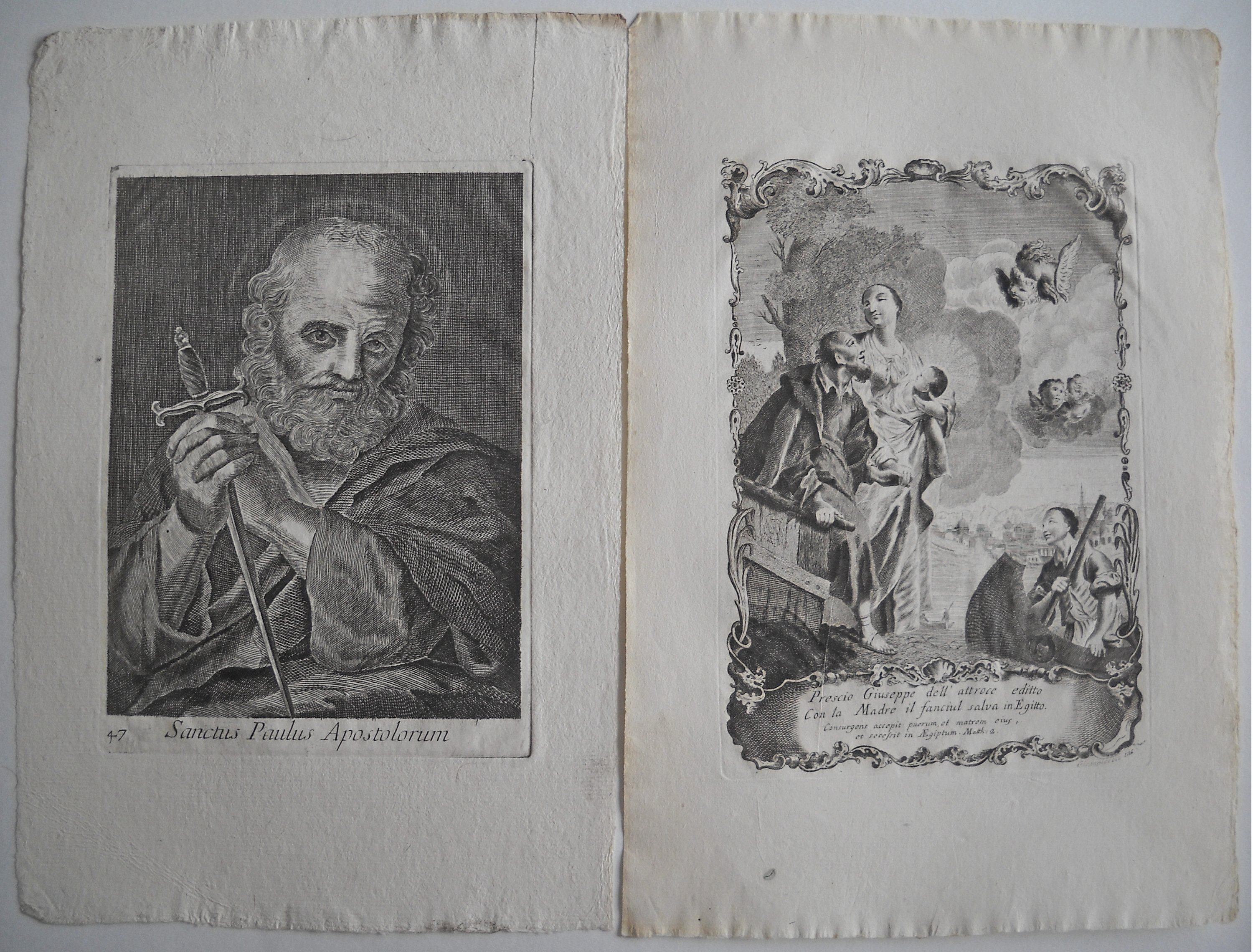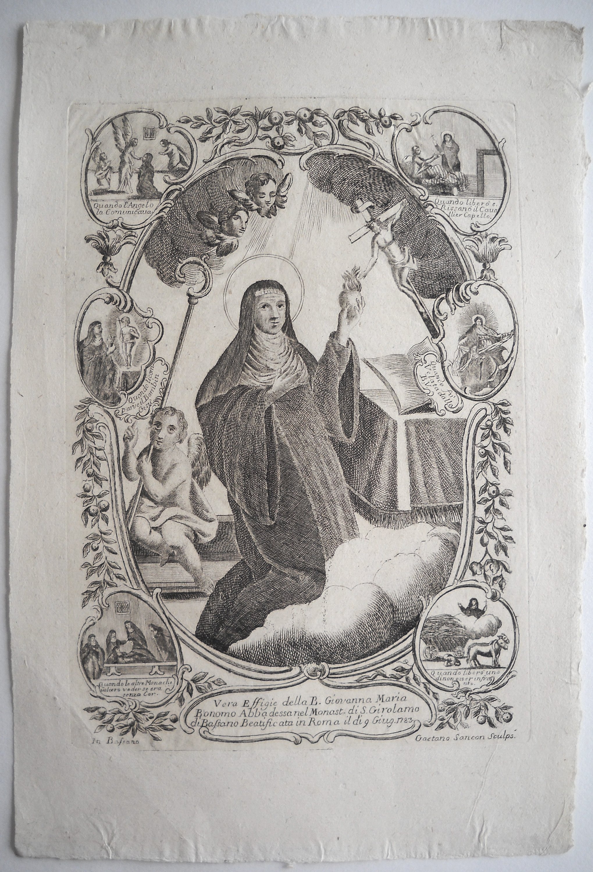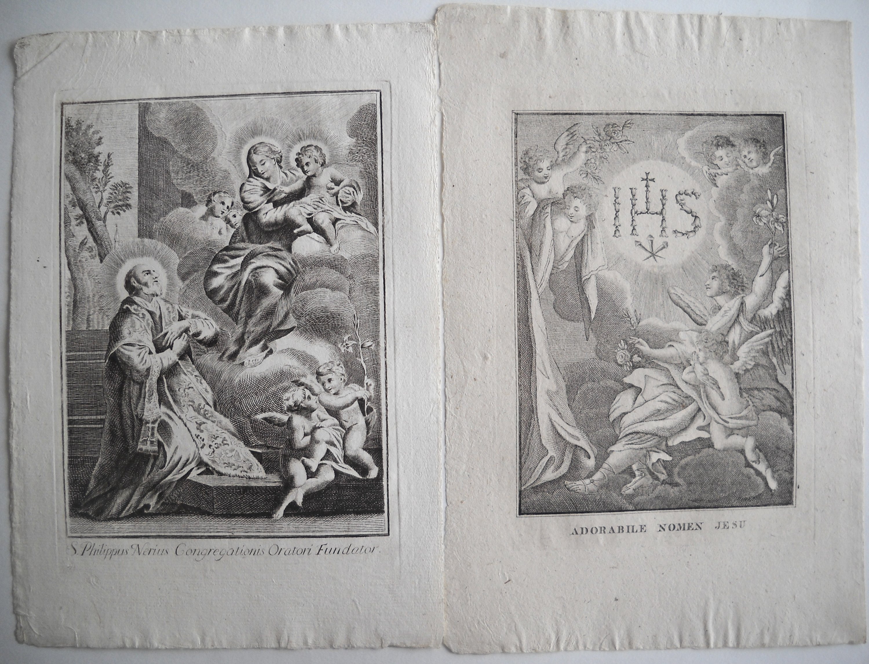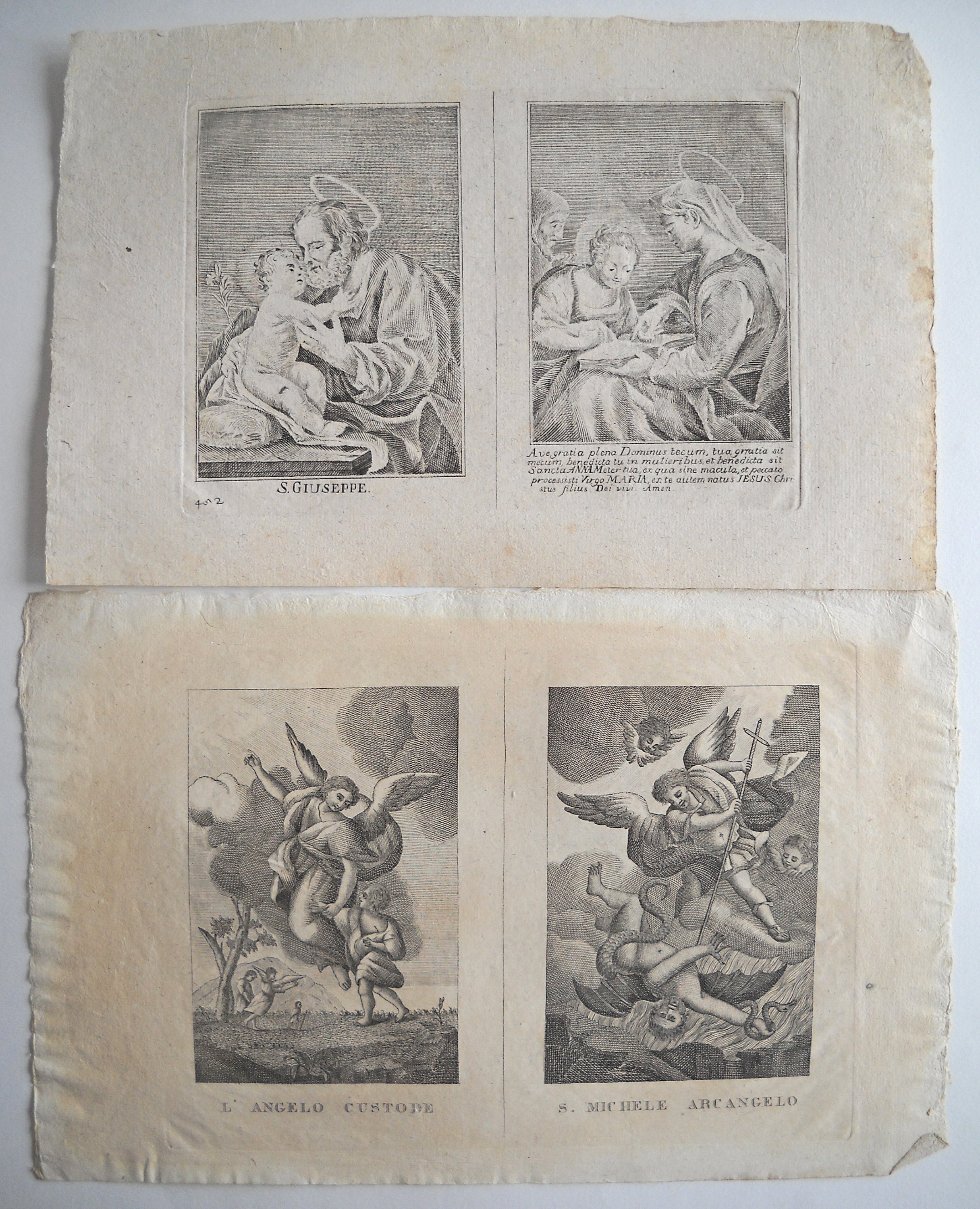 1783 " par " Gaetano Sancon sculps. " ; " S. MARIA MAGDALENA " ; " S. ALOYSIUS GONZAGA " ; " B. Lorenzo da Brindisi Cappuccino " ; " Custos Domini mei " ; " S. Barbara V. et M. " ; " " S. Stanislaus Kostka " ; " EGO PANEM DABO " ; " S.JACOBUS MAJOR " ; " La S.S. Vergine delle Grazie " ; " FIALETTA ROSA FIALETTI " par " Orsolini sculp. " ; " S. EUROSIA VERGINE MARTIRE " ; " S. VALENTINUS M. " ; " ASSUMPTIO B.V. MARIE IN CELUM " ; " ADORABILE NOMEN JESU " ; " S. PETRUS " ; " S. PIETRO APOSTOLO " ; " Fuga in Aegyptum " ; " Benedetto Giuseppe Labré " ; " S. MICHAEL " ; " ANNUNCIACION DE NUESTRA SENORA " ; etc.