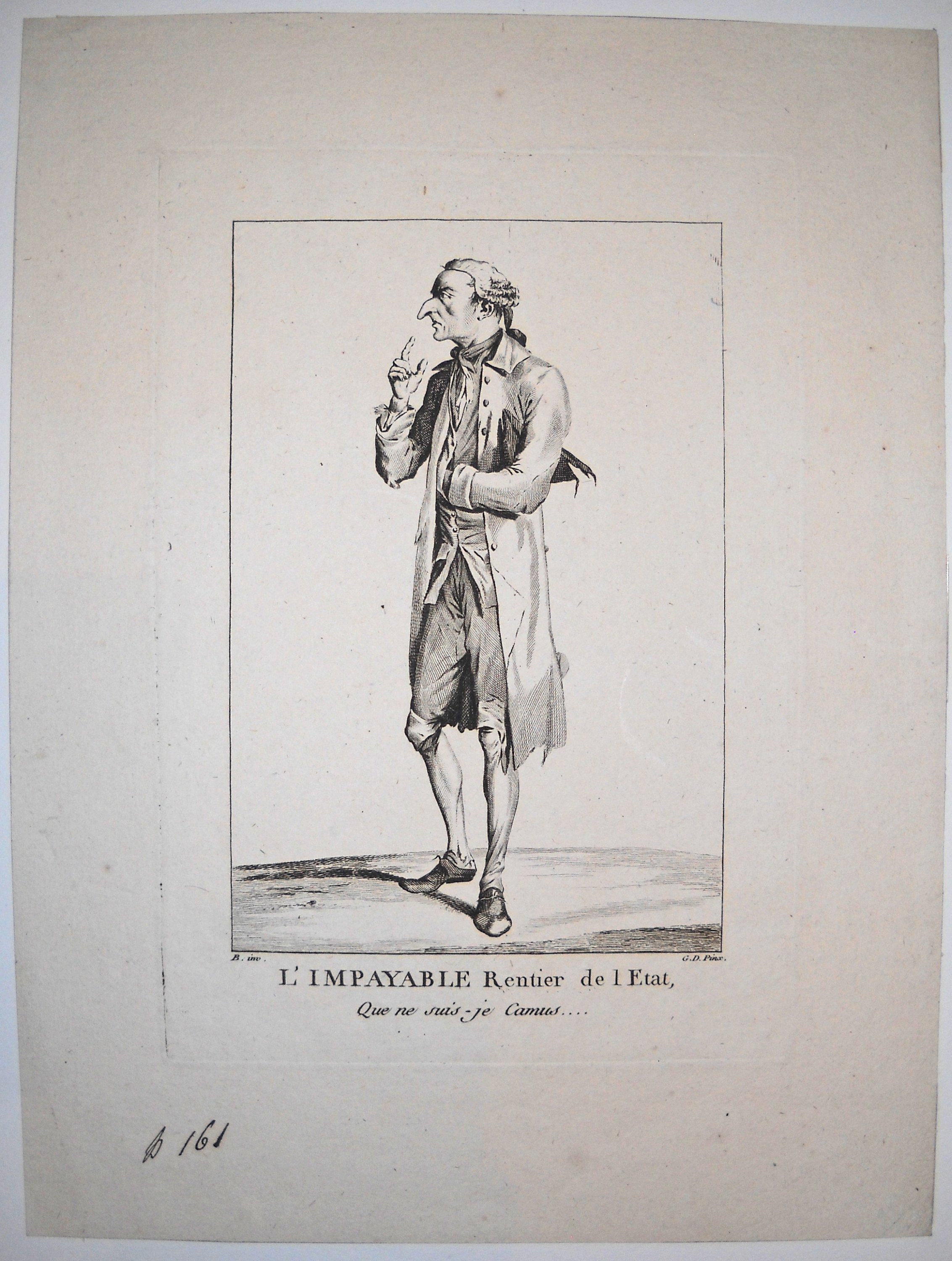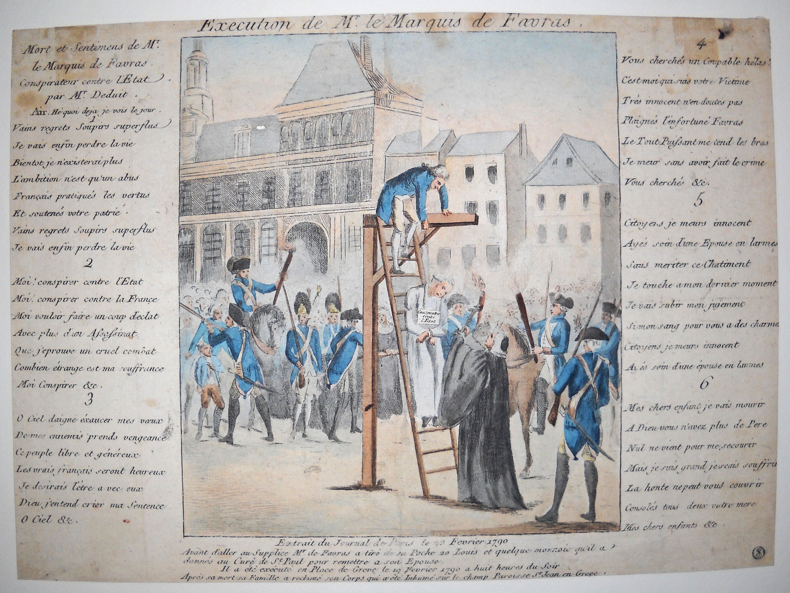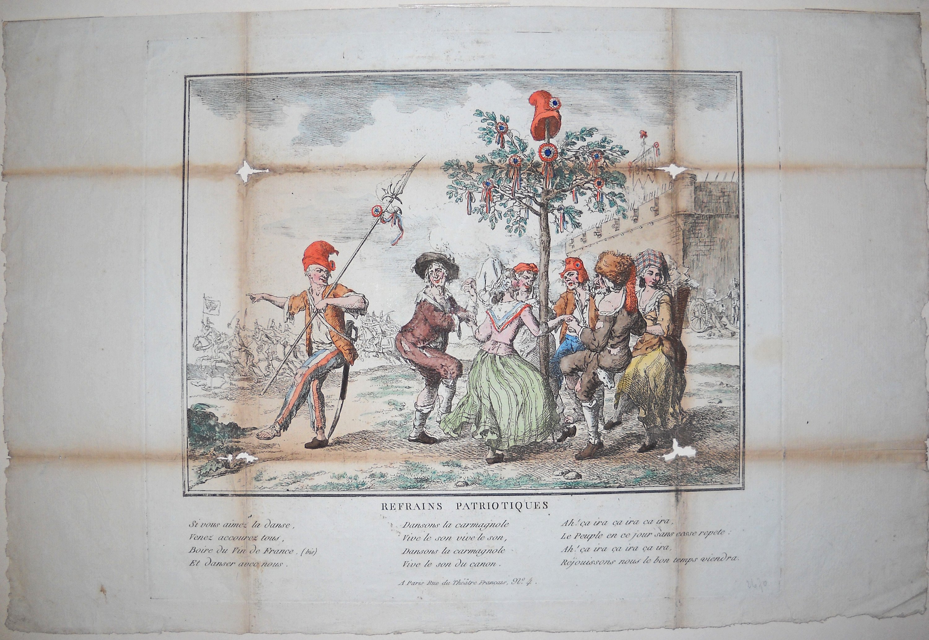 Réunion de 20 estampes, en taille-douce et lithographie, certaines sur papier vergé avec rehauts de coloris d'époque, formats divers, certaines placées sous passe-partout ou contrecollées sur papier épais. Dont " Exécution de M. le Marquis de Favras / Extrait du journal de Paris le 20 février 1790 ", 1790, 23 x 32 cm - " REFRAINS PATRIOTIQUES ", 1792-1794, édité par F. Bonneville " à Paris, Rue du Théâtre Français, n°4 ", 30,5 x 46 cm (en l'état) - " L'IMPAYABLE Rentier de l'Etat, / Que ne suis-je Camus