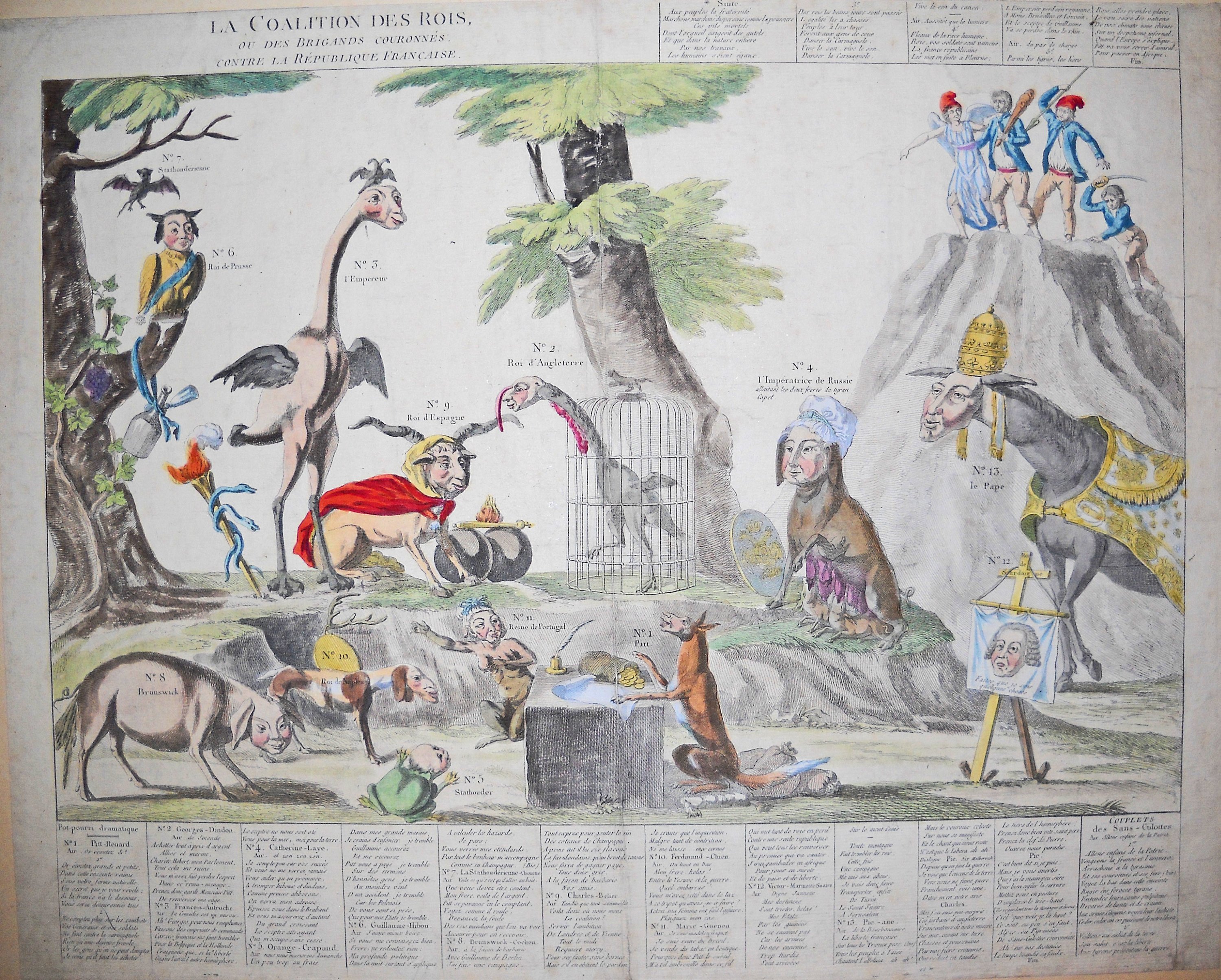 ", par Jean Duplessi-Bertaux, 1797, 33,5 x 24,5 cm - " LA COALITION DES ROIS, / OU DES BRIGANDS COURONNÉS / CONTRE LA RÉPUBLIQUE FRANCAISE ", [par De Roo], 1794, 43 x 54 cm - " DE ACTIEWERELD OP HAAR EINDE " [Le monde de l'action à sa fin], Pays-Bas, XVIIIe siècle, 41,5 x 43 cm - etc.