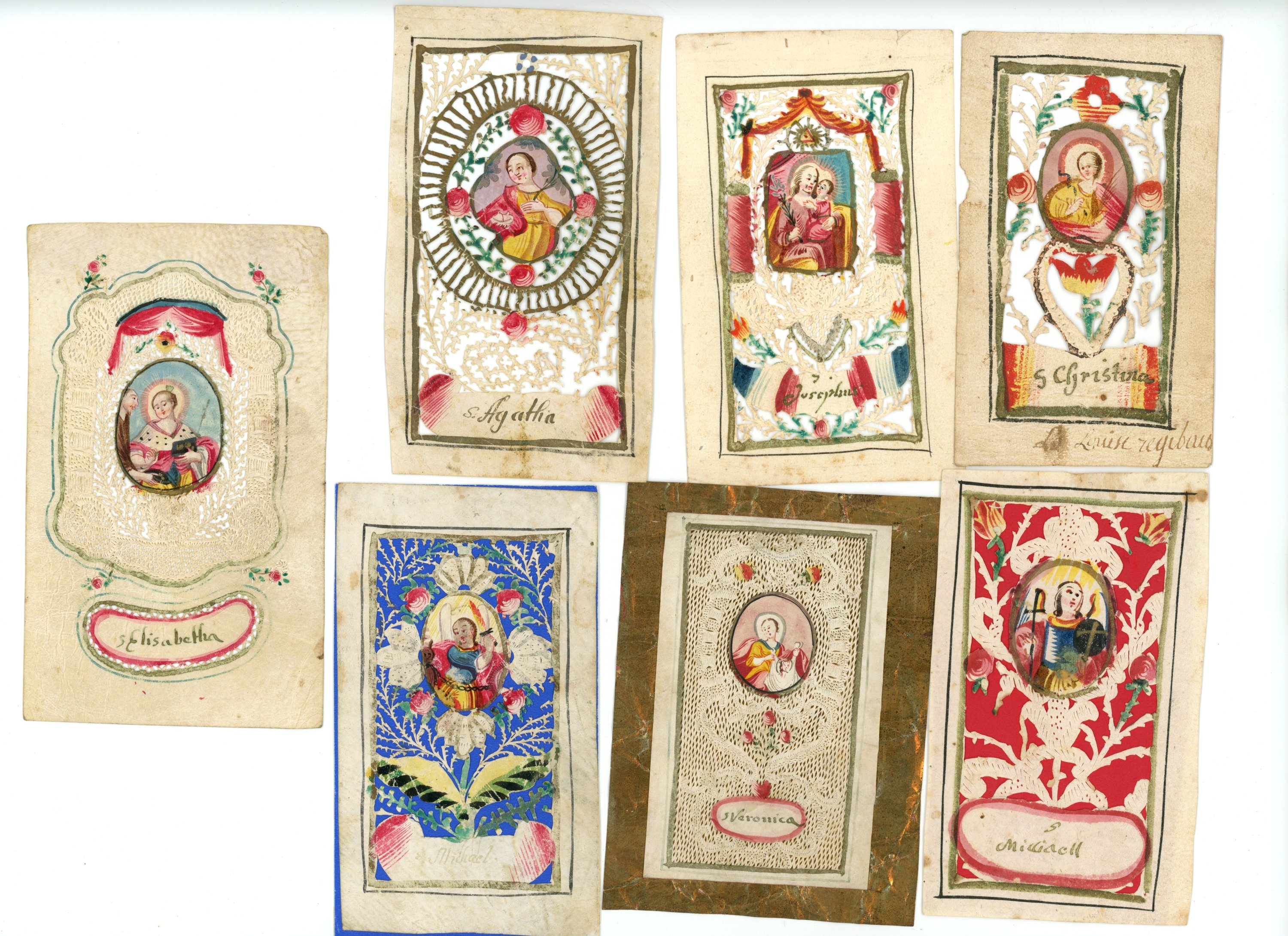 Réunion de 11 petits canivets, sur vélin ou sur papier, entre 8,5 x 5 cm et 11,5 x 7 cm, à décor de découpes au réseau de Valenciennes et autres motifs géométriques ajourés et peints, orné au centre d'un médaillon ou sujet peint, le Christ en croix, saint Joseph, saint Michaël, sainte Marie, sainte Véronique, sainte Elisabeth, sainte Catherine, sainte Agathe, sainte Christine. Certains contrecollés sur papier. États moyen à TTB.