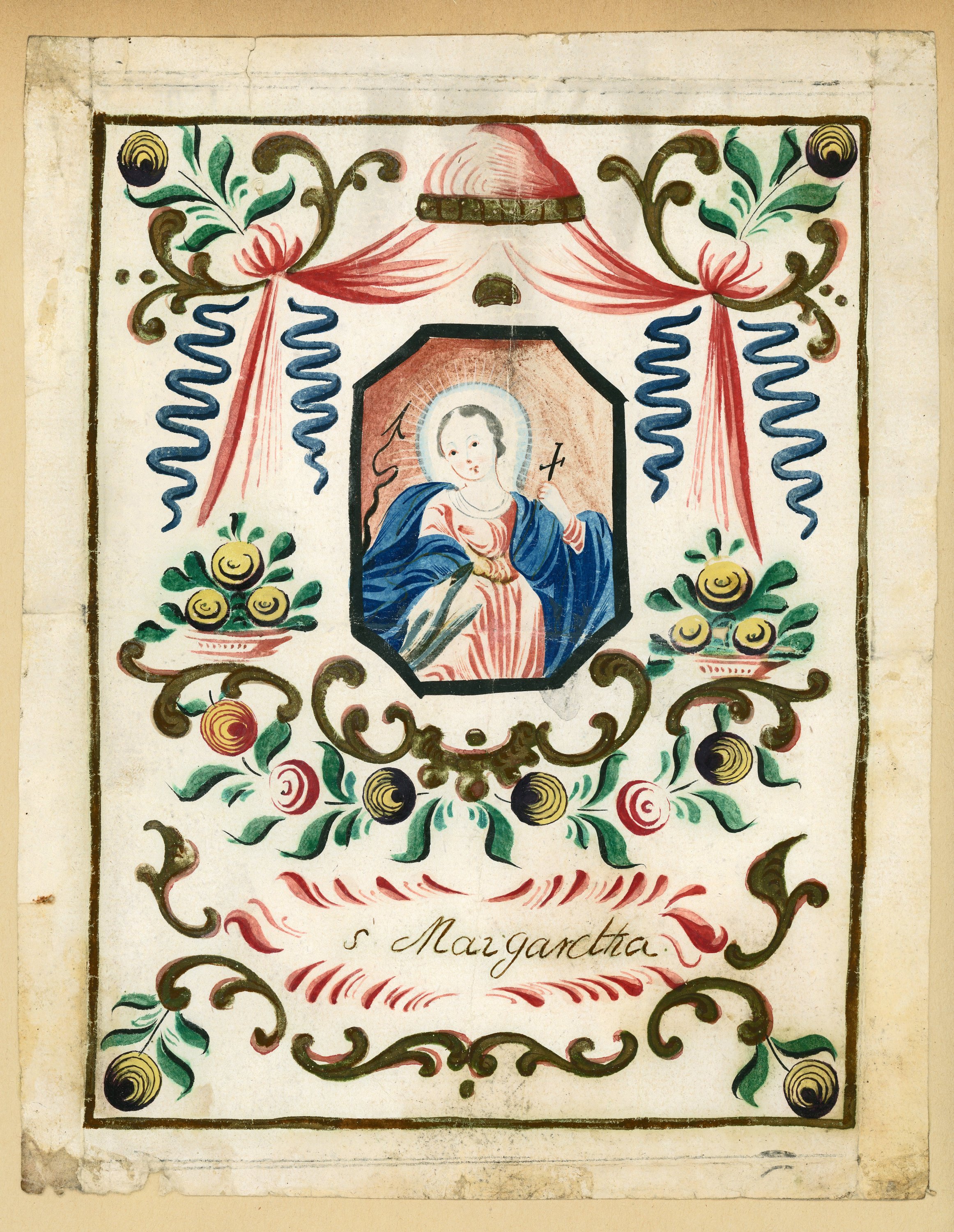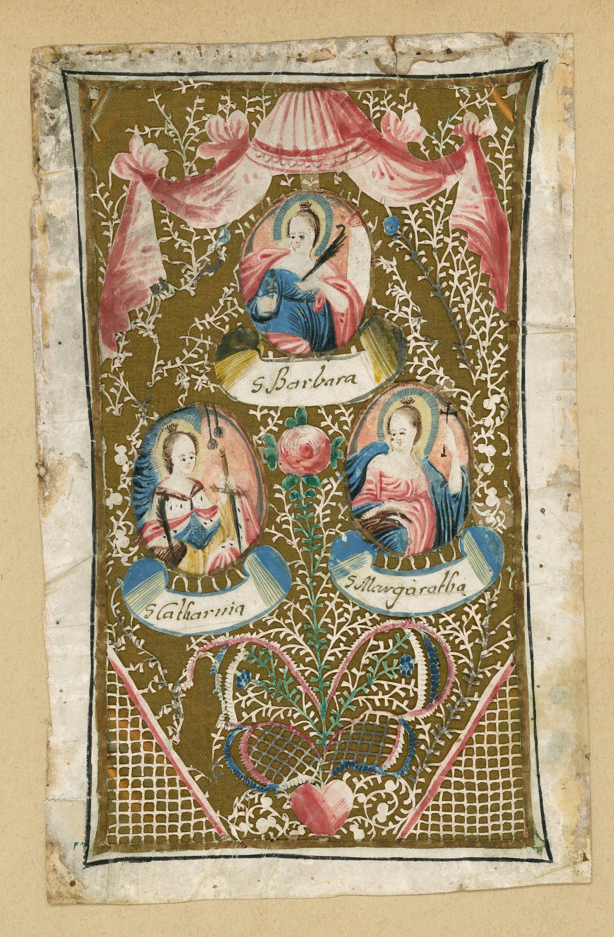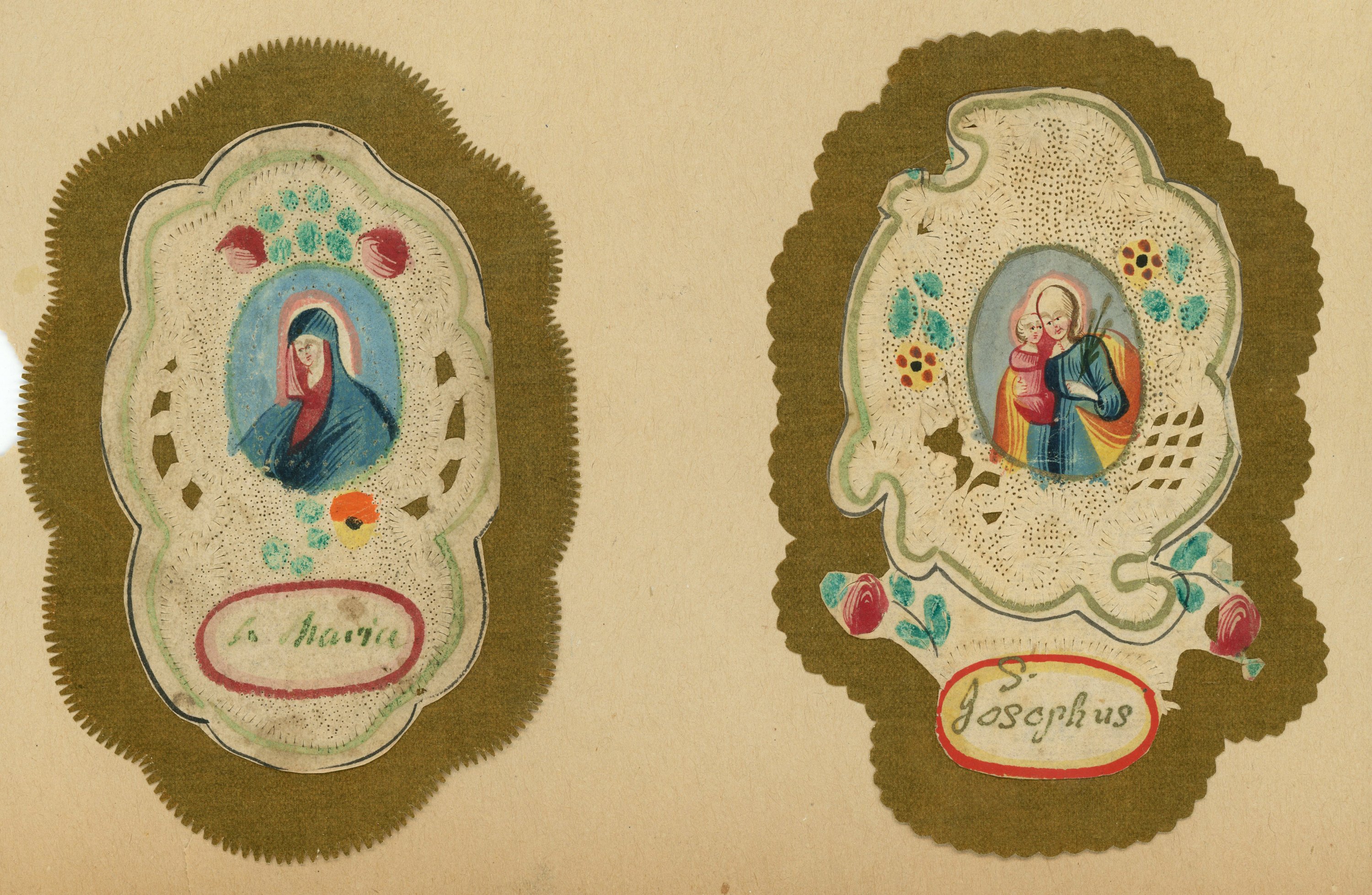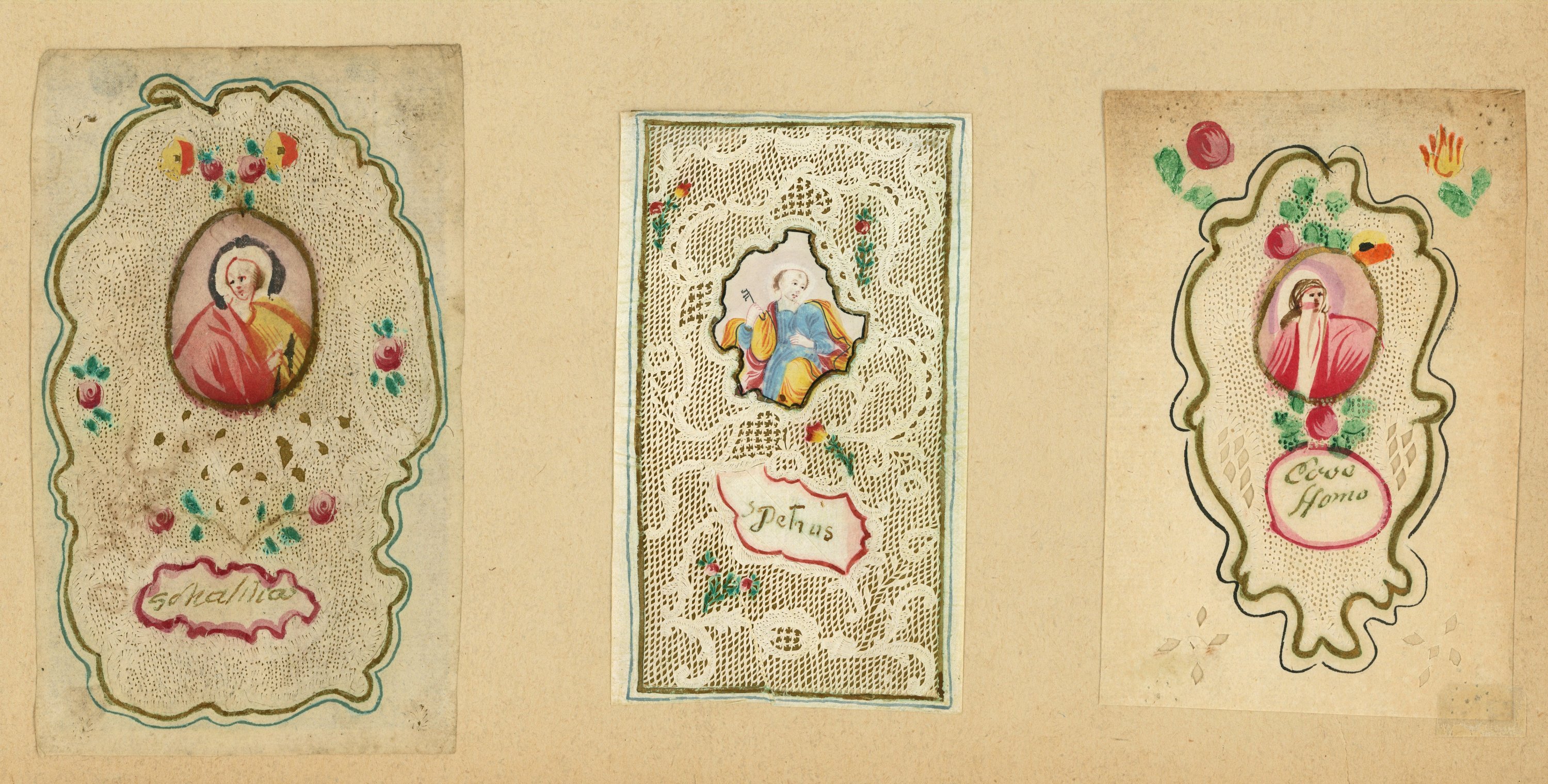 Lot de 24 canivets sur vélin et papier, formats divers, à décor plein ou à découpe de motifs géométriques et floraux, peints et légendés, ornés d'un médaillon central peint représentant des saints et des saintes, contrecollés sur papier. Etats moyen à TTB.